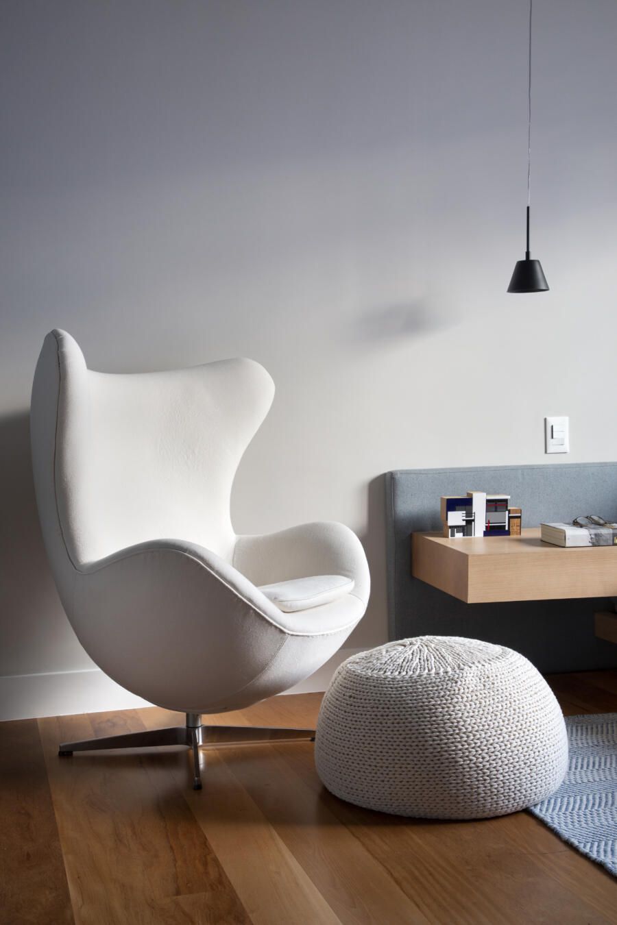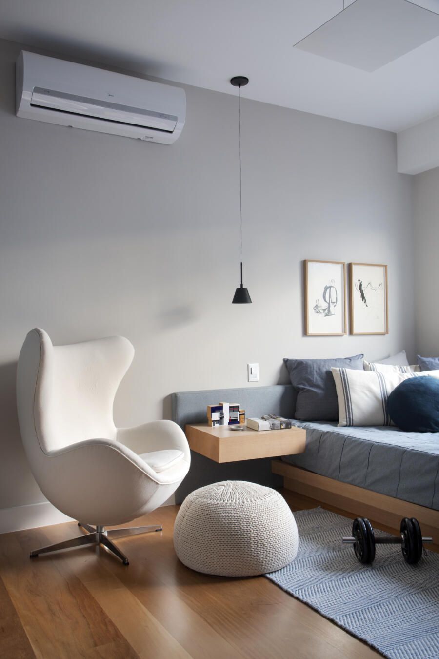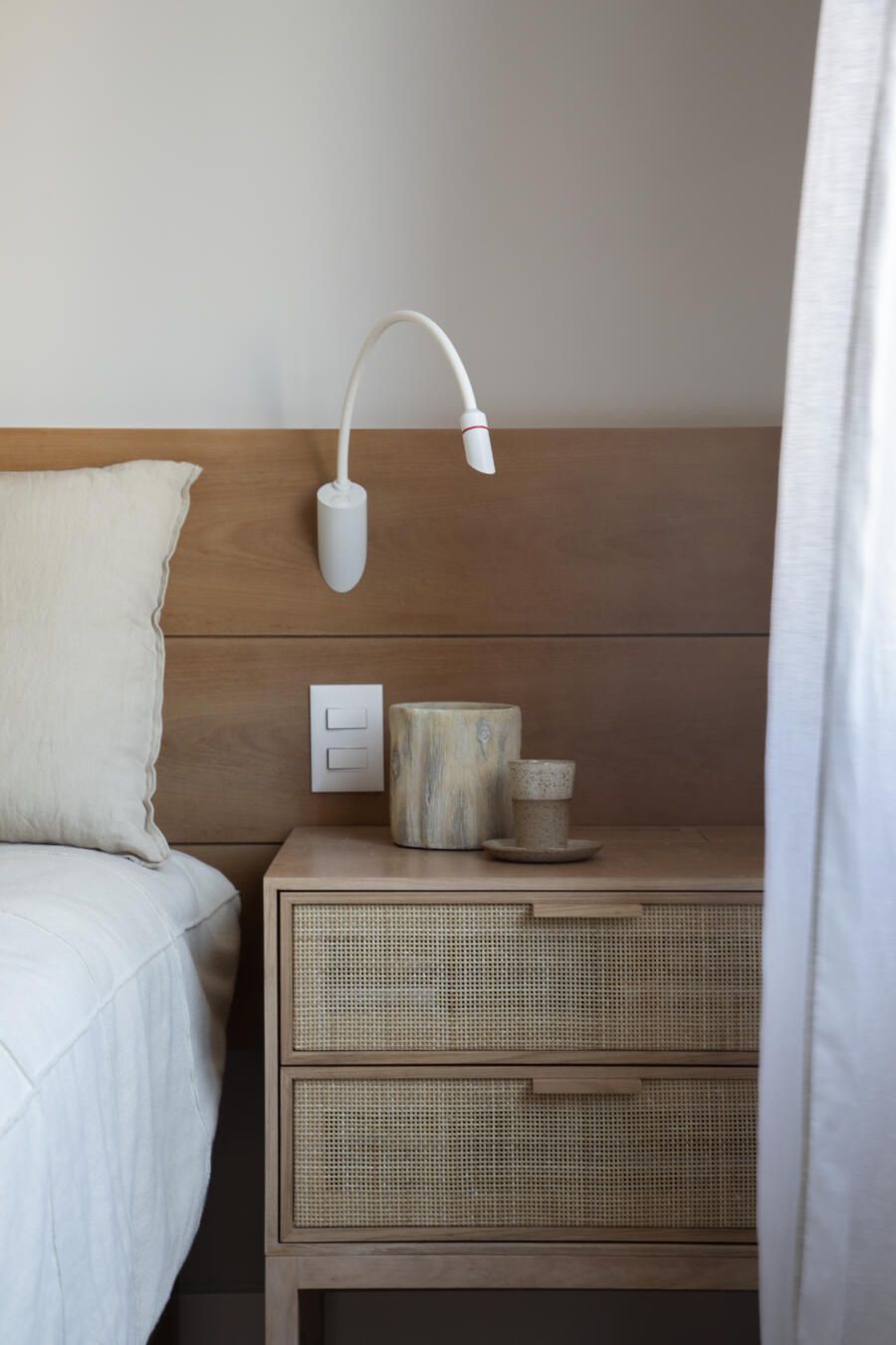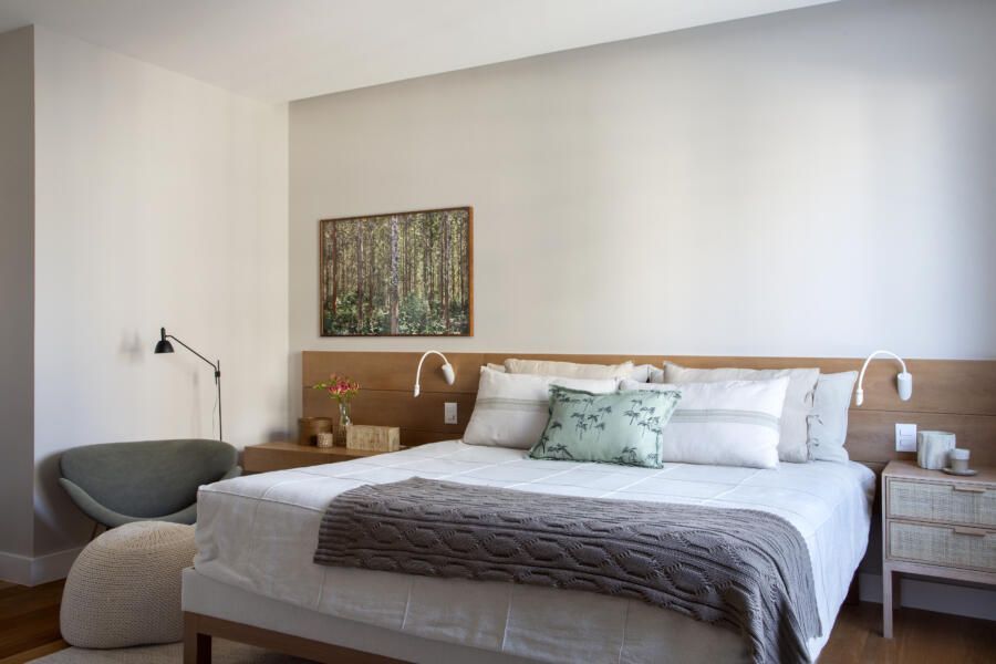 “Optamos por tons neutros e um papel de parede texturizado, que cria uma atmosfera intimista para o ambiente. A cabeceira da cama e as mesas de cabeceira foram feitas em marcenaria com acabamento em freijó lavado, desenhadas por nós.”