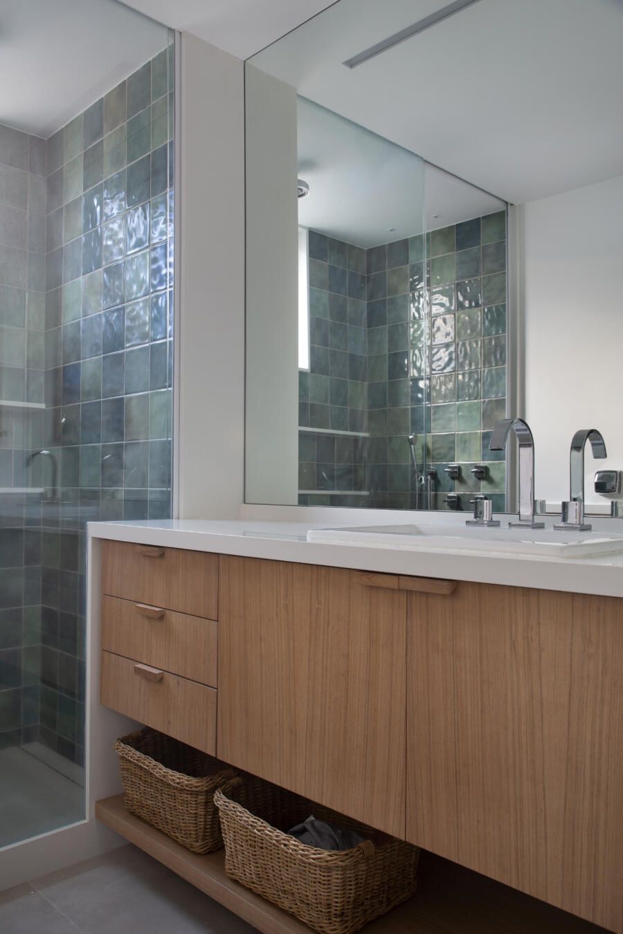 “Como eles queriam integrar os ambientes principais de convívio, priorizamos aproveitar ao máximo os espaços, garantindo ainda uma melhor circulação entre todos os ambientes. No fim, integramos os nove metros lineares de área comum, incluindo cozinha, copa, sala de estar e sala de jantar.”