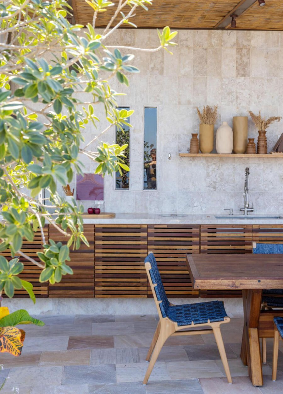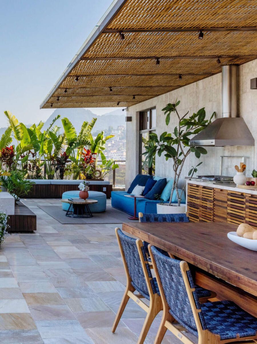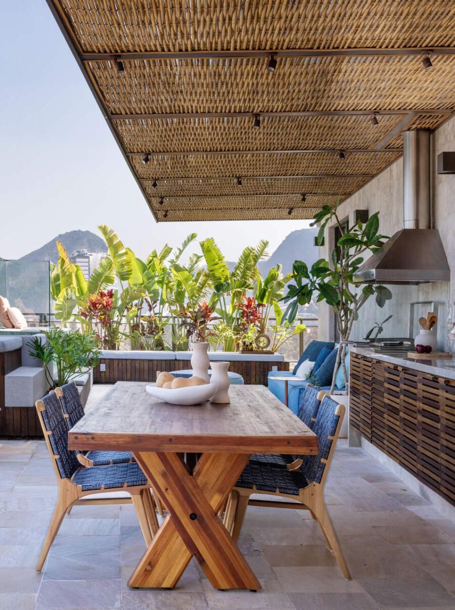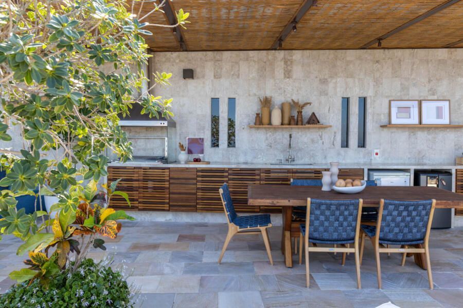 O projeto também propôs uma cobertura metálica com fibra natural trançada, piscina ladeada por bancos de marcenaria ripada e bancada gourmet com armários embutidos, todos concebidos pela equipe de arquitetura. A área agora se divide em três setores: descanso e leitura, apoio à piscina e espaço gourmet com mesa ampla para refeições.