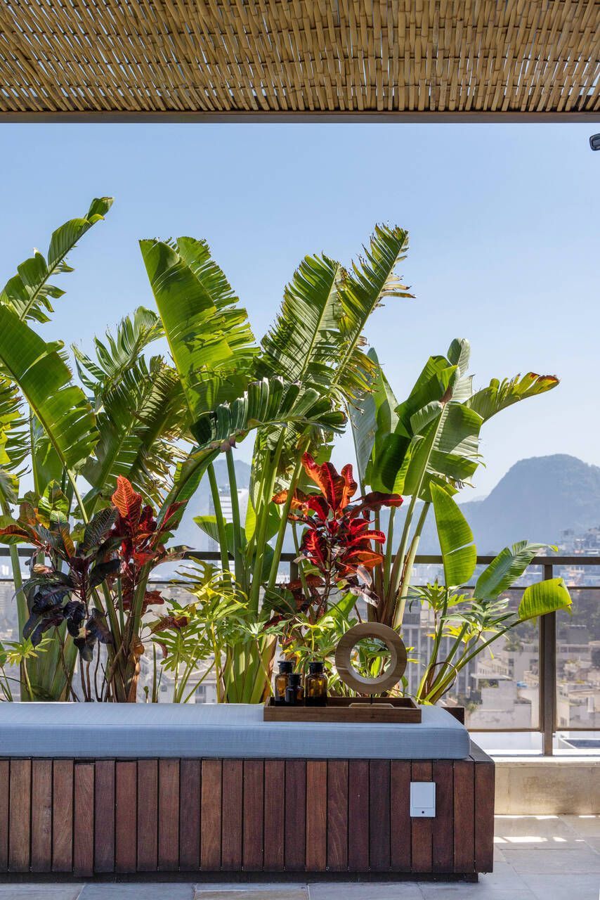 Para isso, jardineiras em madeira cumaru foram distribuídas para proporcionar acolhimento e frescor ao ambiente. Entre as espécies escolhidas, as Ravenala madagascariensis formam um fundo verde imponente na área de estar, acompanhadas pela Cordyline fruticosa, que adiciona um toque rosa vibrante. Na área da piscina, filodendros criam uma moldura natural, enquanto Strelitzia augusta e mais Ravenala garantem privacidade em relação às construções vizinhas. O croton (Codiaeum variegatum) traz a cor vermelha intensa solicitada pelas clientes.