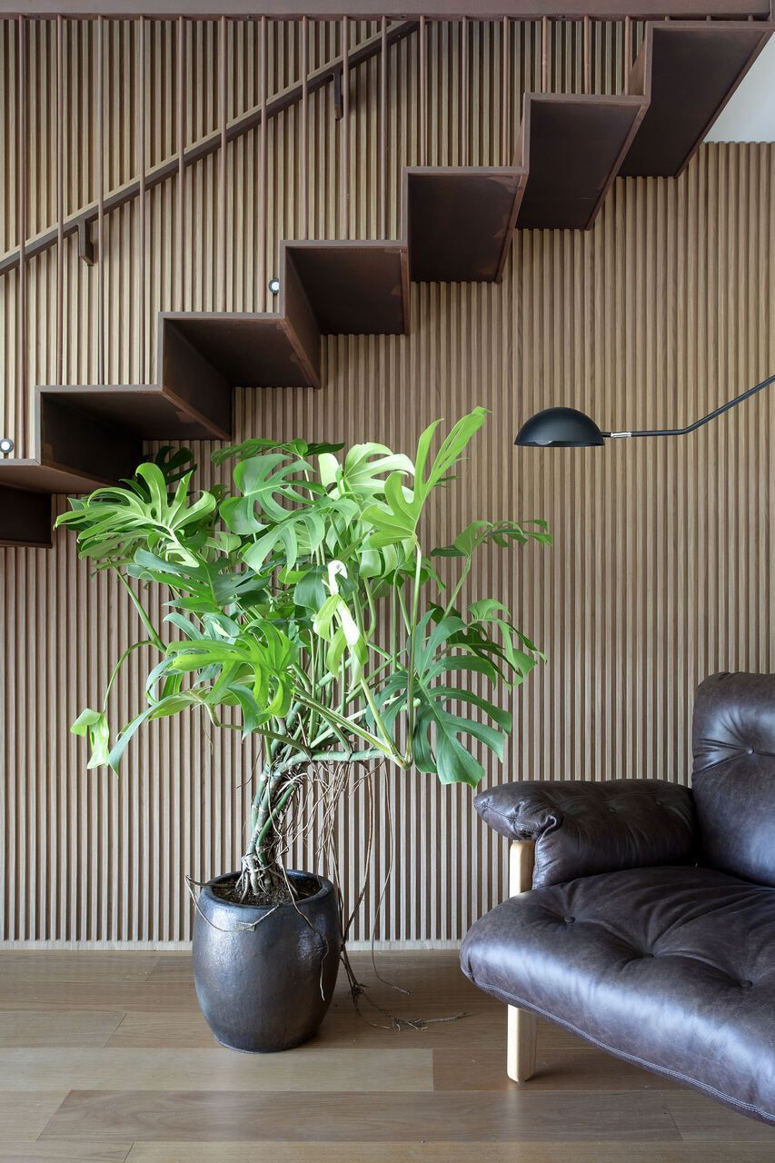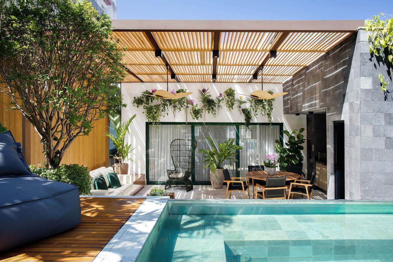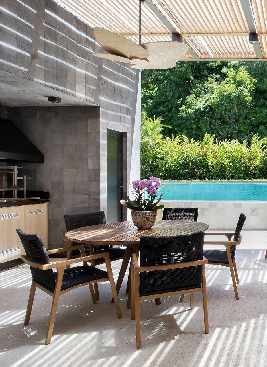 De modo geral, o paisagismo está presente não só na área externa de 120m², ao redor piscina, como também na varanda da academia onde fica uma parte da horta plantada em vasos, e em alguns ambientes internos, como as salas dos dois pavimentos e o escritório.