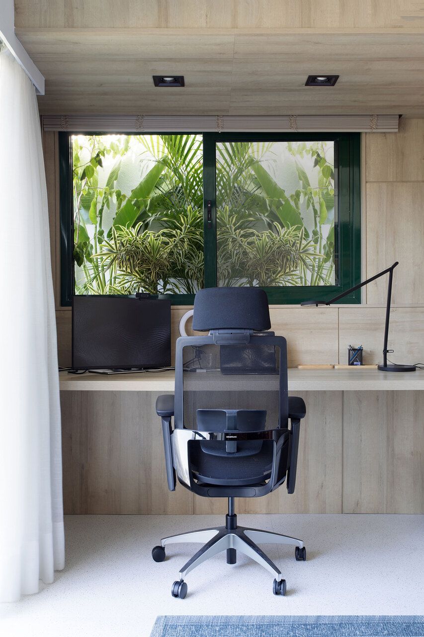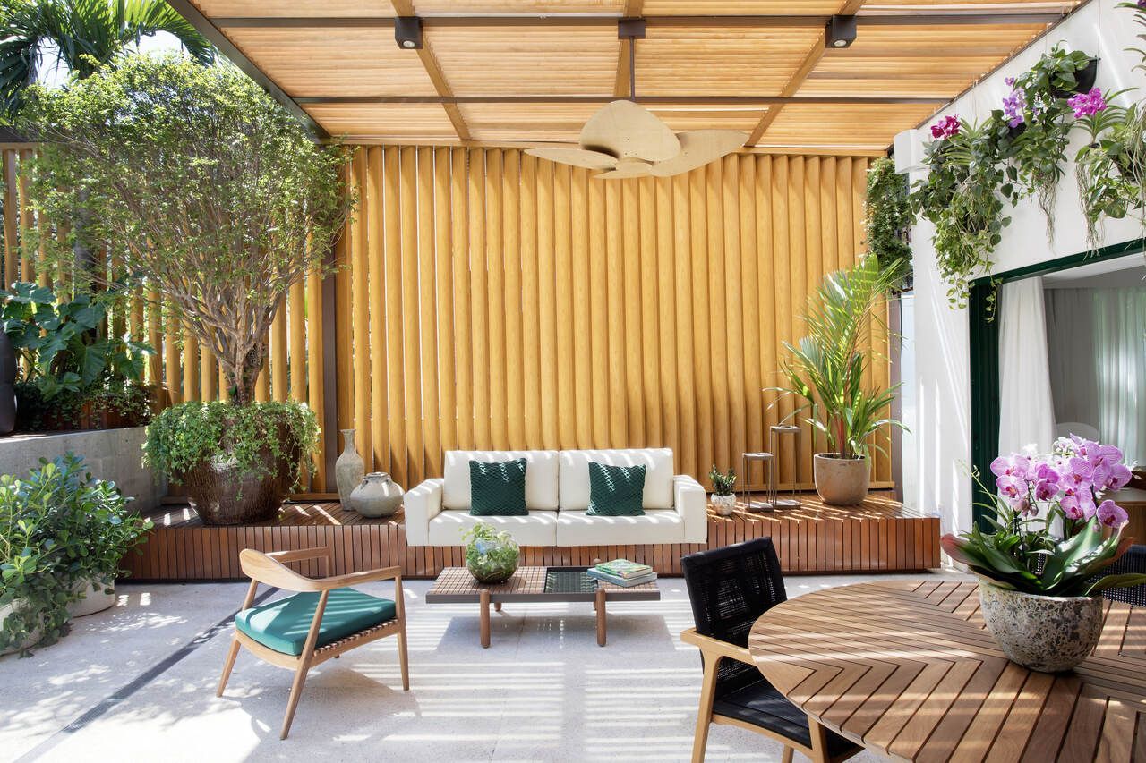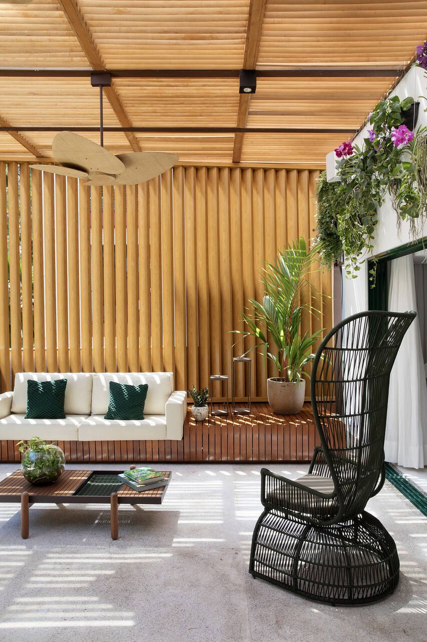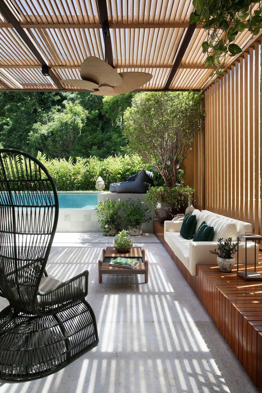 De modo geral, o paisagismo está presente não só na área externa de 120m², ao redor piscina, como também na varanda da academia onde fica uma parte da horta plantada em vasos, e em alguns ambientes internos, como as salas dos dois pavimentos e o escritório.