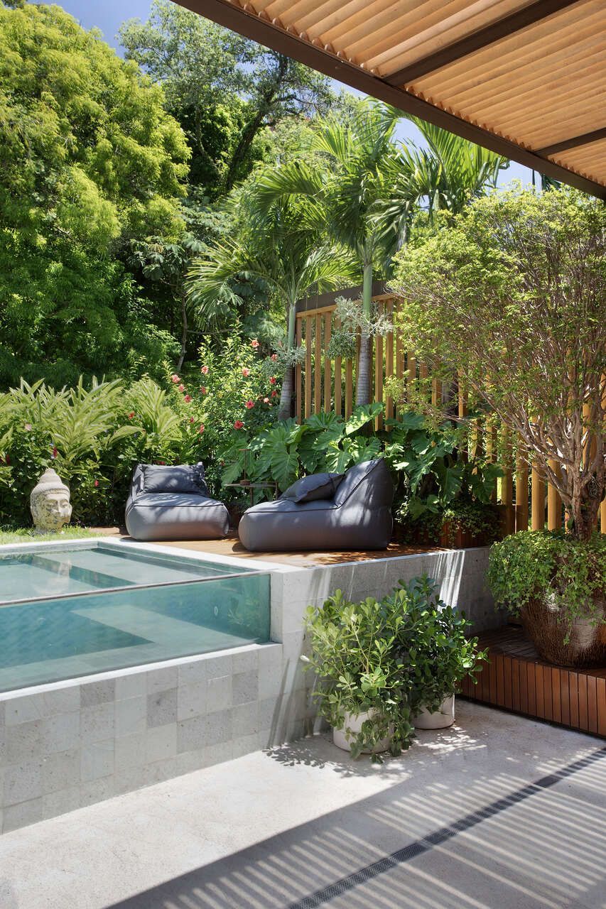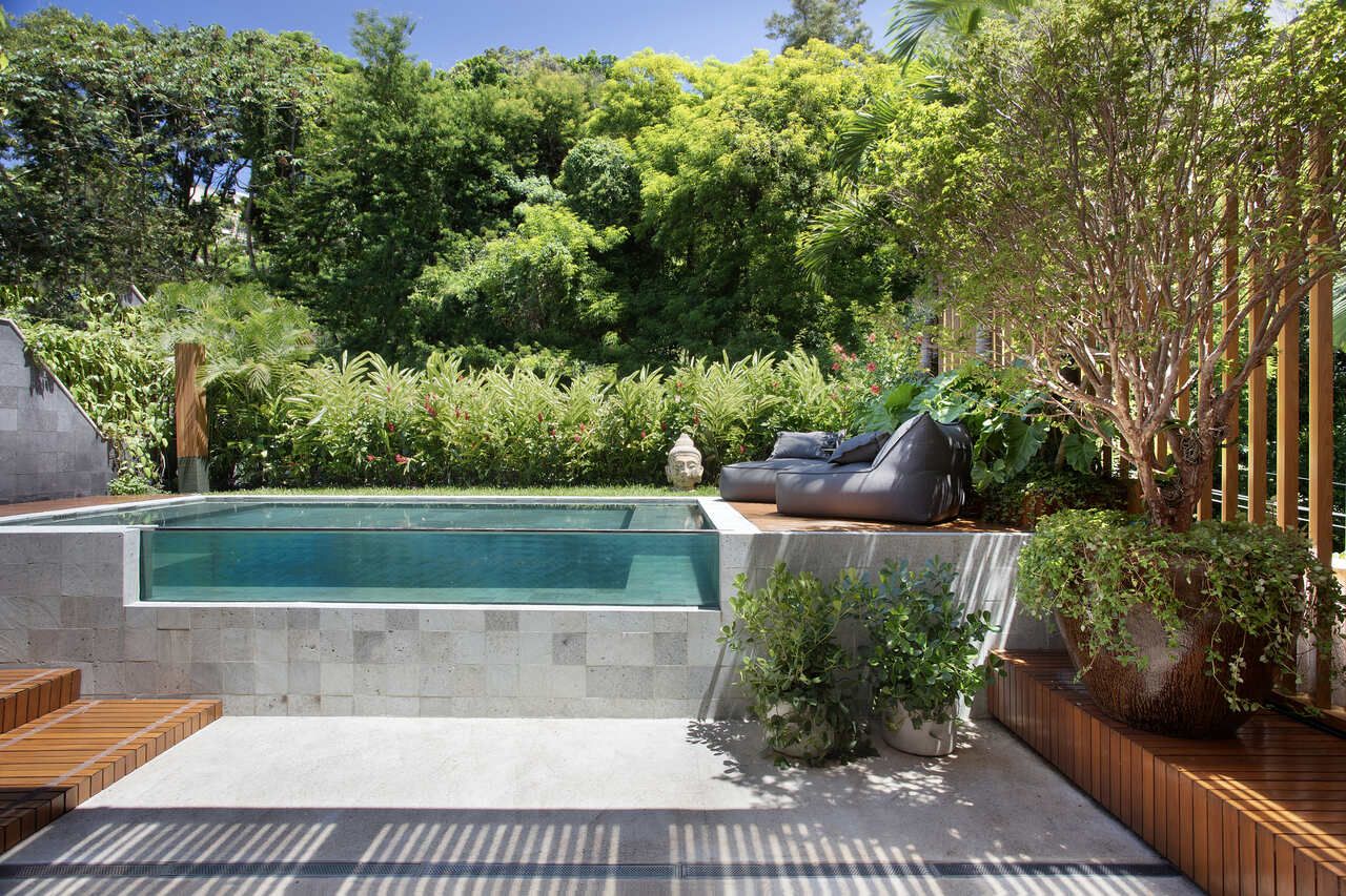 A arquiteta paisagista Maira Duarte, do escritório Horto Girassol, foi contratada pelo casal de proprietários desta cobertura duplex de 425m2, no Alto Leblon, Rio de Janeiro, quando o projeto de interiores, assinado pelos arquitetos Arthur Falcão e Alessandro Sartore, estava na fase de finalização. Segundo Maira, o conceito do projeto buscou criar um paisagismo de estilo tropical através de muitas texturas, folhagens largas e densas.