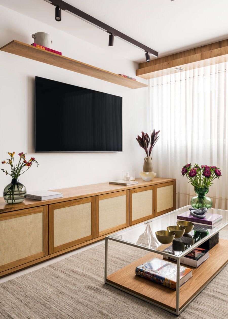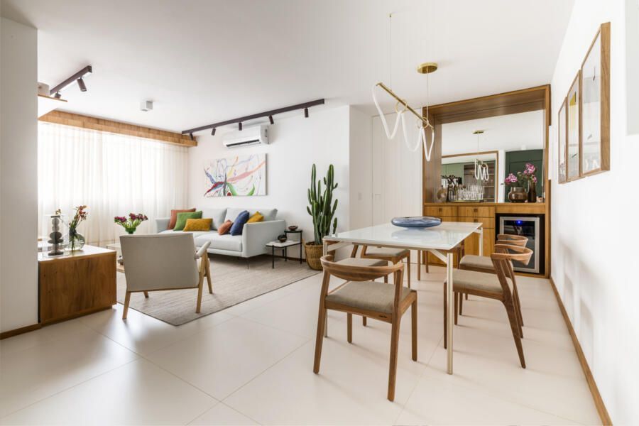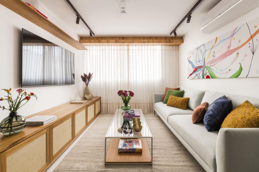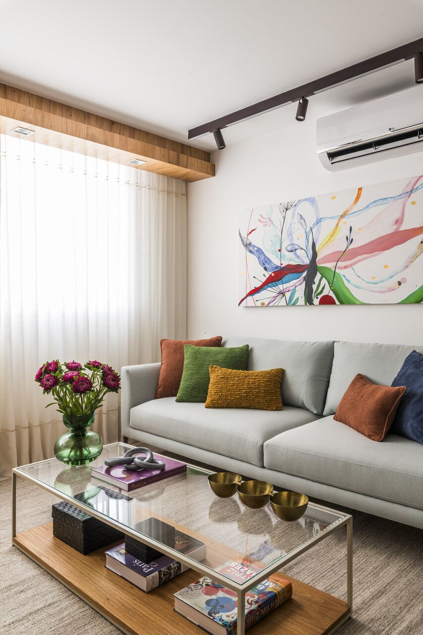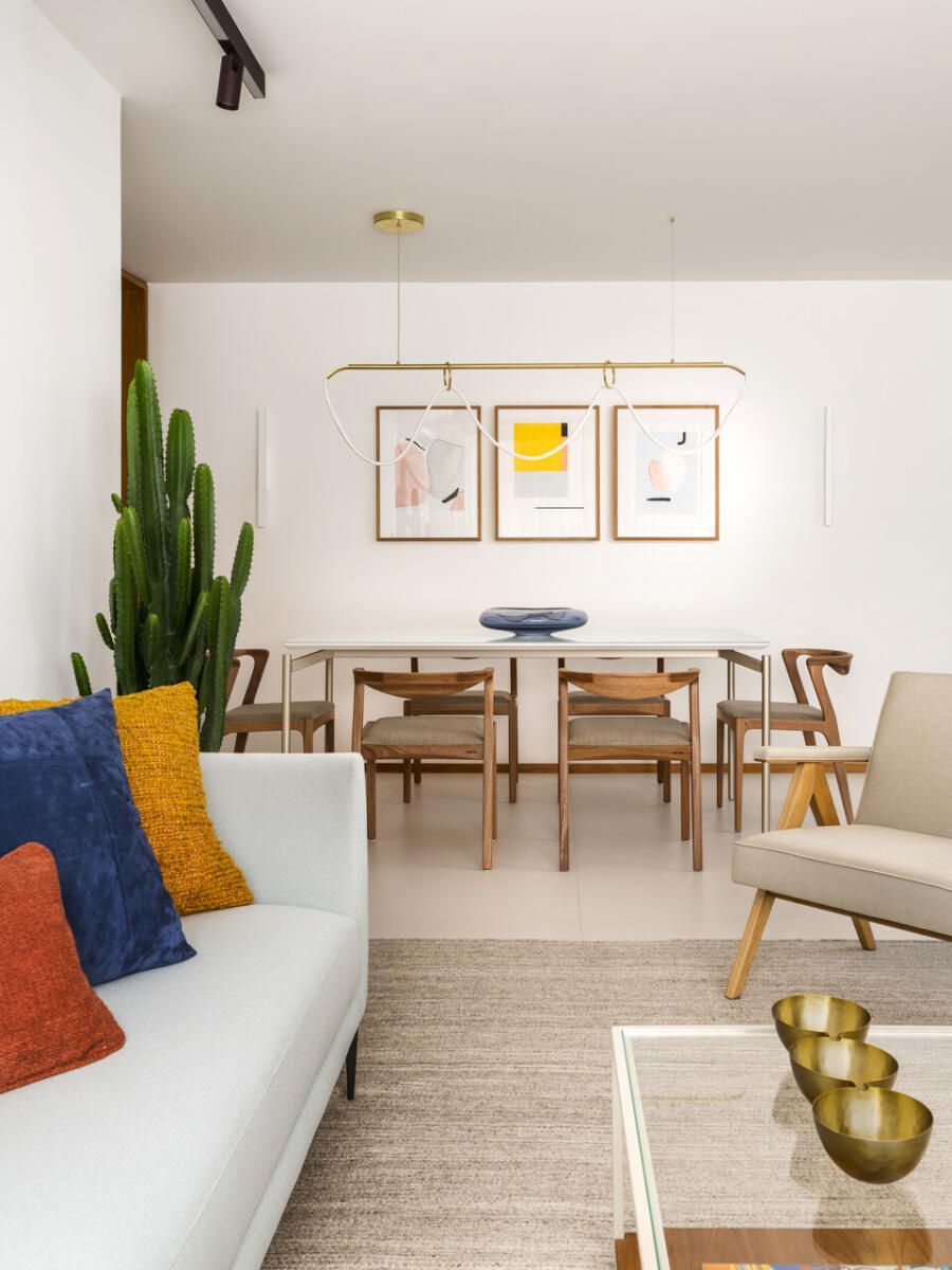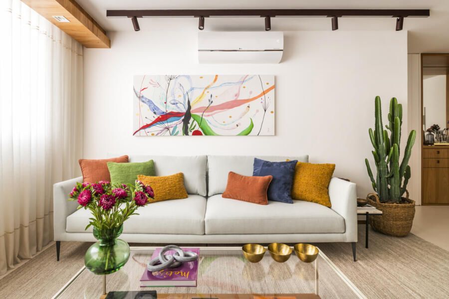 O ambiente atemporal e contemporâneo tem uma paleta de cores neutra, evidenciando a cor pontualmente nos objetos, como os quadros e almofadas.