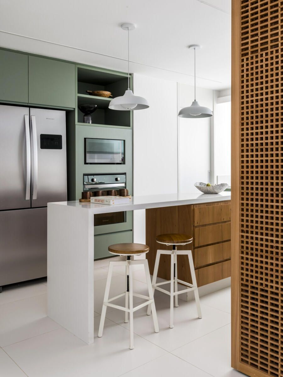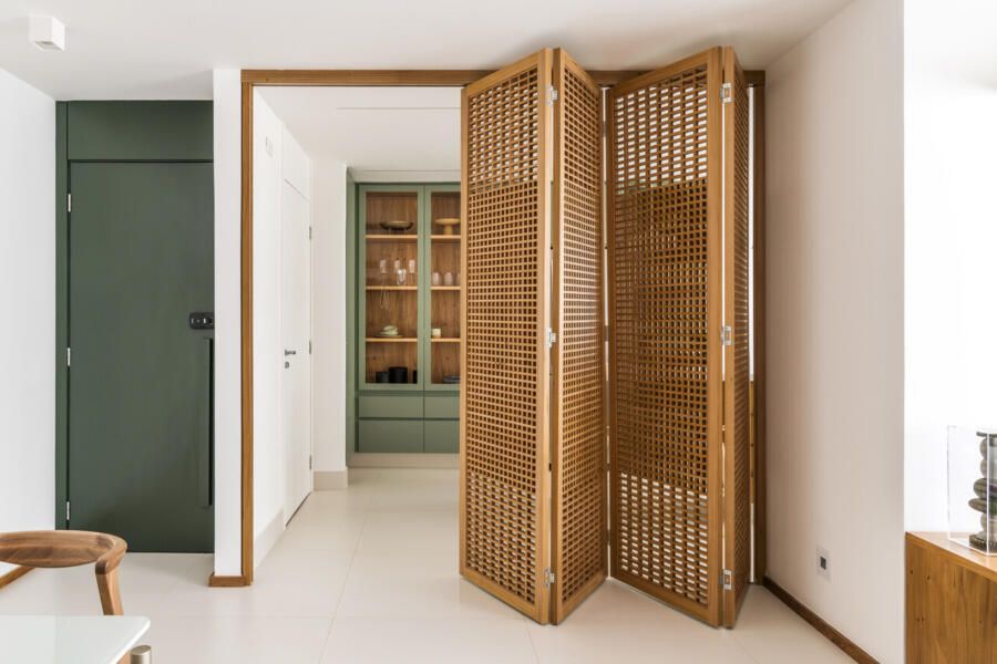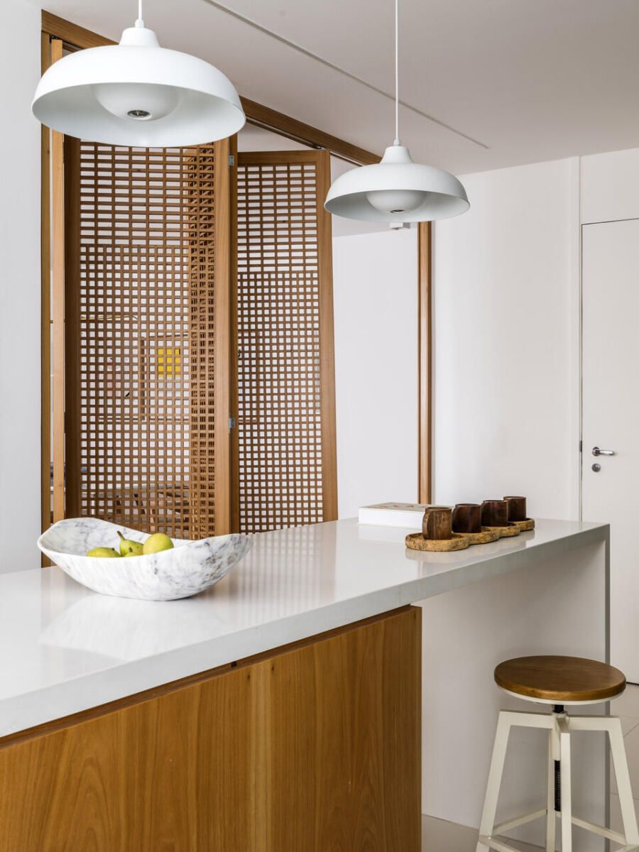 Houve mudanças na planta original, algumas paredes foram demolidas para ampliação e adequação dos espaços. A mais significativa foi a retirada do quarto de hóspedes e a diminuição da lavanderia, ampliando o espaço da cozinha, que ganhou uma ilha central. A cor se faz presente na marcenaria dos móveis e o destaque é porta em muxarabi que faz a integração com sala de jantar.