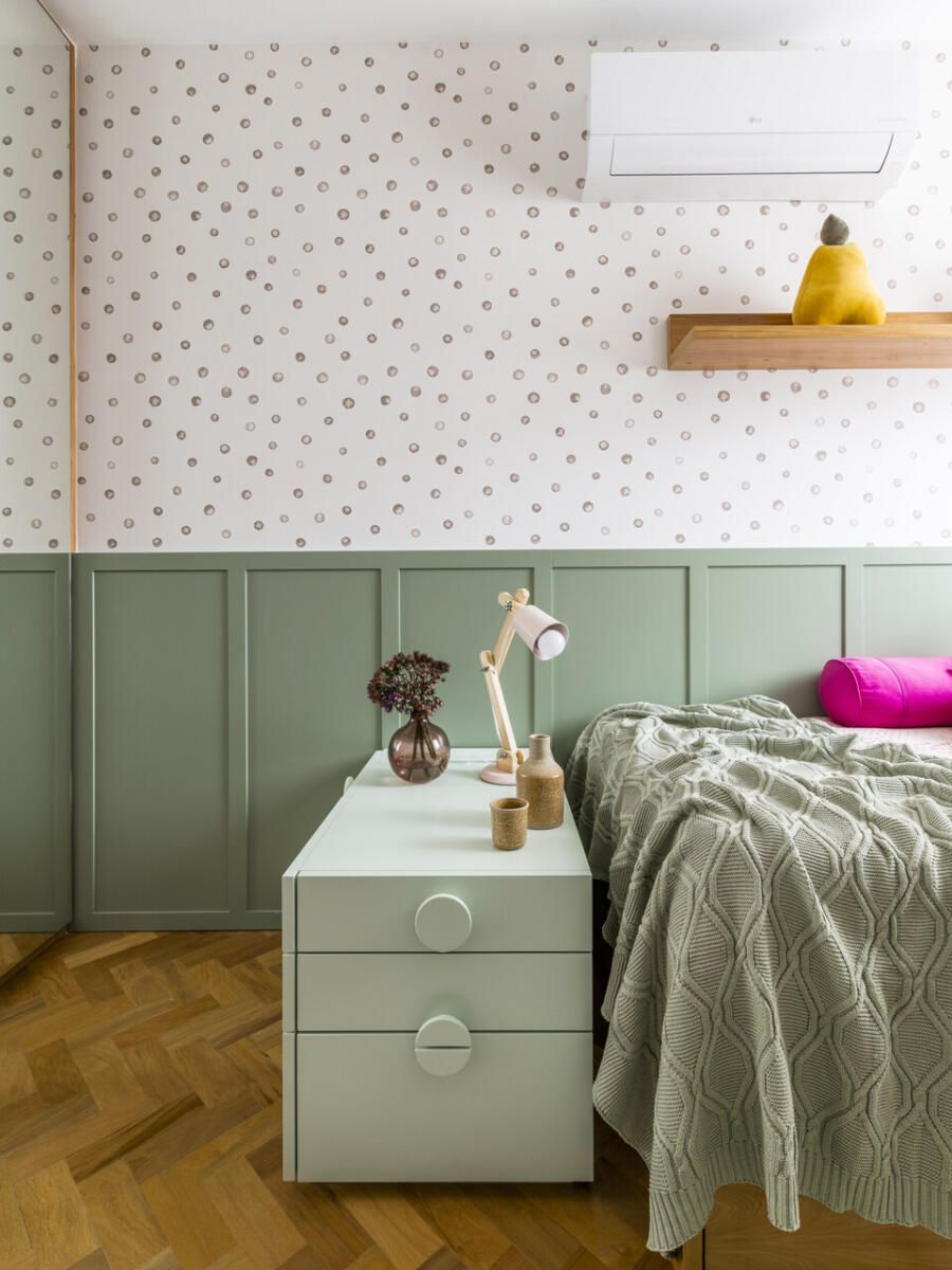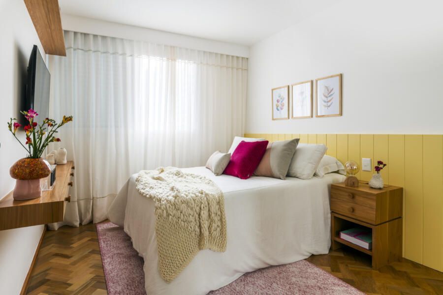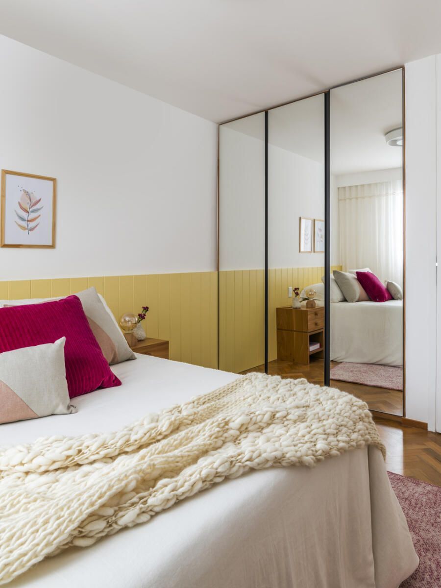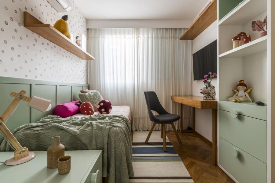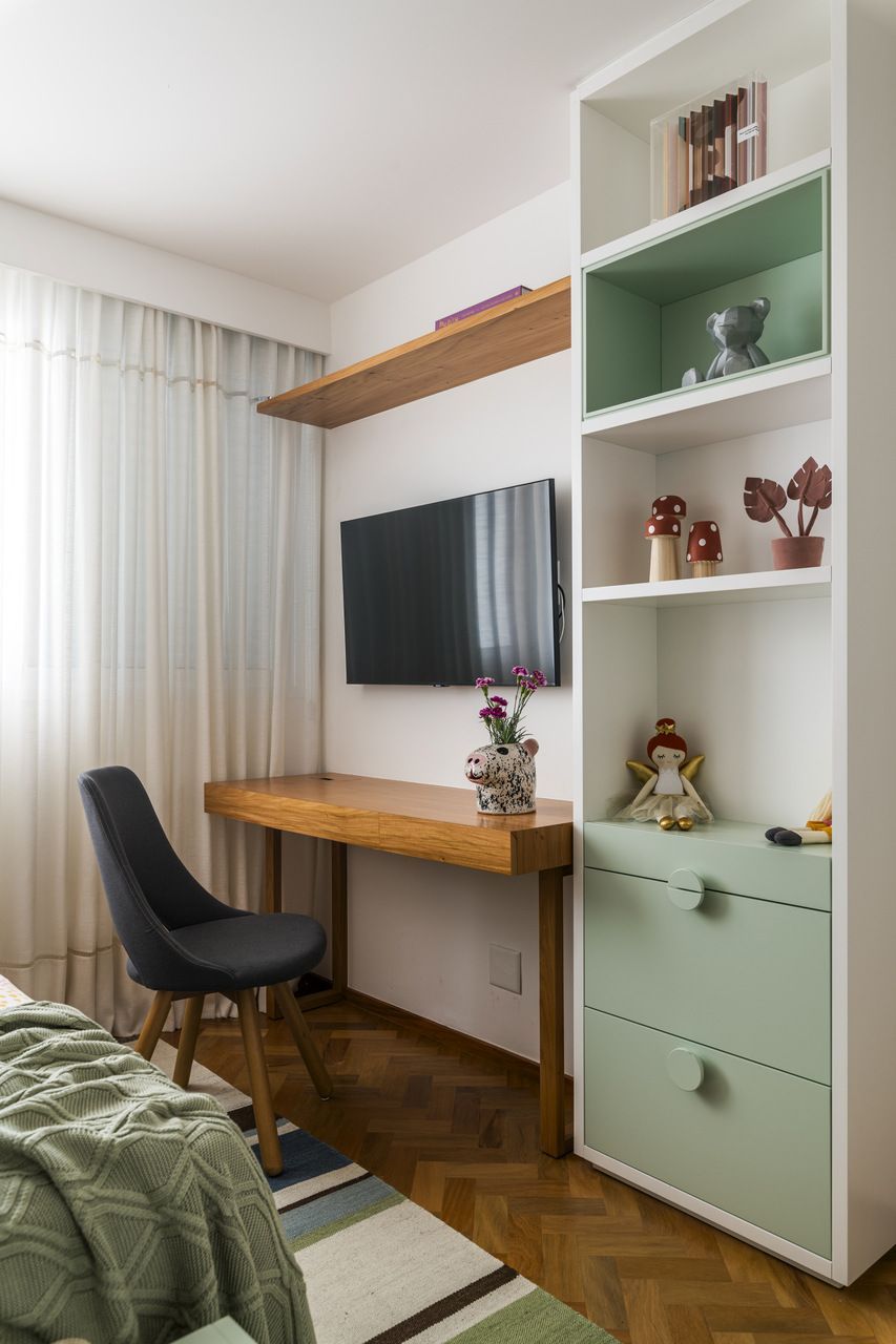 No quarto da filha menor, de dois anos, foi criado um painel verde em toda a extensão da parede. A ideia é que a cama seja usada como um sofá e o painel usado como cabeceira. Em frente há uma escrivaninha para que, hoje, ela possa desenhar e, no futuro, comece a ler e escrever. Já o quarto da filha mais velha, de dez anos, tem uma cabeceira em lambri, em laca amarela e armários com portas de espelho, um pedido dela.