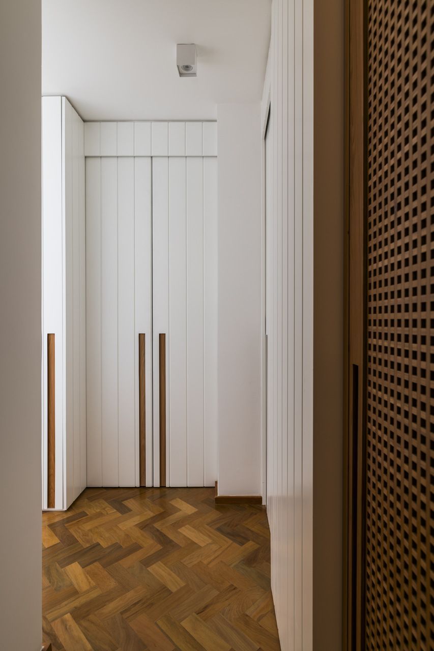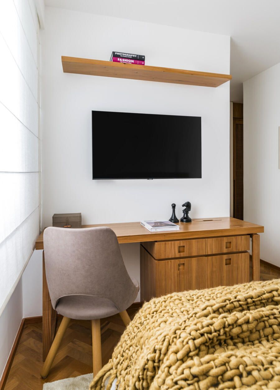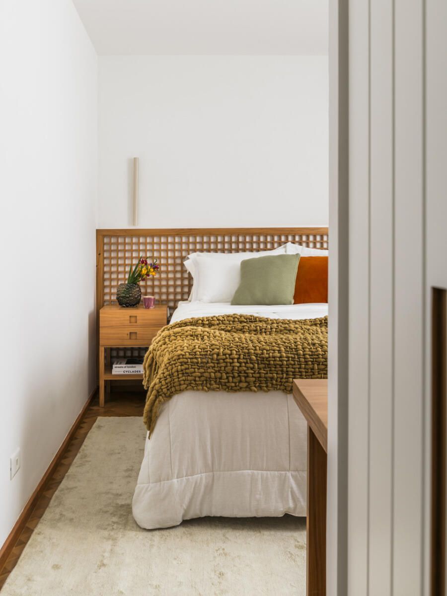 A suíte do casal tem armários em marcenaria na cor branca, estratégia usada pela arquiteta para evidenciar a cabeceira em muxarabi e o piso em madeira. O closet é a extensão desta mesma marcenaria no branco e amadeirado.