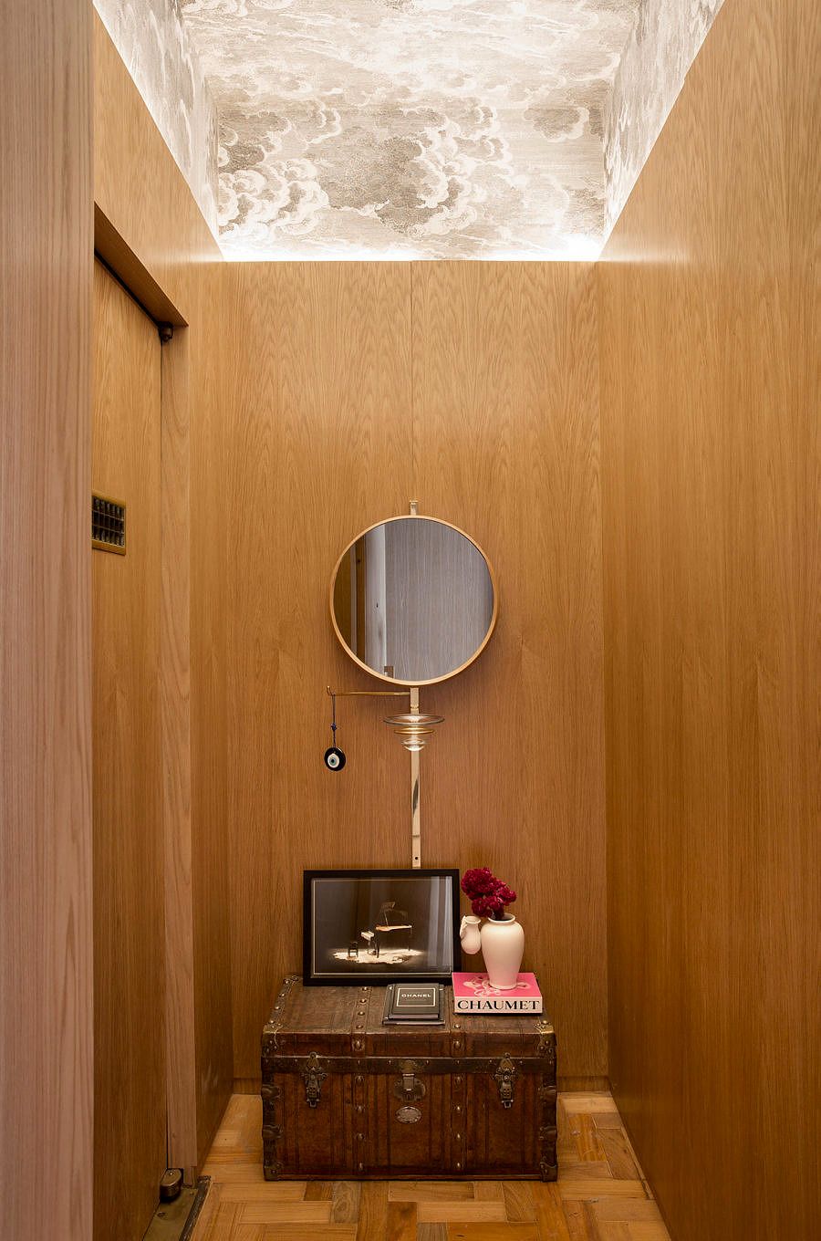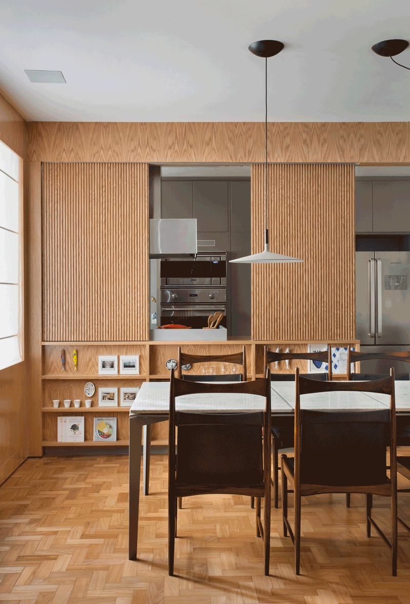 Na sala de jantar, o grande armário-louceiro com portas ripadas, também em carvalho natural, ganhou um nicho que serve de bar. Painéis da mesma madeira revestem as paredes e o teto do hall de entrada do apartamento, que também interliga as salas de estar e jantar e dá acesso aos quartos.