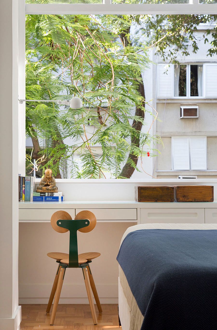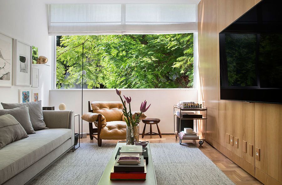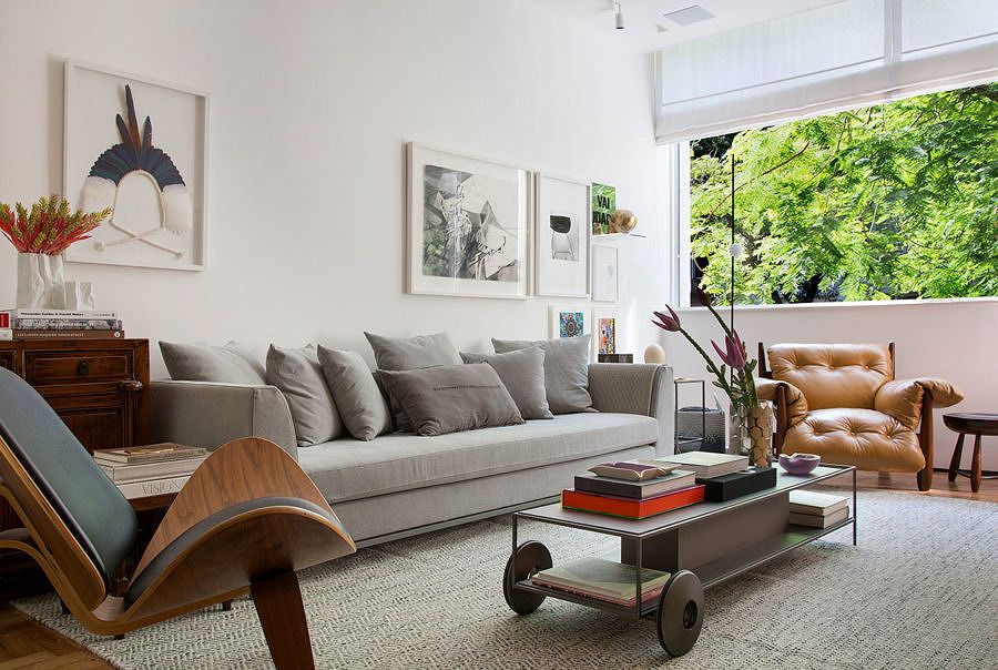 Quase todo o mobiliário é de design brasileiro assinado e foi comprado especialmente para a nova morada. Com estrutura em jacarandá, os móveis foram arrematados em um leilão pela arquiteta, que aproveitou para realizar um velho sonho de consumo: ter uma poltrona Mole na sala de estar.