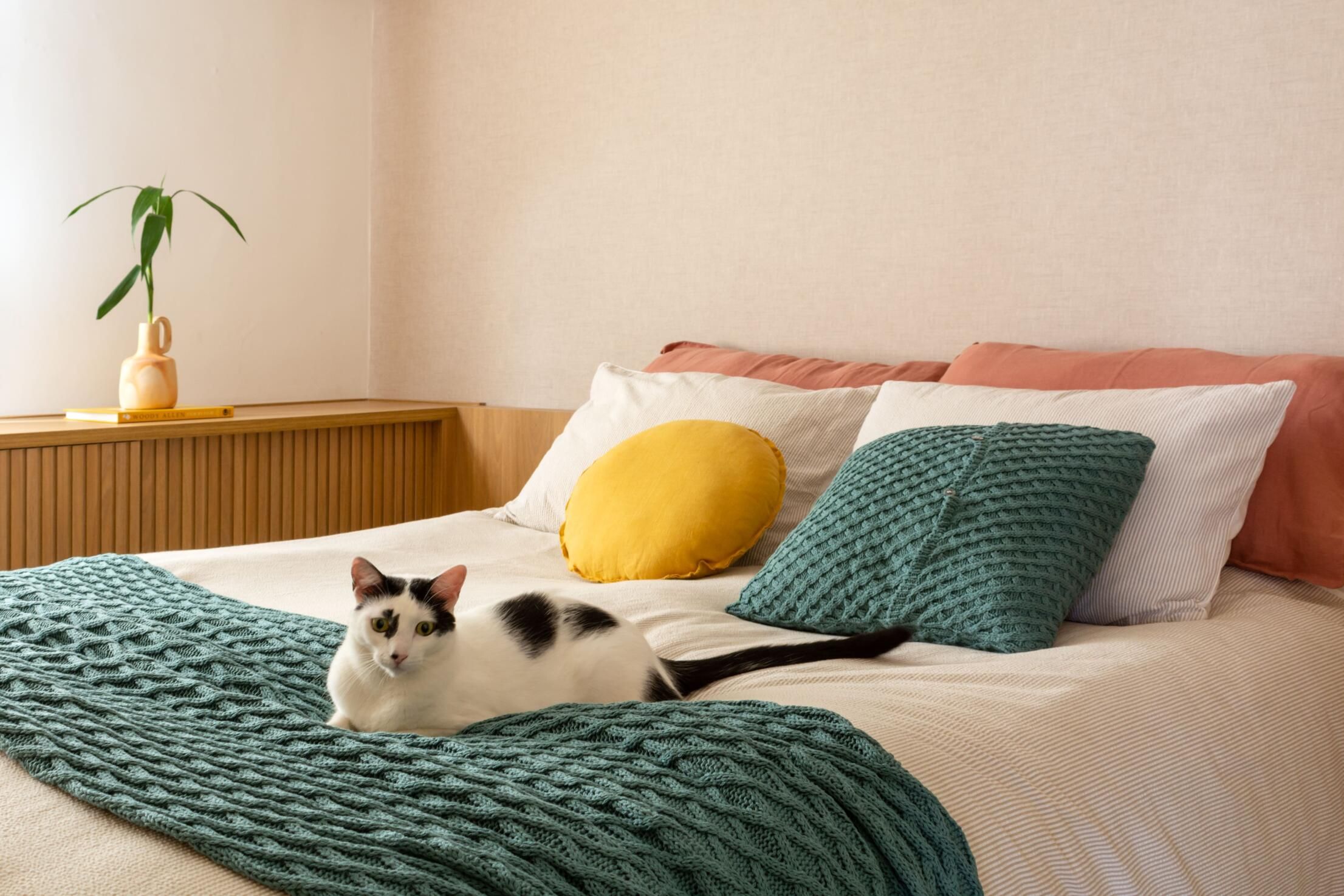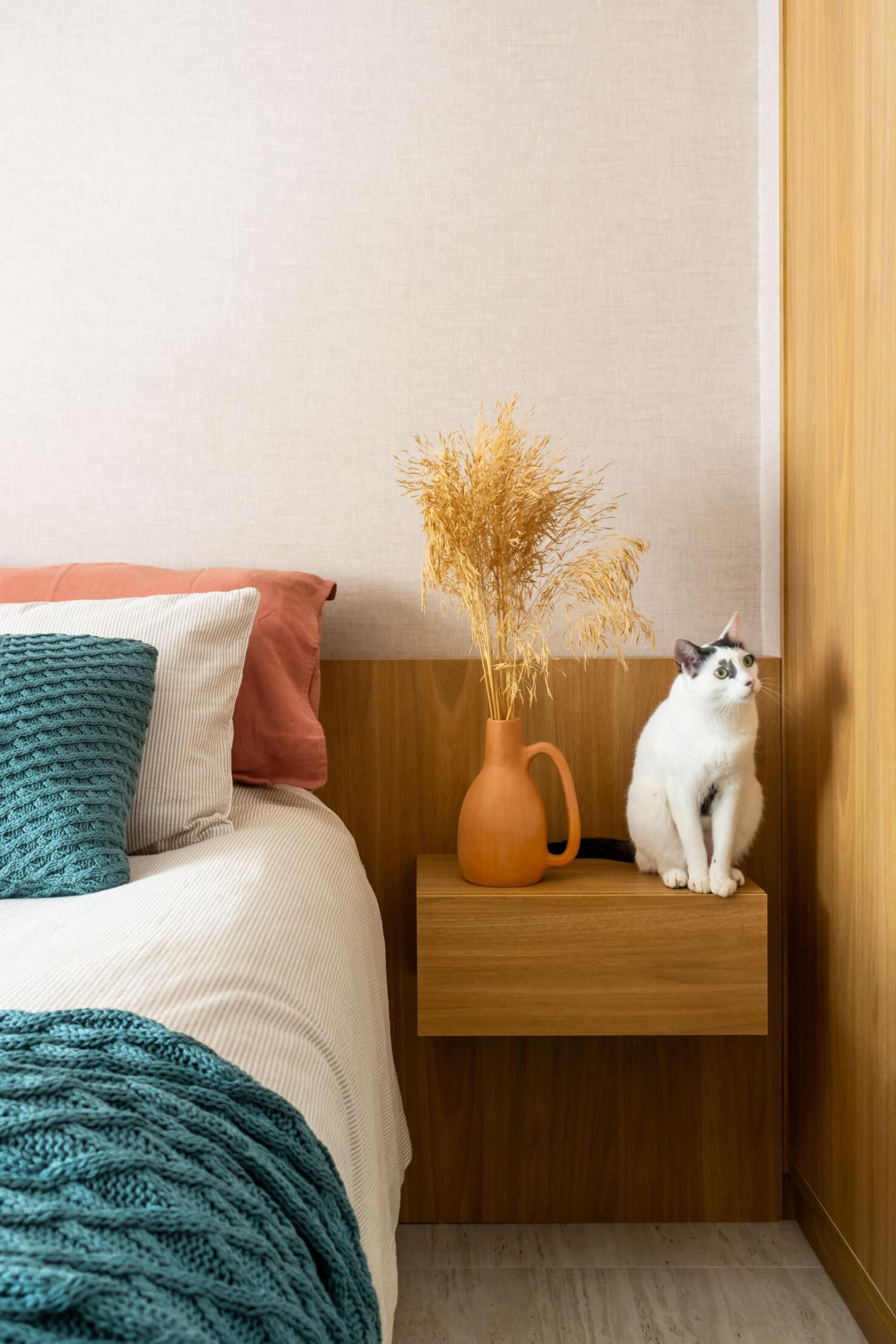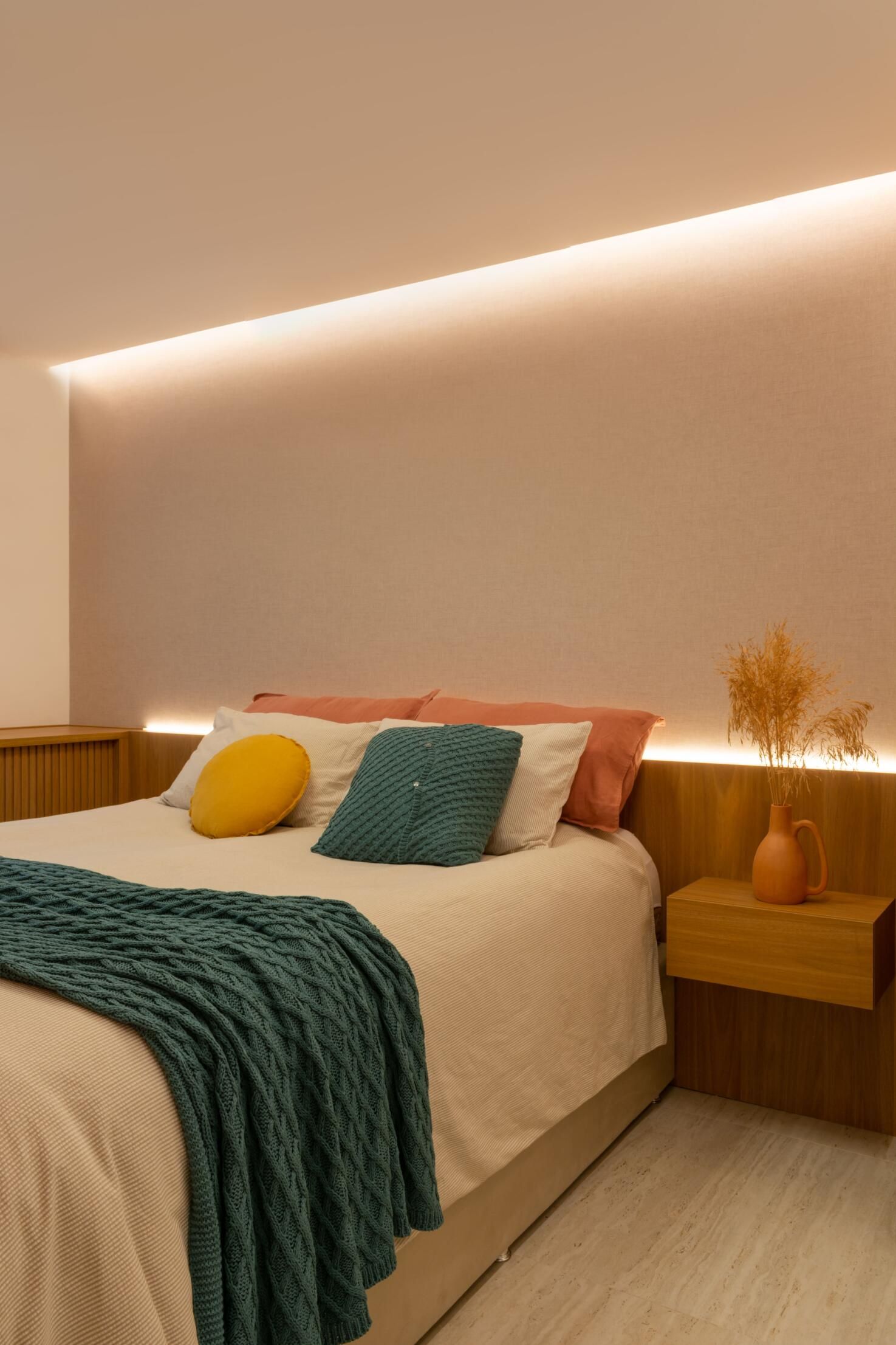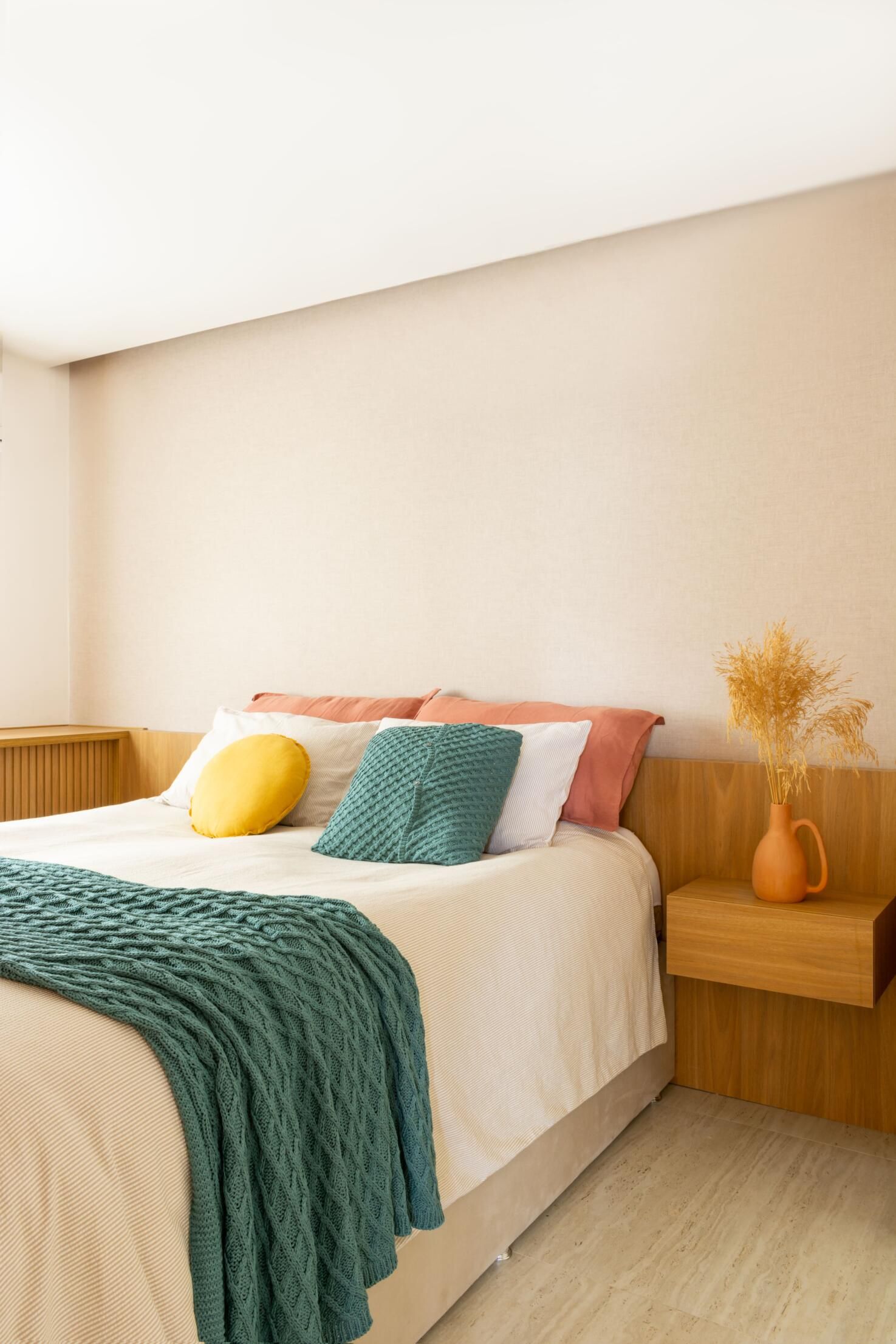 Outra grande modificação do apê foi na suíte do casal. Onde antes tinha um grande closet, foi colocada uma porta para o corredor, transformando o espaço em escritório. Assim, a metragem do quarto ficou um pouco menor, mas ganhou uma marcenaria aconchegante e funcional.