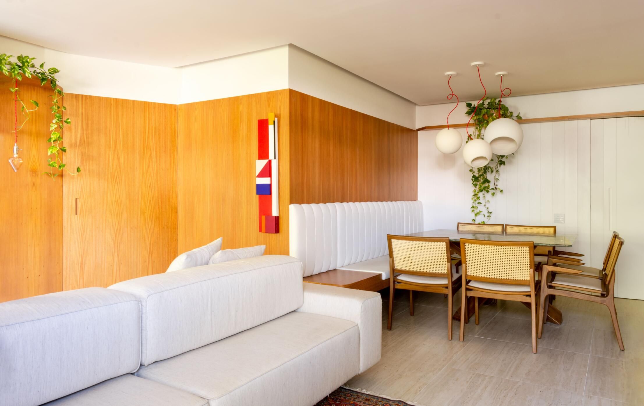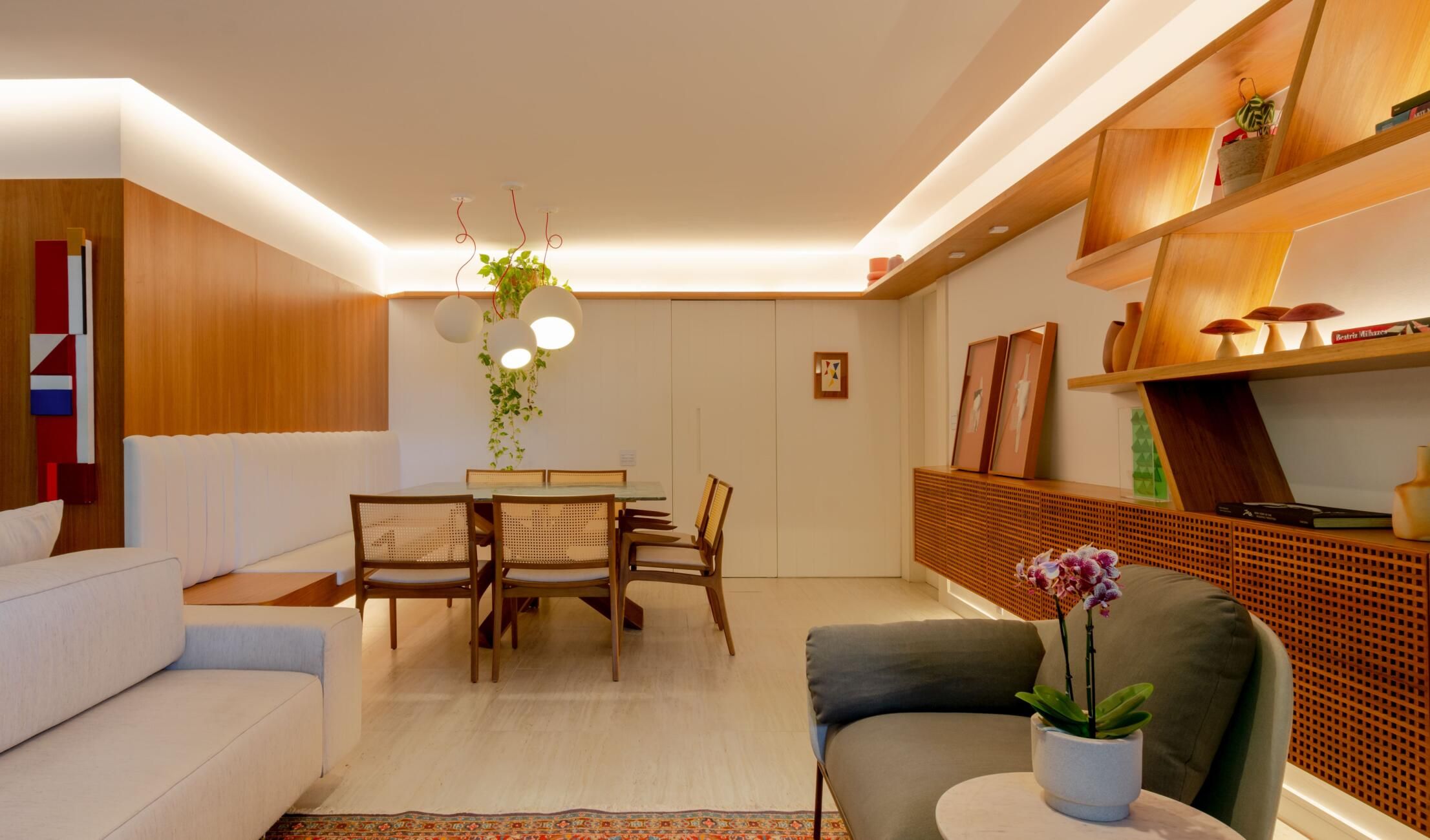 A madeira, ora pintada de branco, ora em seu estado natural, contrasta com o piso em travertino e é o fio condutor deste projeto. Lambris, painéis que servem de suporte para tv e uma grande estante foram milimetricamente desenhados.