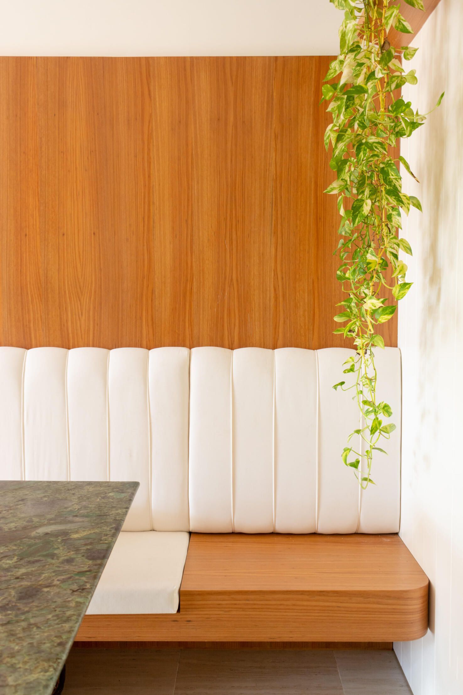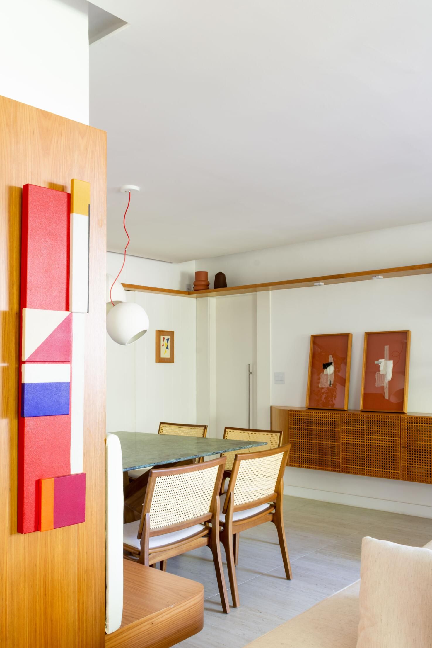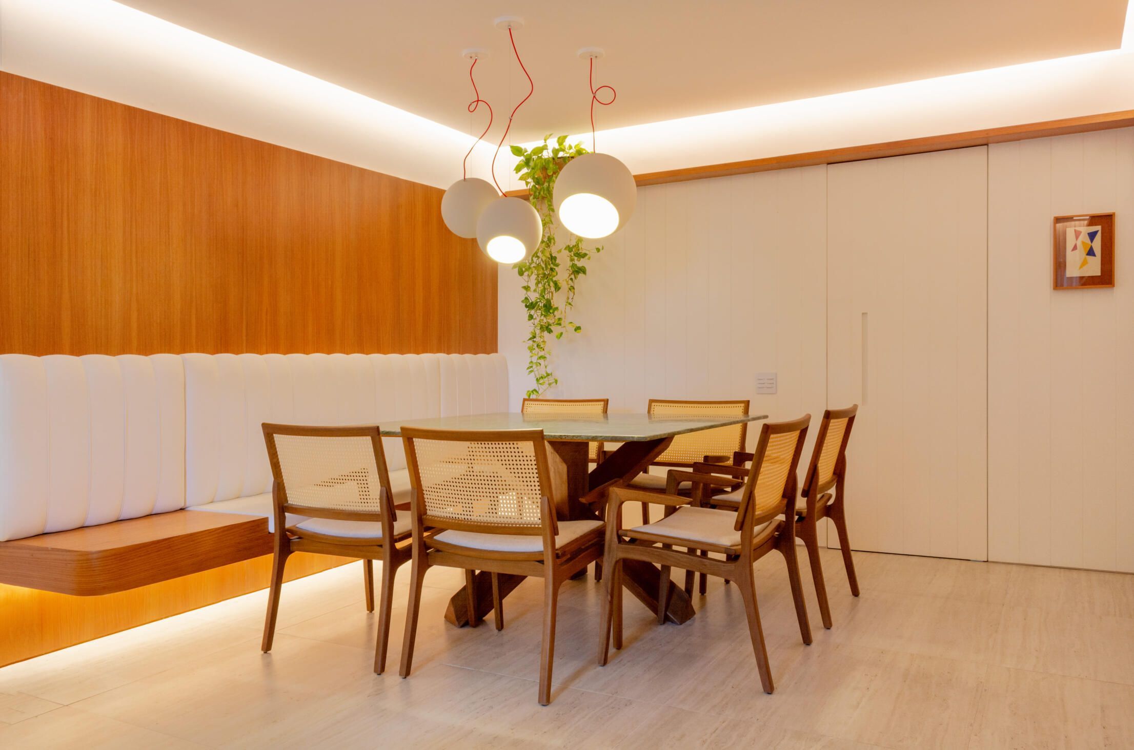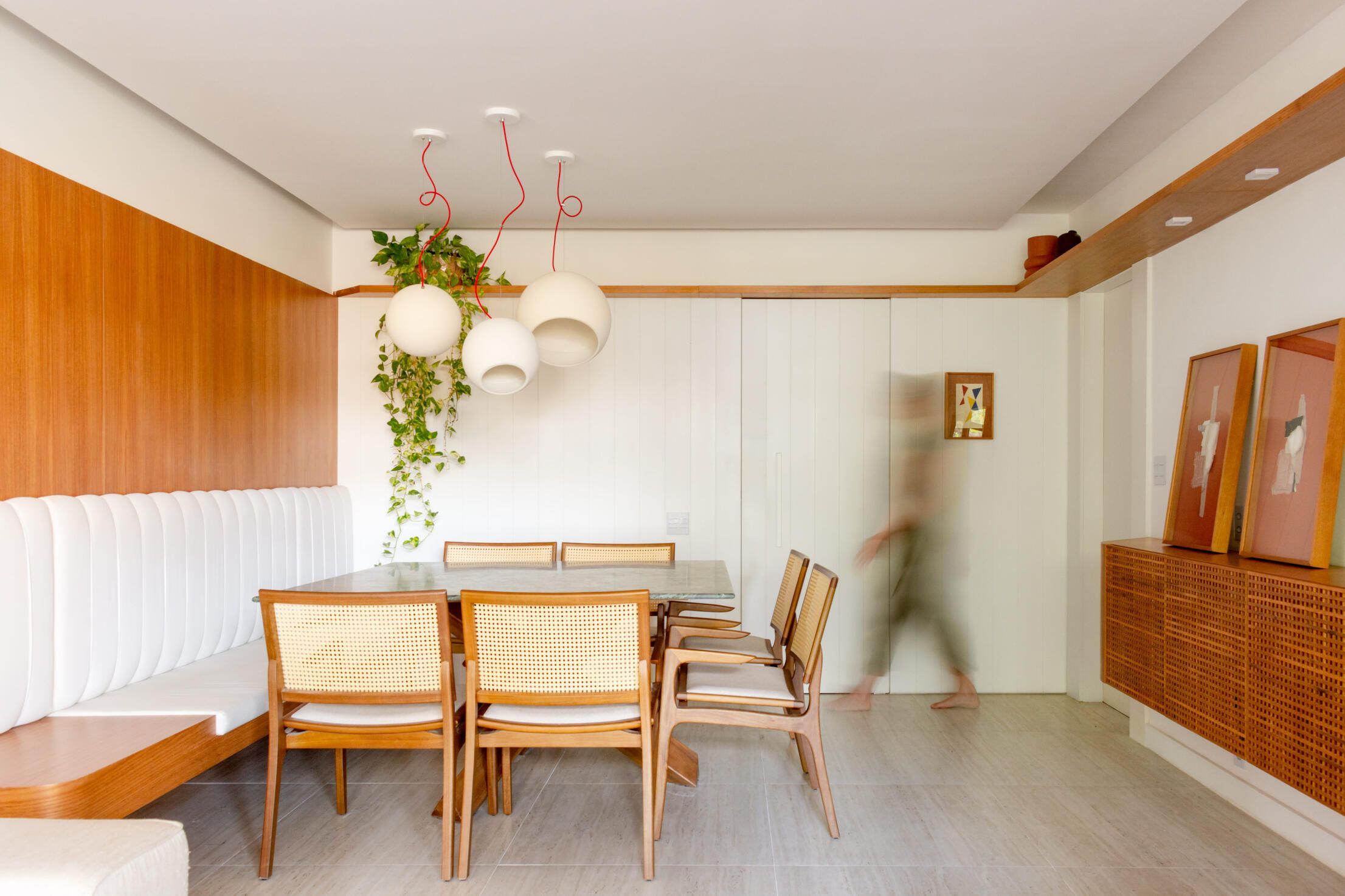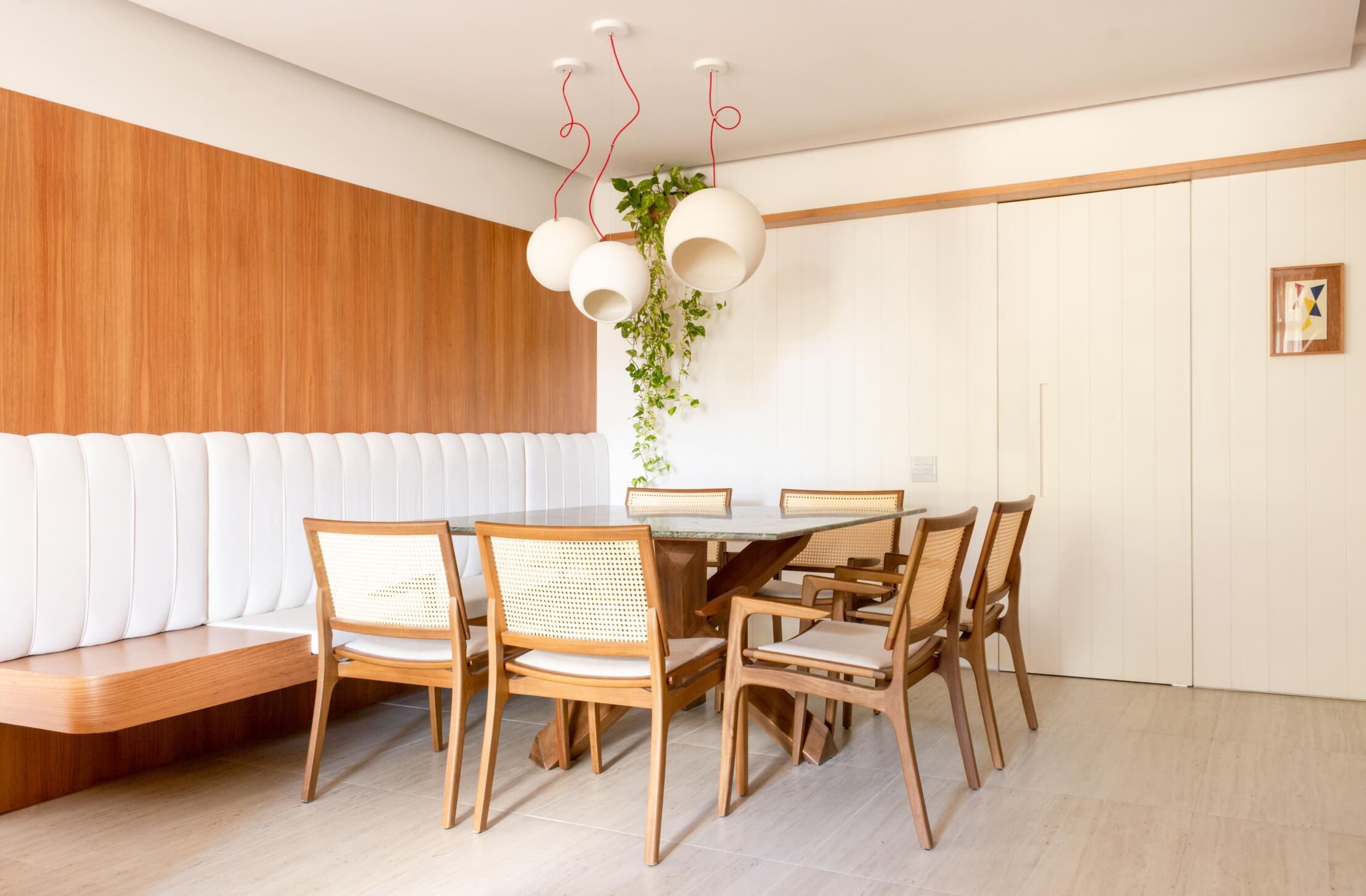 Logo na entrada, uma mesa de jantar quadrada foi estrategicamente colocada junto à parede com um sofá/banco que permite, inclusive, abrigar mais do que oito pessoas. O tampo em pedra natural dá um toque de sofisticação ao ambiente e contrasta com a irreverente luminária.