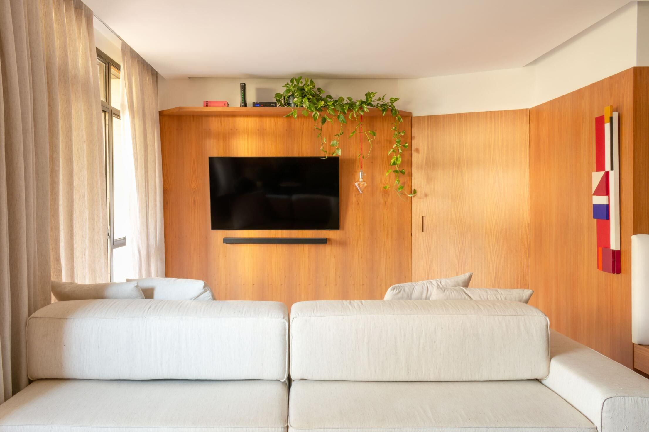 A sala tinha um armário embutido de madeira maciça que apesar de lindo não combinava com o estilo do casal. Ao retirar o armário, conseguimos ganhar 40 cm na sala, o que fez toda diferença no layout proposto.