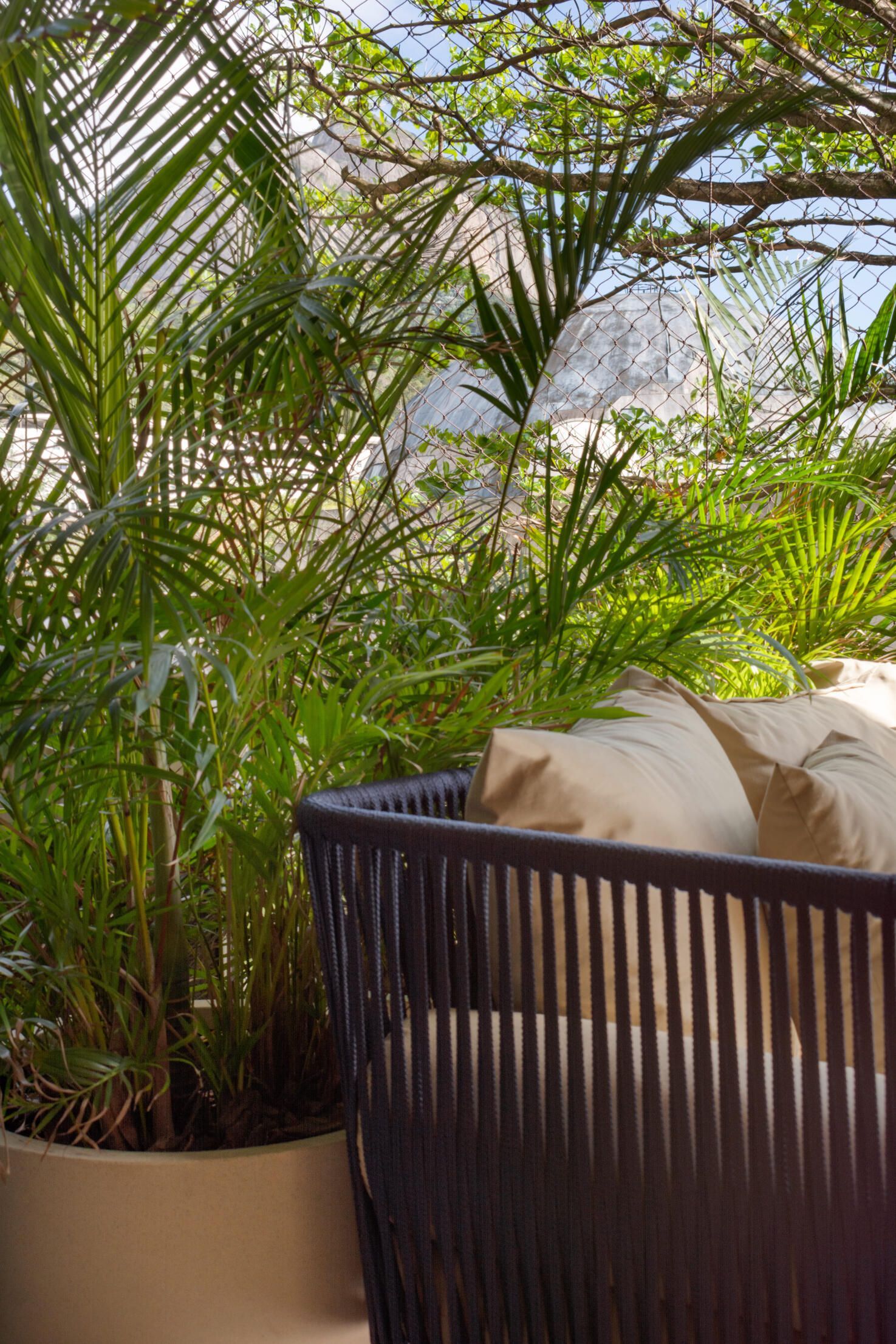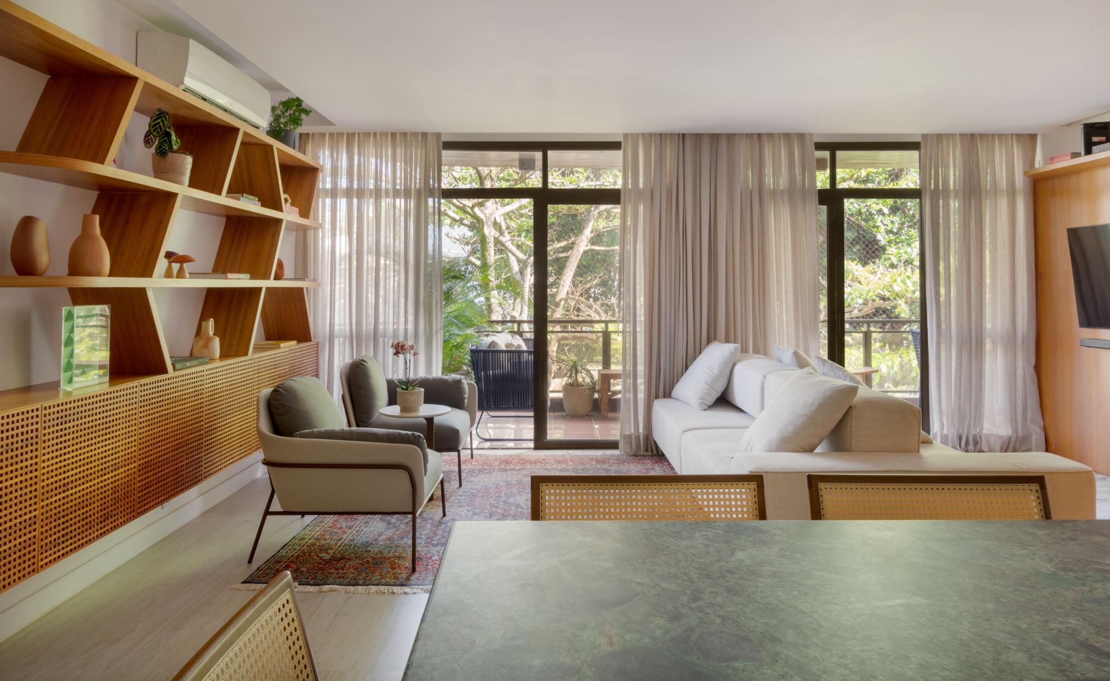 Conseguimos aproveitar bem o layout da varanda longa sem perder o espaço de convivência.