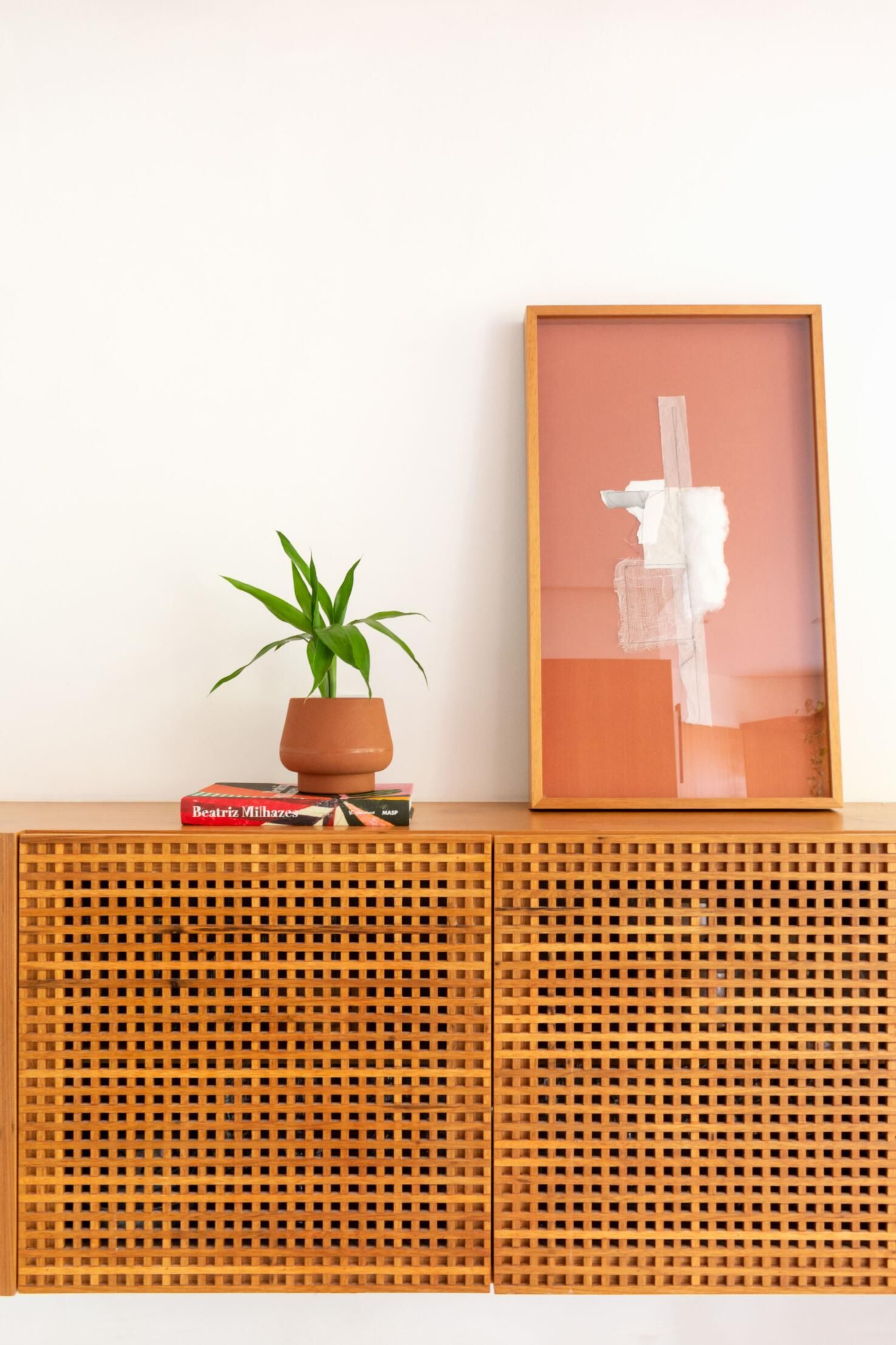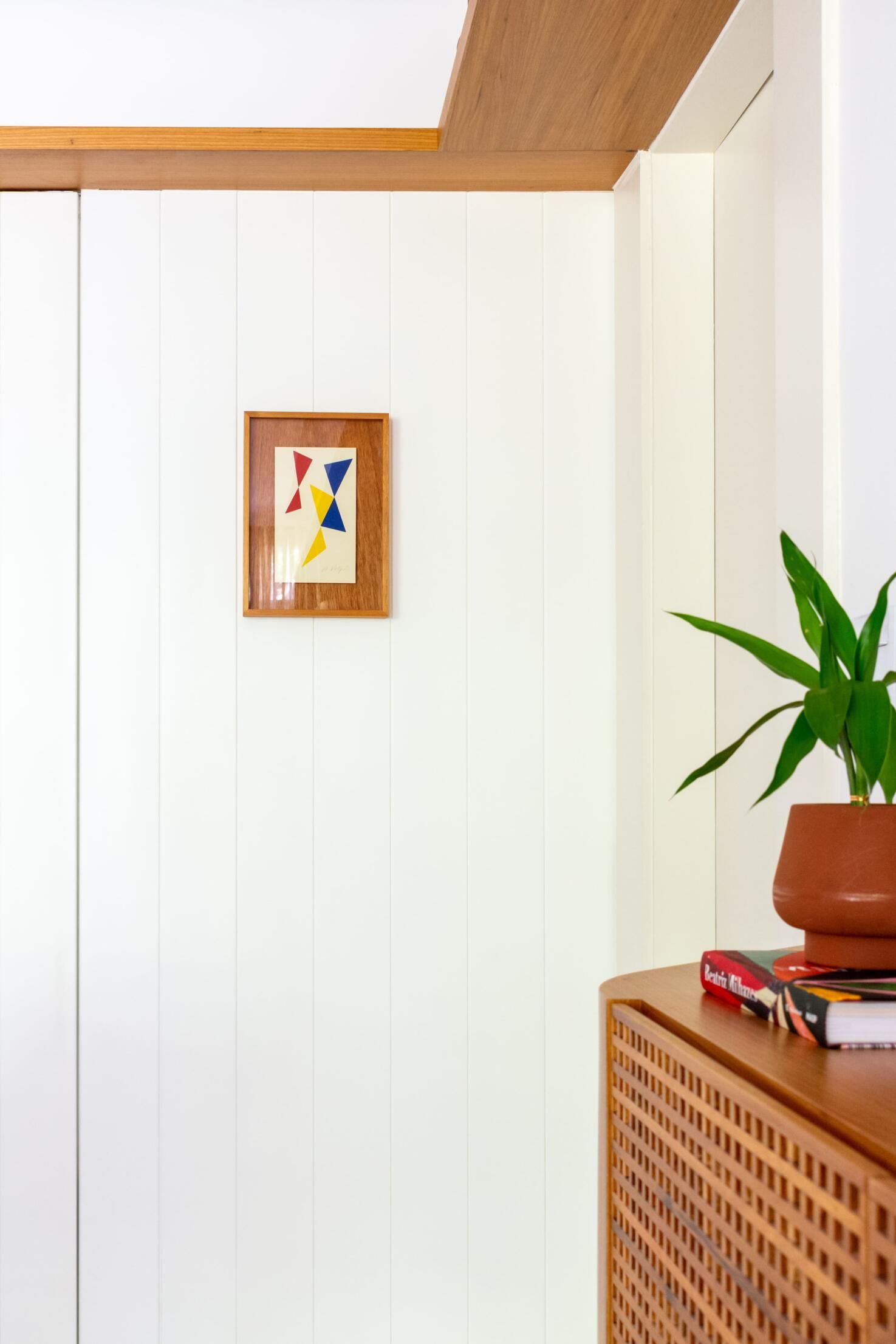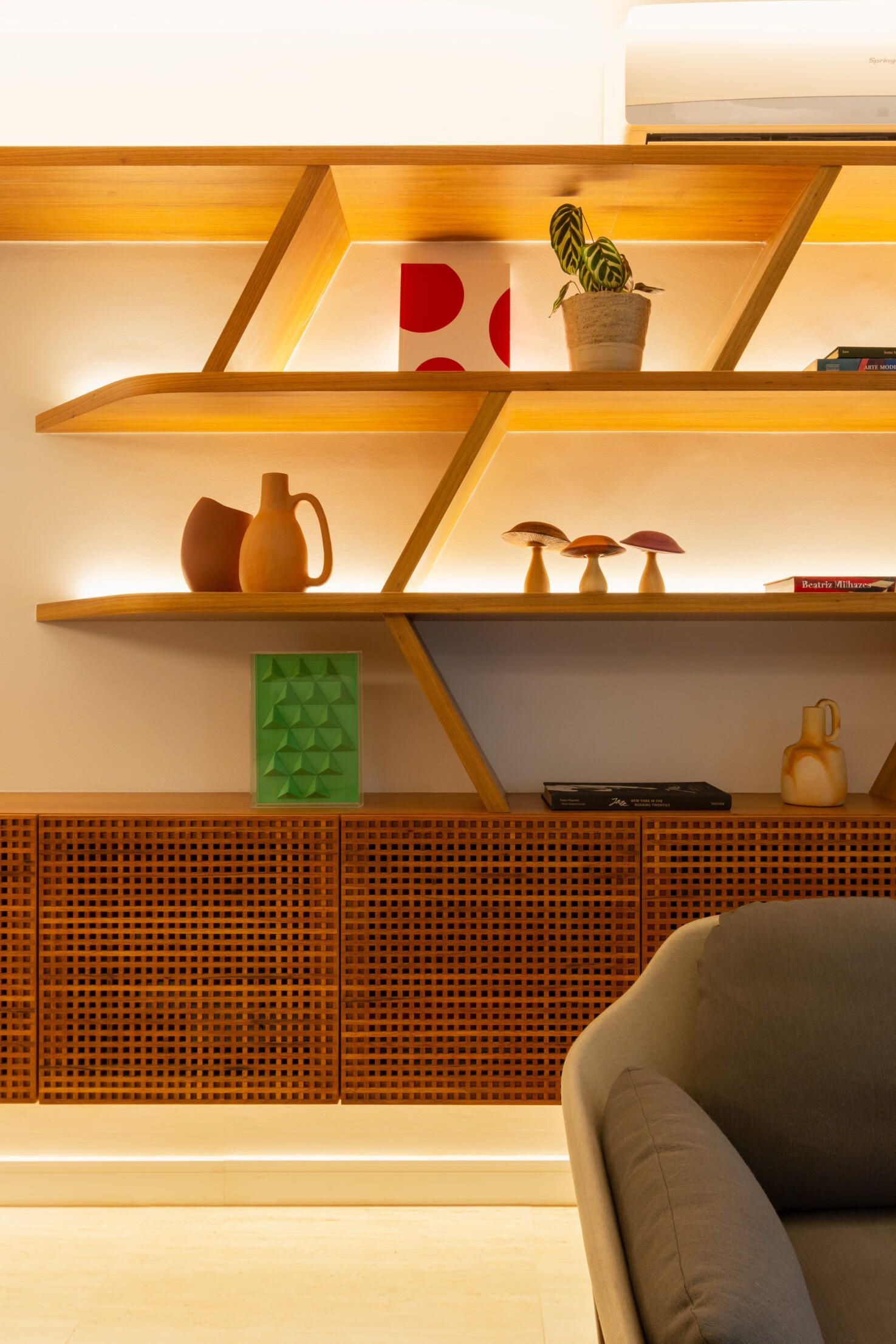 O muxarabi nas portas da parte inferior da estante permite que os utilitários tenham ventilação. Na parte superior, prateleiras diagonais dão uma bossa ao espaço e expõem itens e memórias afetivas dos moradores.