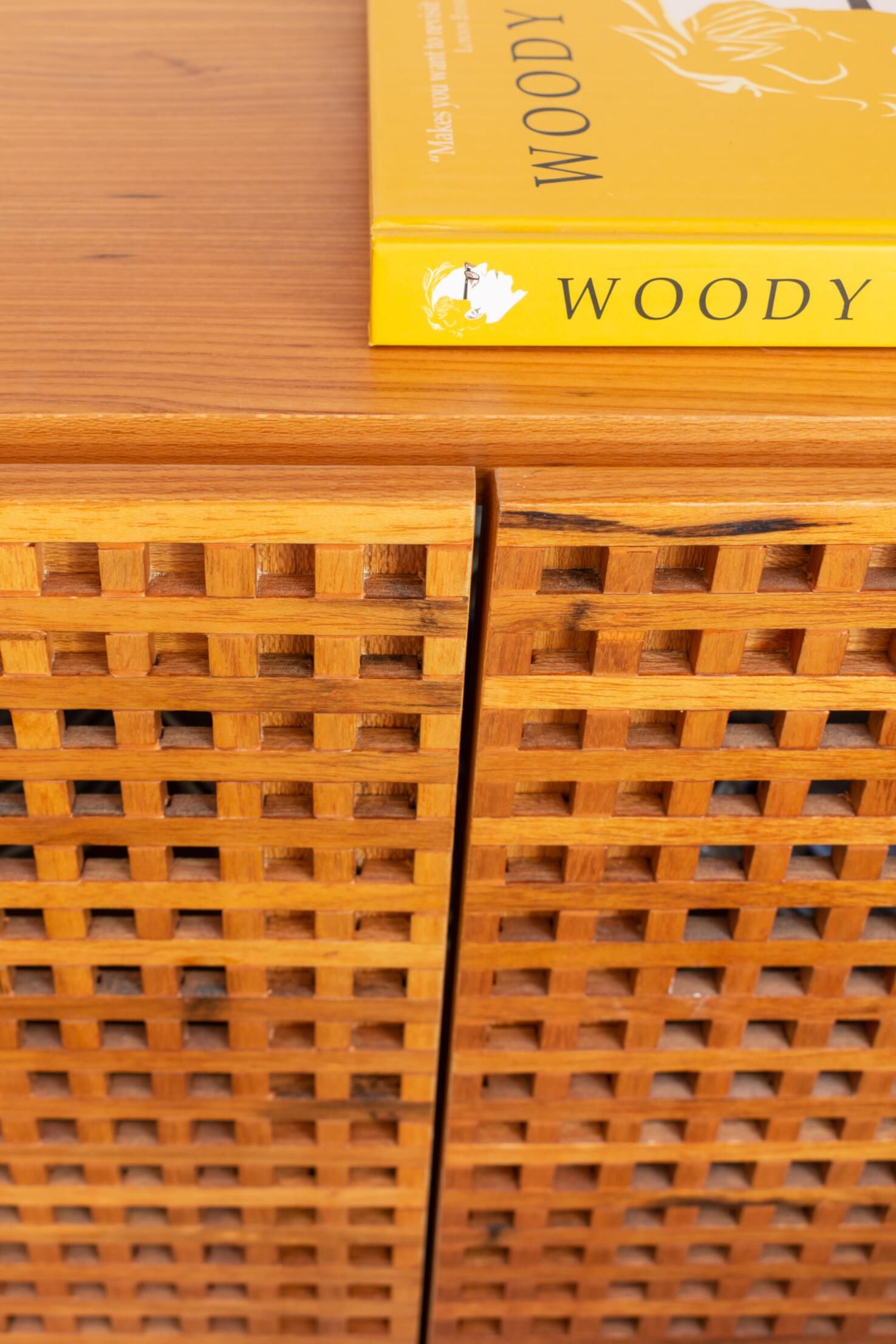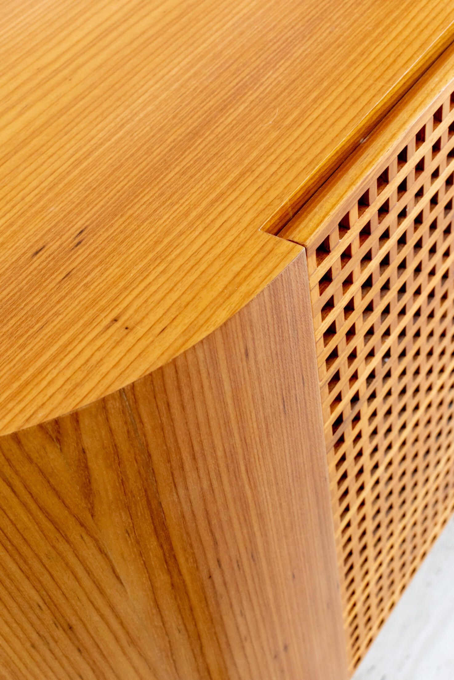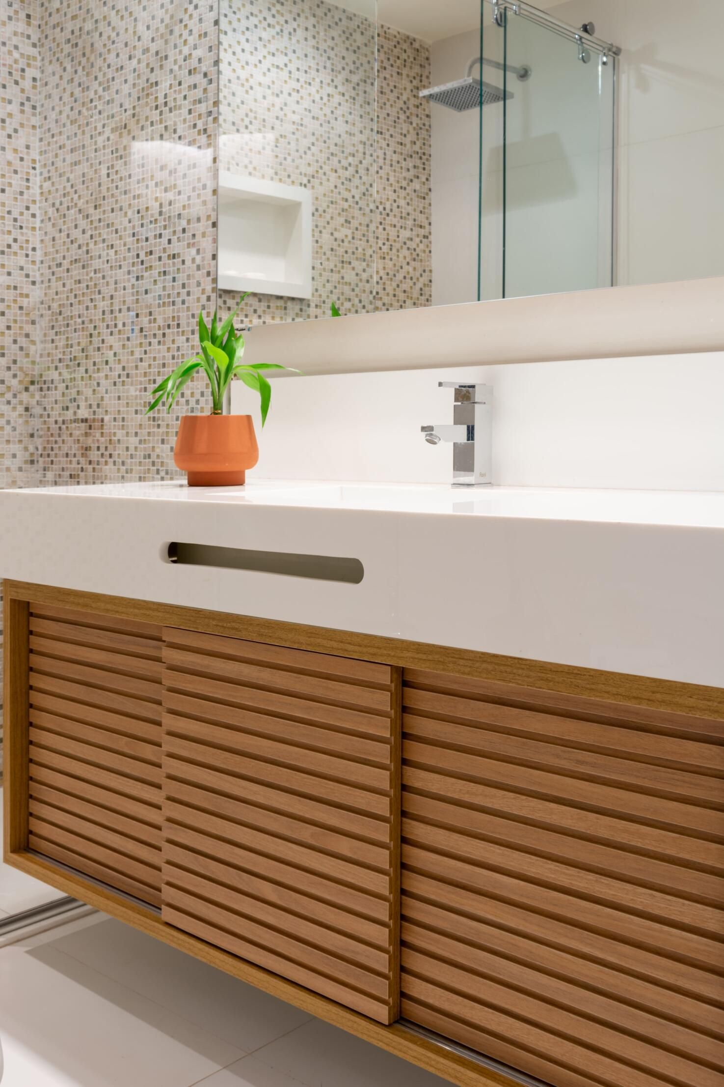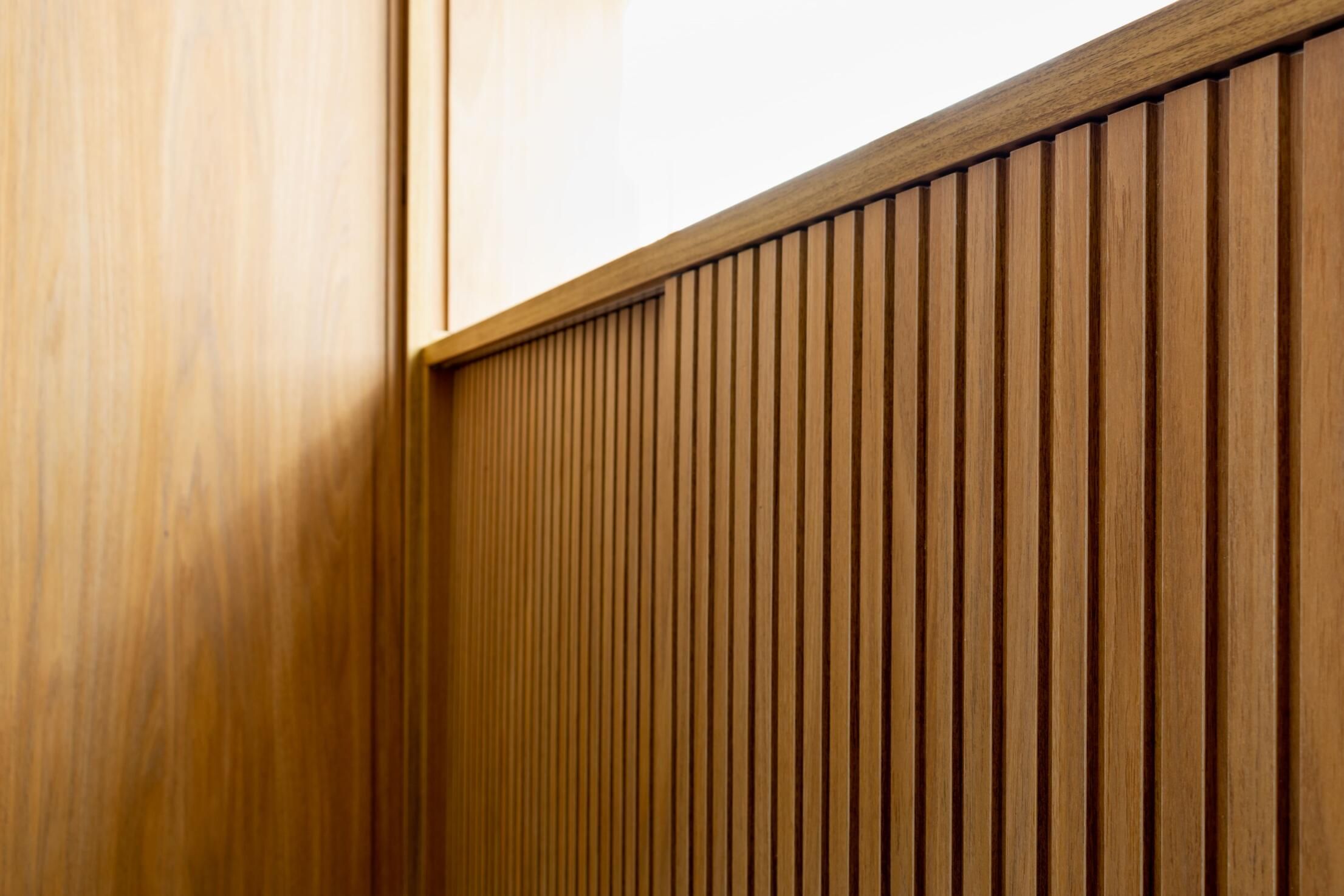 O muxarabi nas portas da parte inferior da estante permite que os utilitários tenham ventilação. Na parte superior, prateleiras diagonais dão uma bossa ao espaço e expõem itens e memórias afetivas dos moradores.