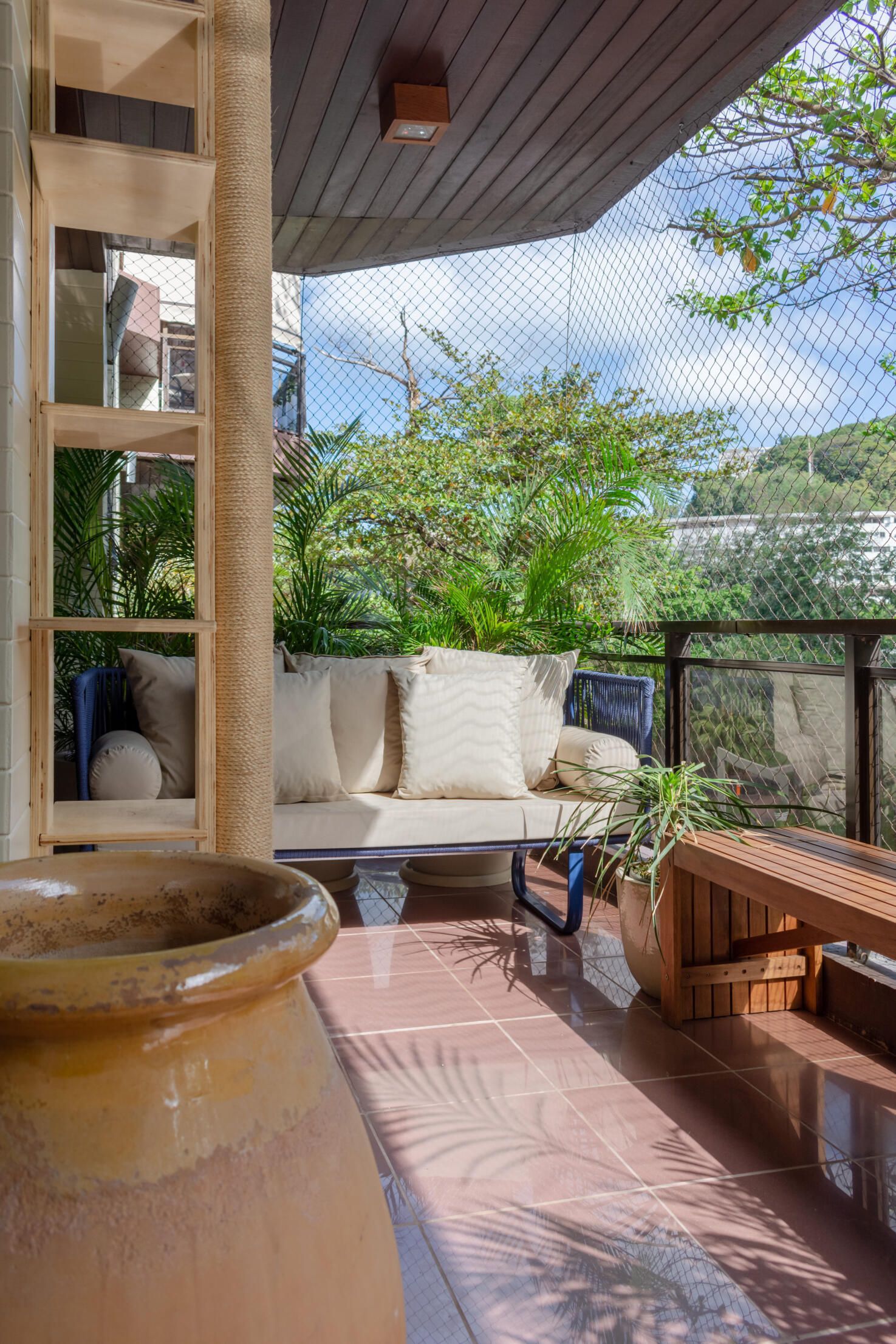 Na varanda, uma parede “falsa” abriga na parte frontal uma floreira e na parte traseira um armário para suporte da área de serviço, área de máquinas de ar condicionado e espaço para varal.