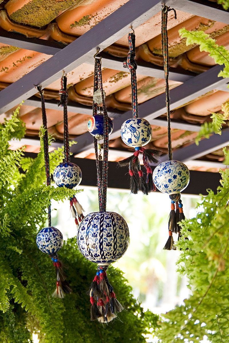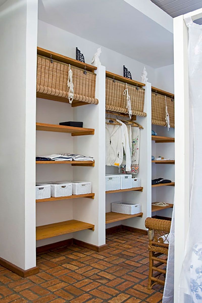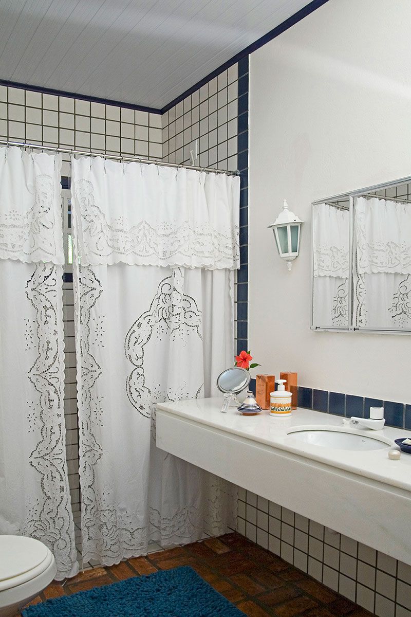 A inexistência das portas faz o ar circular e protege as roupas do mofo e da umidade. Os banheiros possuem a mesma referência: piso em tijolo, paredes em cerâmica rústica em branco e azul, tampos em mármore branco. E nos boxes cortinas em richelieu, originárias de Fortaleza, com desenhos de seus pontos por Ieda Korman.