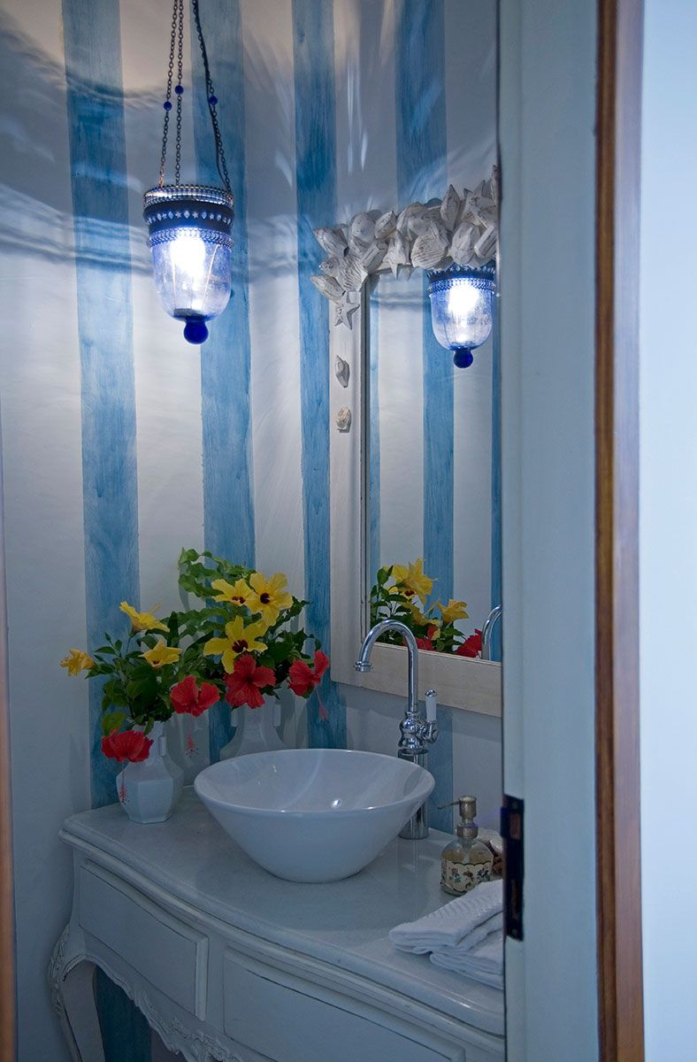 No lavabo, o aparador ganhou uma cuba sobreposta, a cuba e a torneira são da Deca. Na parede foi feita uma pintura em listas azuis e brancas, executada por mão-de-obra local com técnica ensinada pela arquiteta Ieda.