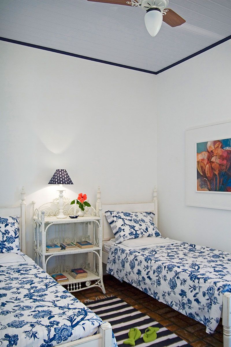 Nos quartos, alguns com camas Impérios autênticas, há criados-mudos da Armando Cerello, roupas de cama em azul e branco especialmente produzidas para esta casa e abajures em madeira branca com cúpulas com tecidos combinando.