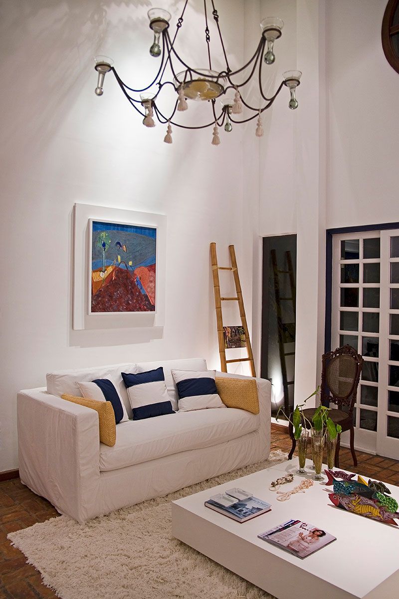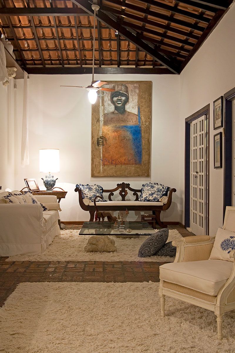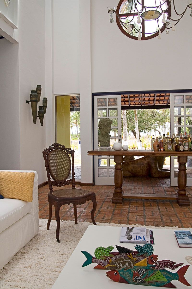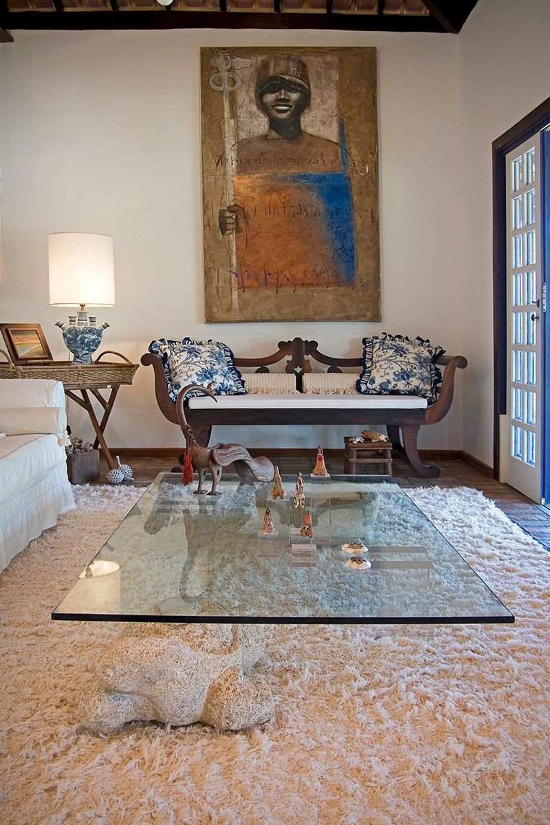 Os tapetes todos em corda barbante em tom marfim clareiam o piso rústico. A pedido da arquiteta Ieda, o quadro de Ellon Brasil foi pintado com um personagem bem baiano. A mesa de centro, desenhada pelos arquitetos, possui três pés de acrílico: em uma das extremidade, uma gamela e na outra, uma tartaruga em pedra executada pelos arredores de Minas Gerais. Todos os objetos foram adquiridos em viagens ou são artesanatos brasileiros pesquisados e comprados dos próprios artesãos.