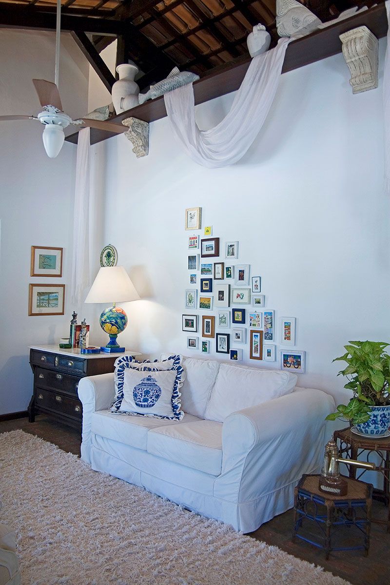 No quarto do casal, pé-direito duplo com as madeiras aparentes com acabamento envelhecido. Um sofá em lona branca com almofadas azuis e nas paredes detalhes em madeira tiradas de recorte das portas de um armário antigo e depois pintadas.