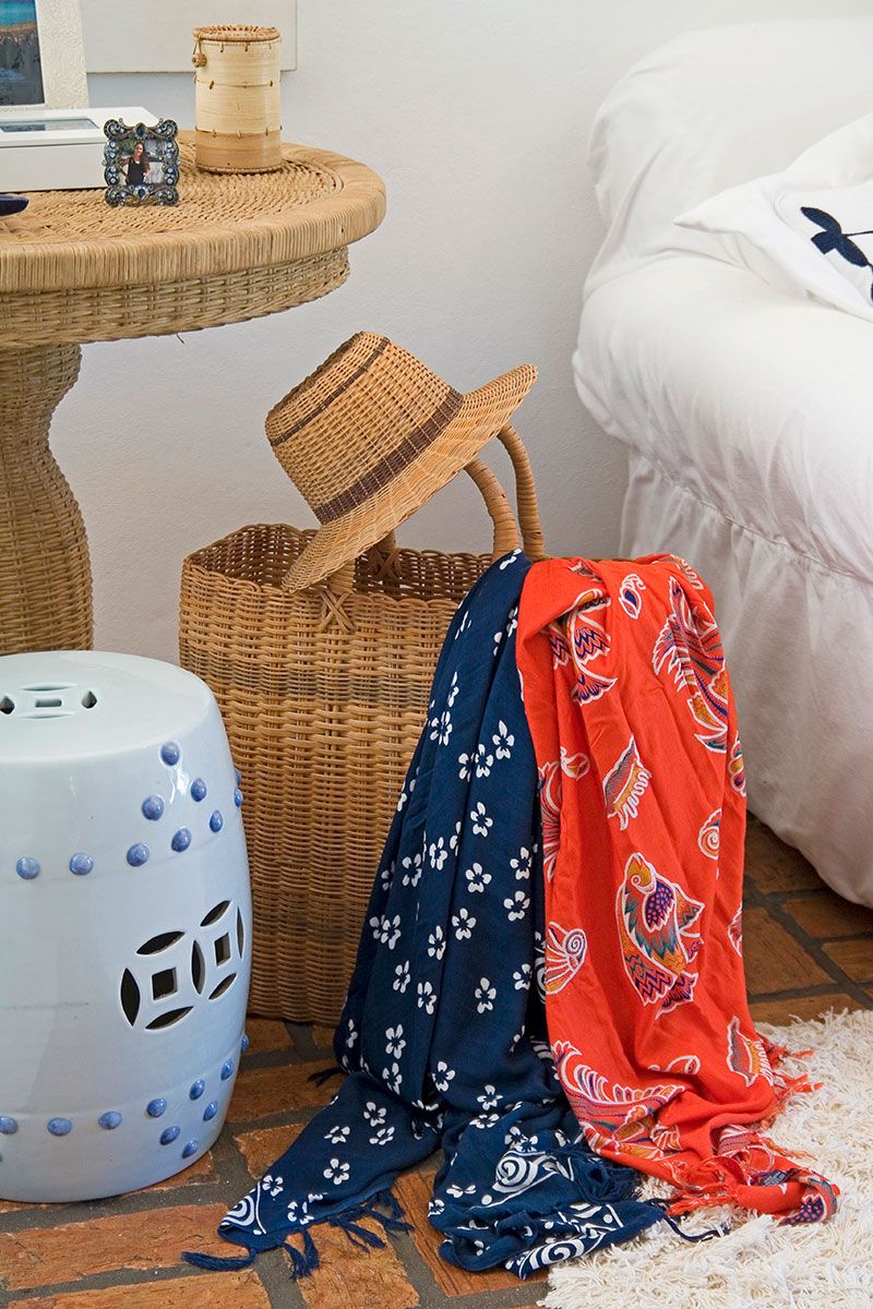 A inexistência das portas faz o ar circular e protege as roupas do mofo e da umidade. Os banheiros possuem a mesma referência: piso em tijolo, paredes em cerâmica rústica em branco e azul, tampos em mármore branco. E nos boxes cortinas em richelieu, originárias de Fortaleza, com desenhos de seus pontos por Ieda Korman.