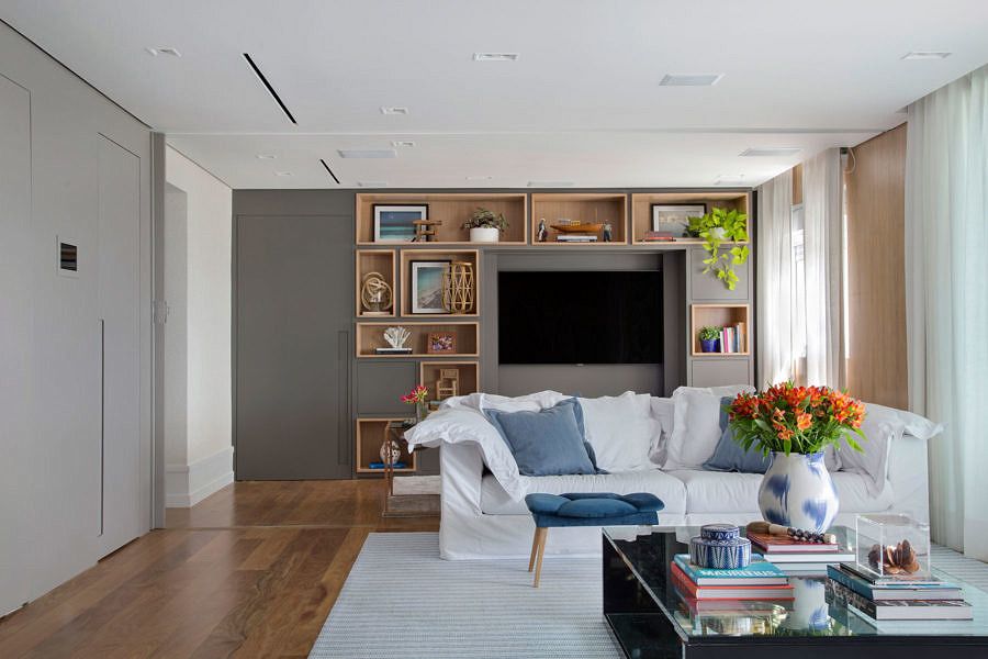 O escritório optou por colocar no apartamento um ar condicionado linear, para que os ambientes fiquem com a temperatura melhor dividida, sem a evaporadora aparente.