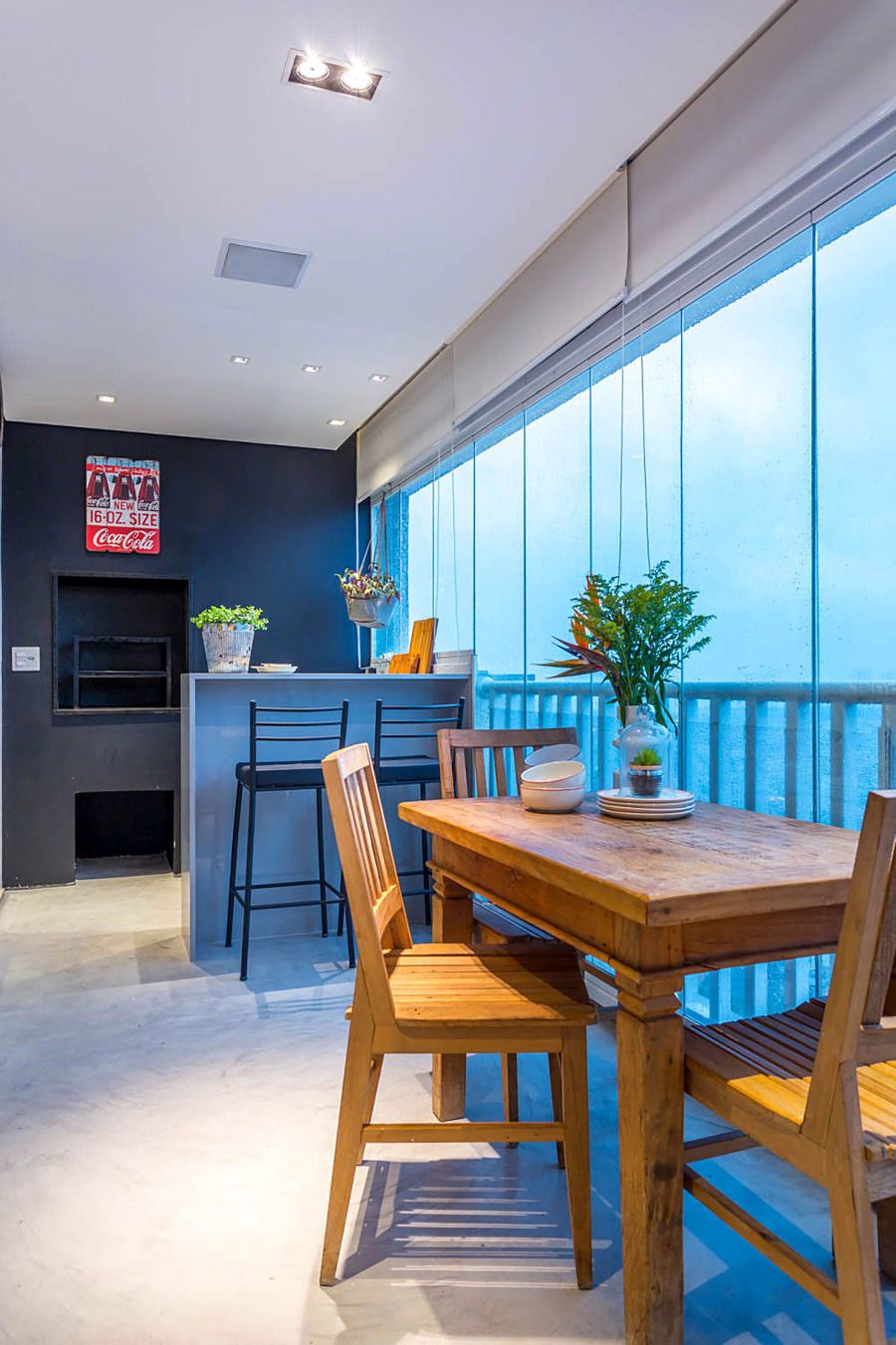 O Studio Janela escolheu não usar rodapé e o apartamento foi todo revestido com cimento queimado, que não necessita de juntas de dilatação, trazendo mais amplitude para o ambiente.