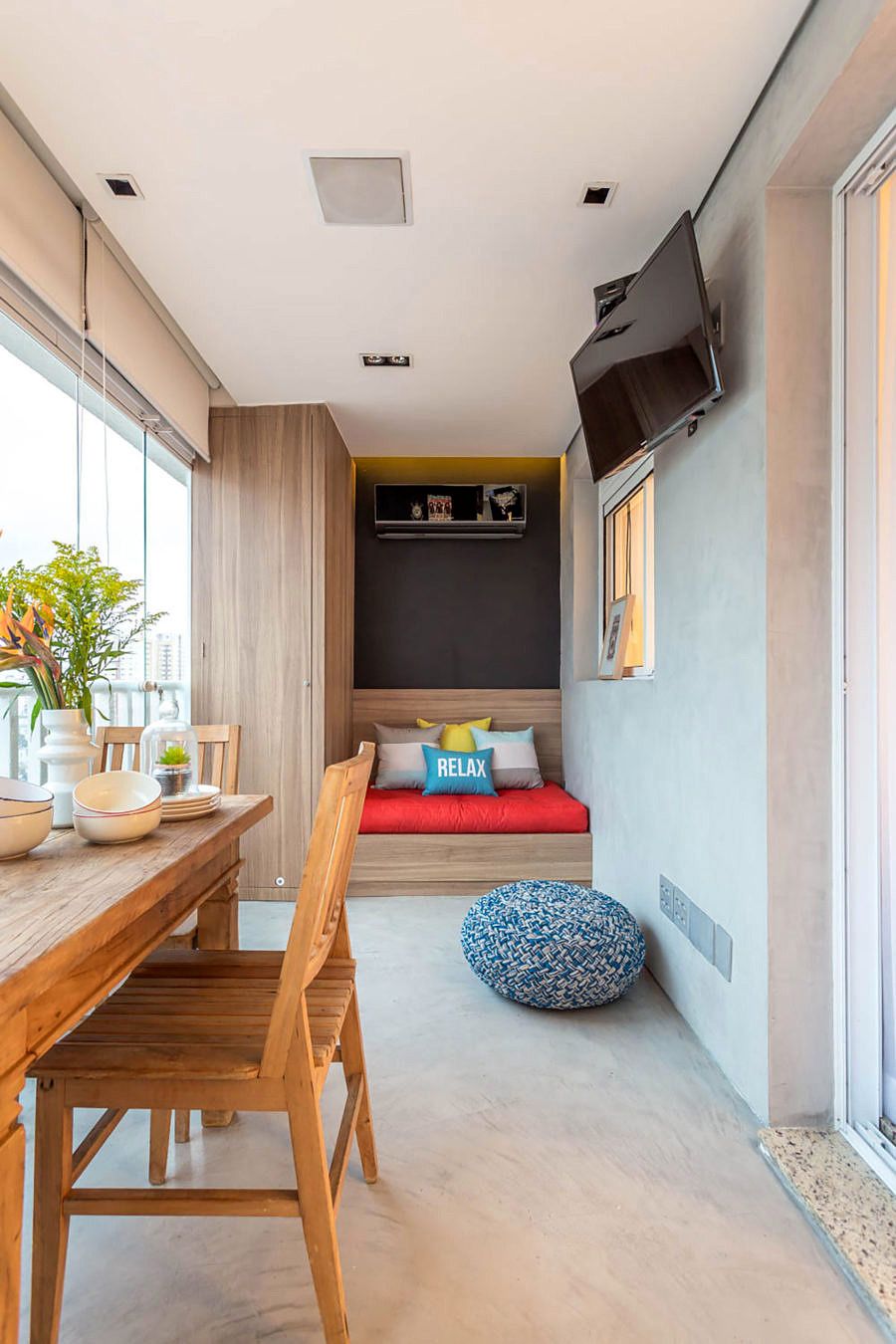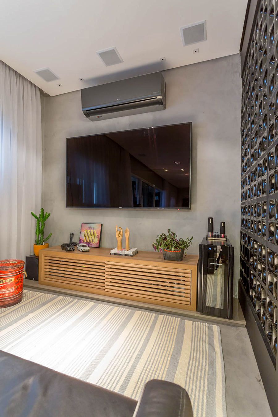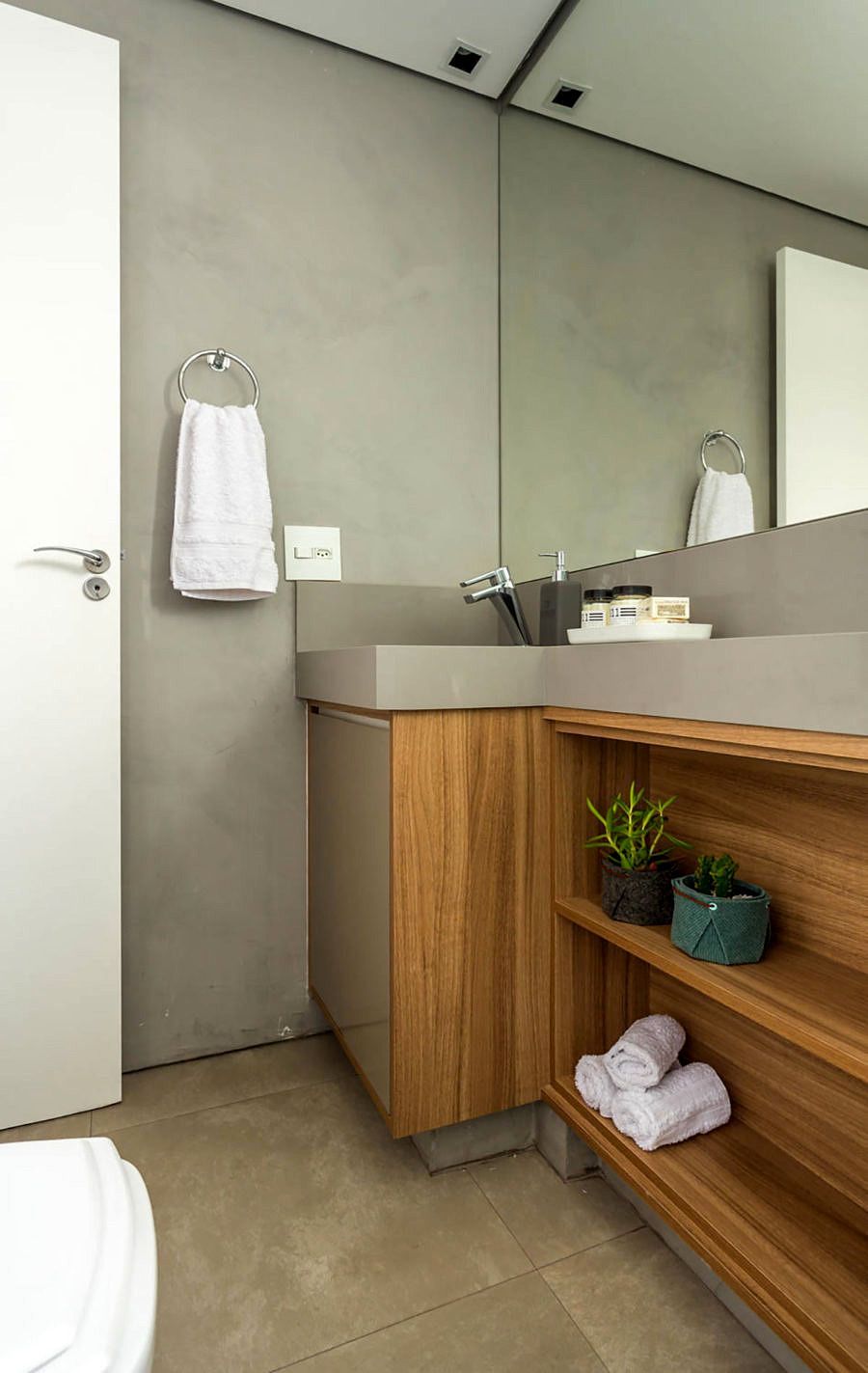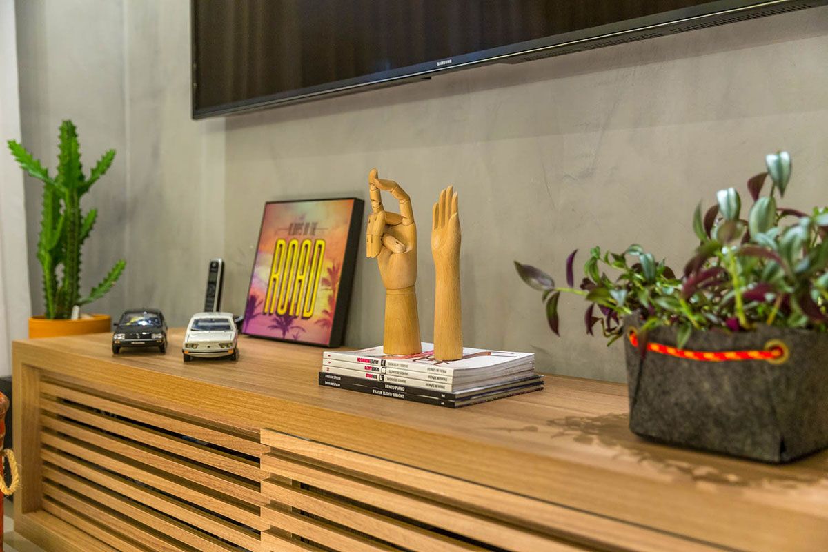 O Studio Janela escolheu não usar rodapé e o apartamento foi todo revestido com cimento queimado, que não necessita de juntas de dilatação, trazendo mais amplitude para o ambiente.