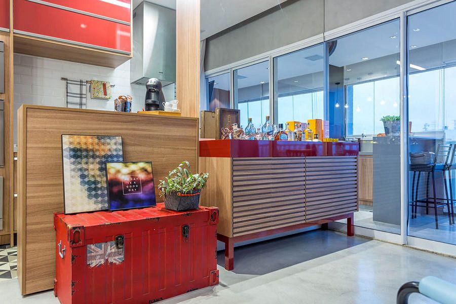 Na cozinha o cliente já havia pontuado que gostaria de usar o revestimento brick White cerâmico, o escritório seguiu com a referência escolhida por ele. Para as demais paredes, o escritório optou em pintar de preto e usar uma marcenaria mais escura com tons de madeira e vermelho.