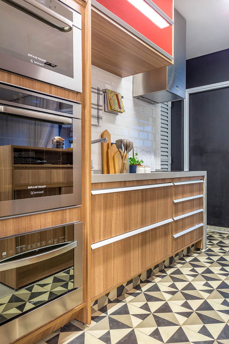 Para o piso, um azulejo hidráulico que foi desenhado pela arquiteta e depois paginado junto com o cliente. Dessa forma a cozinha ficou totalmente personalizada e única.