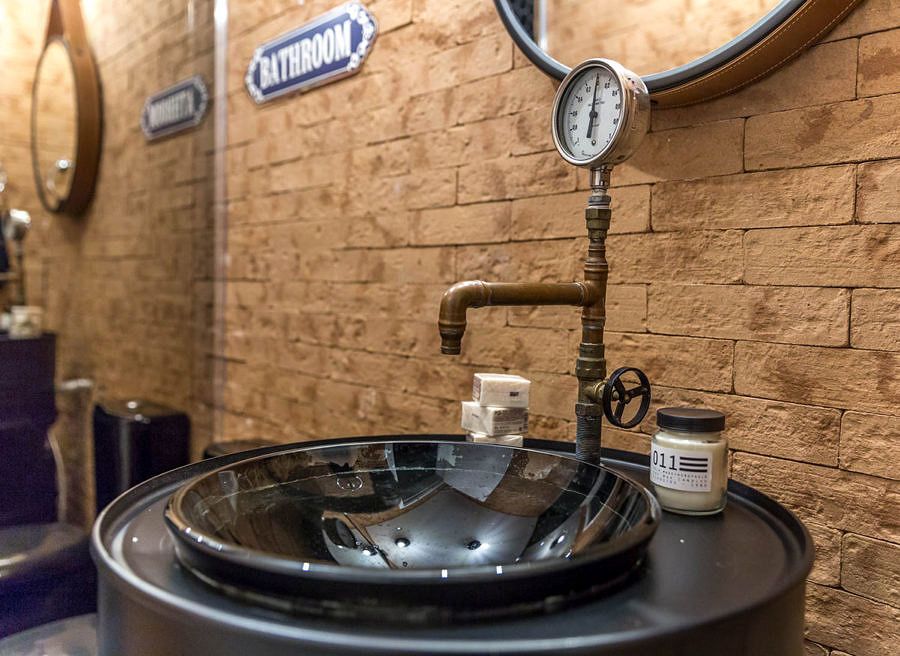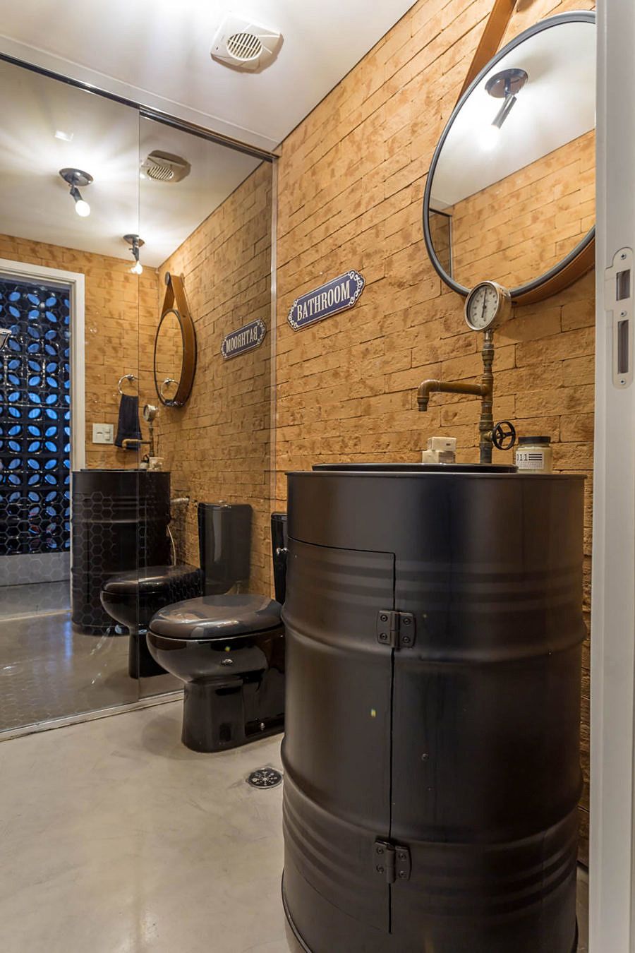 Um dos destaques do projeto é o lavabo, que recebeu uma “pia tonel” e revestimento de tijolo. Os profissionais optaram por um box espelhado para camuflar essa função do banheiro, dando ainda mais cara de lavabo para o ambiente, o box por dentro é revestido de pastilha cerâmica.