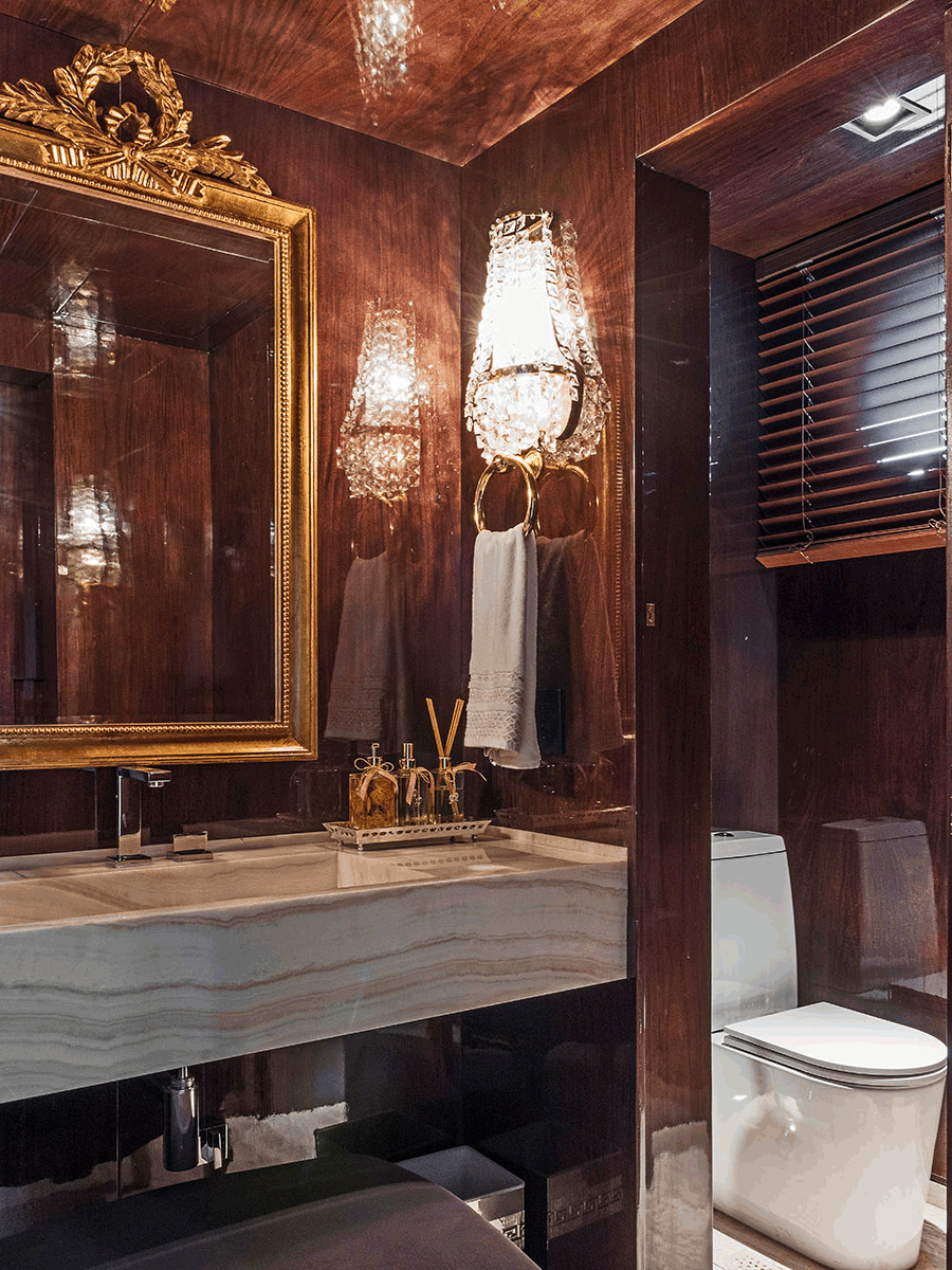 Um destaque neste projeto para o escritório são os acabamentos especiais e personalizados, como os painéis em madeira pau-ferro alto brilho nas áreas sociais em composição com entalhes, ferragens e ornamentações em dourado. O sofá em veludo verde também se destaque, o item deu personalidade ao apartamento.