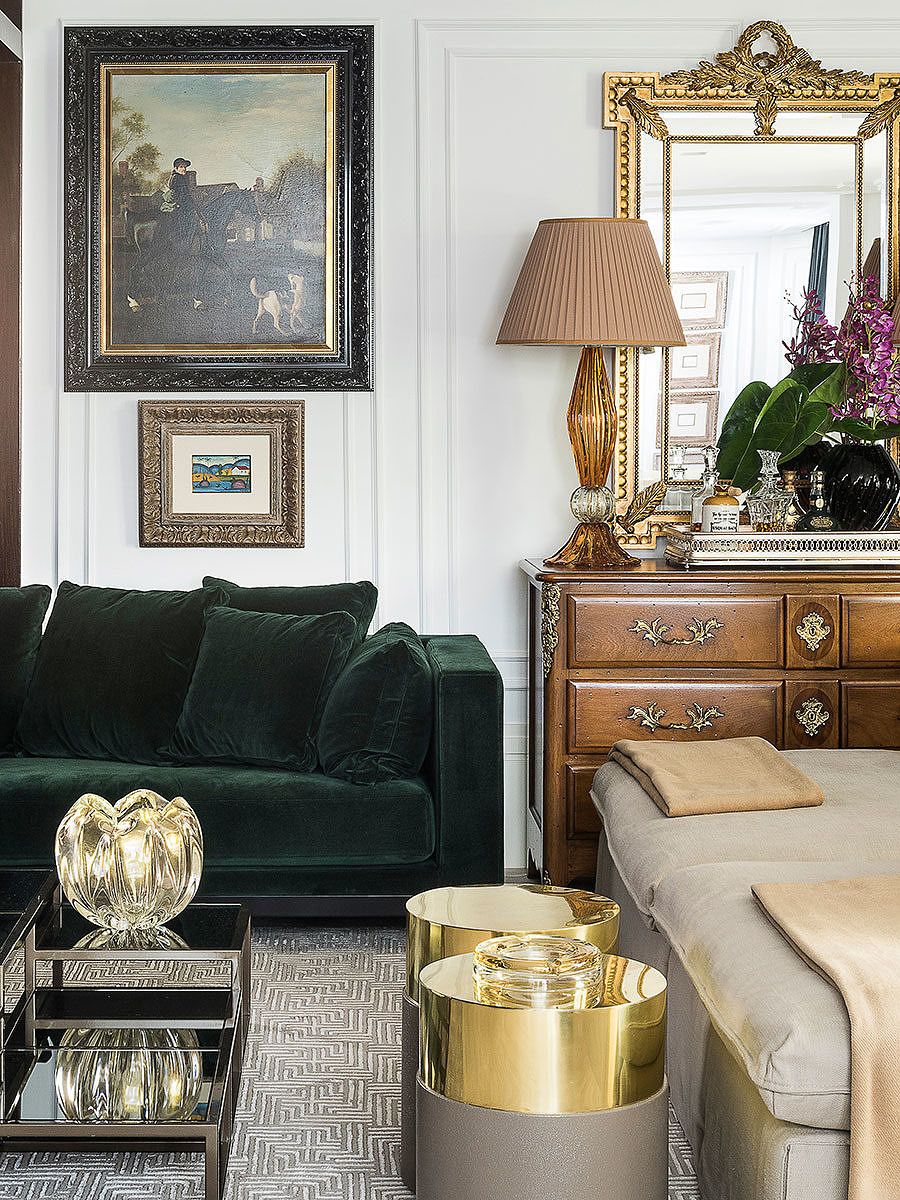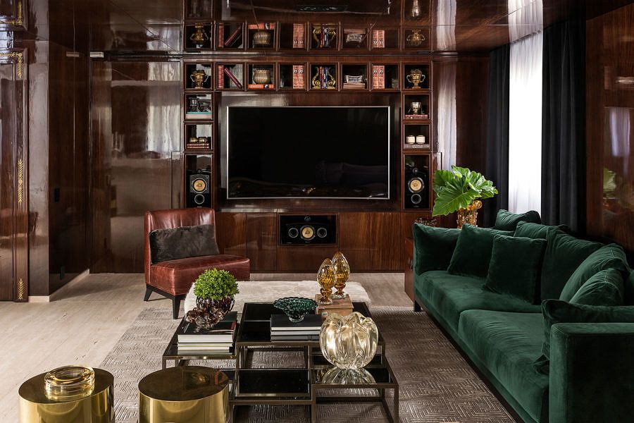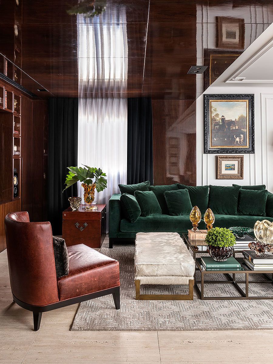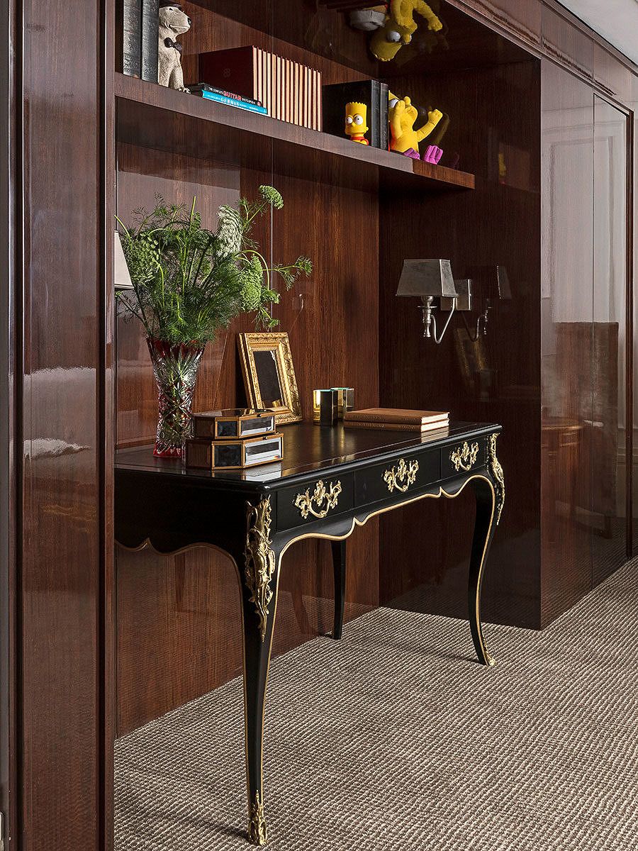 Um destaque neste projeto para o escritório são os acabamentos especiais e personalizados, como os painéis em madeira pau-ferro alto brilho nas áreas sociais em composição com entalhes, ferragens e ornamentações em dourado. O sofá em veludo verde também se destaque, o item deu personalidade ao apartamento.