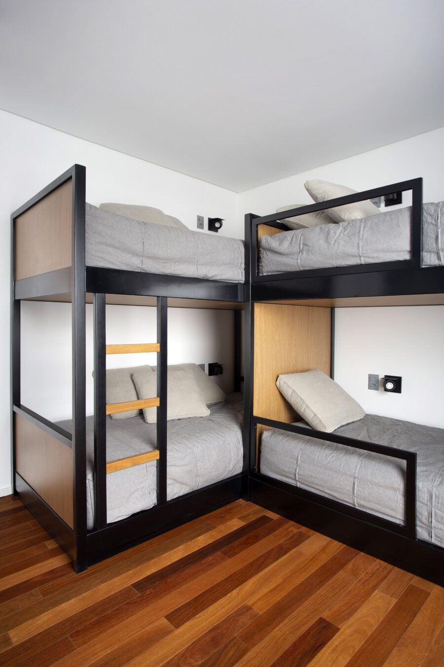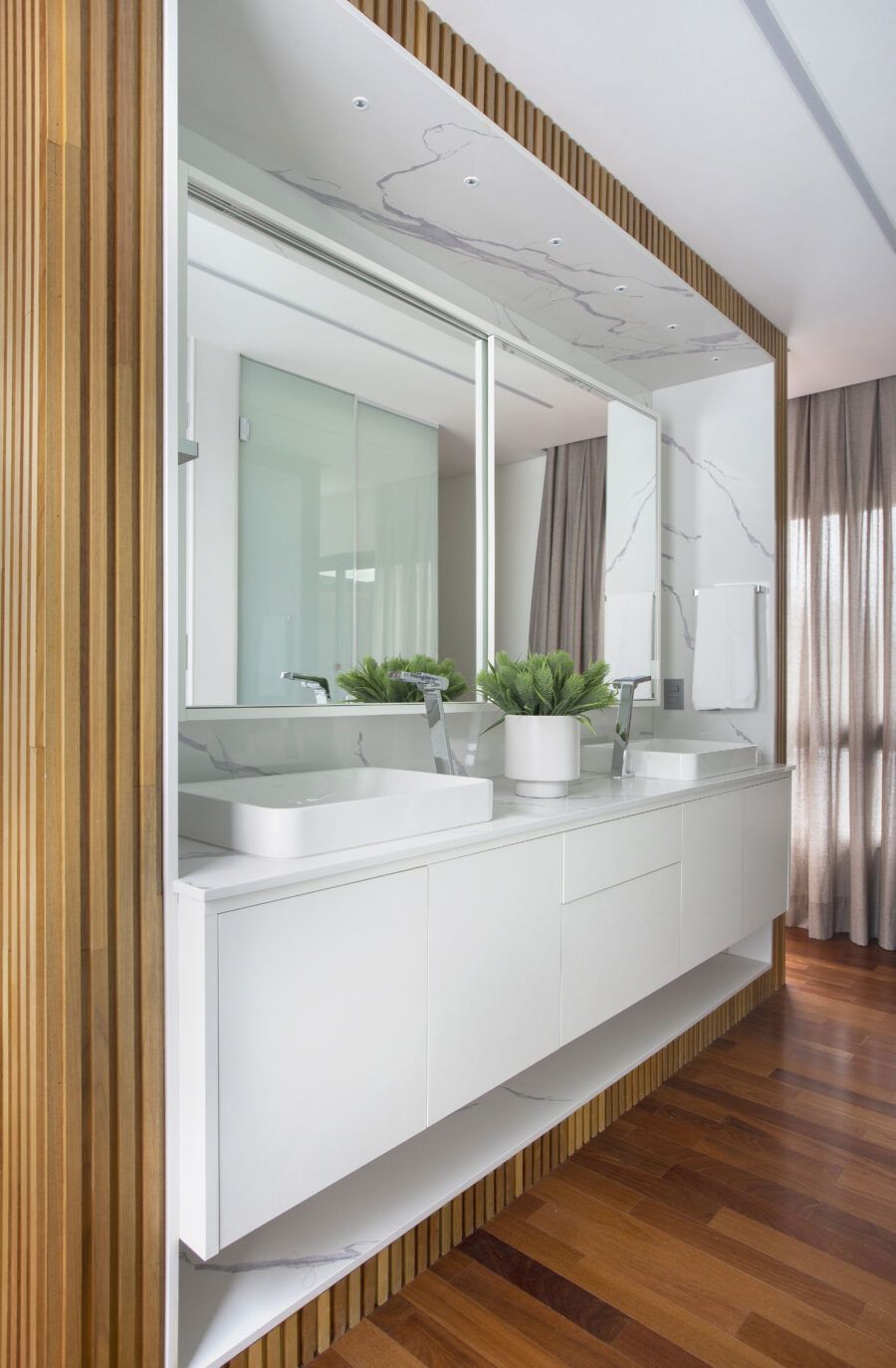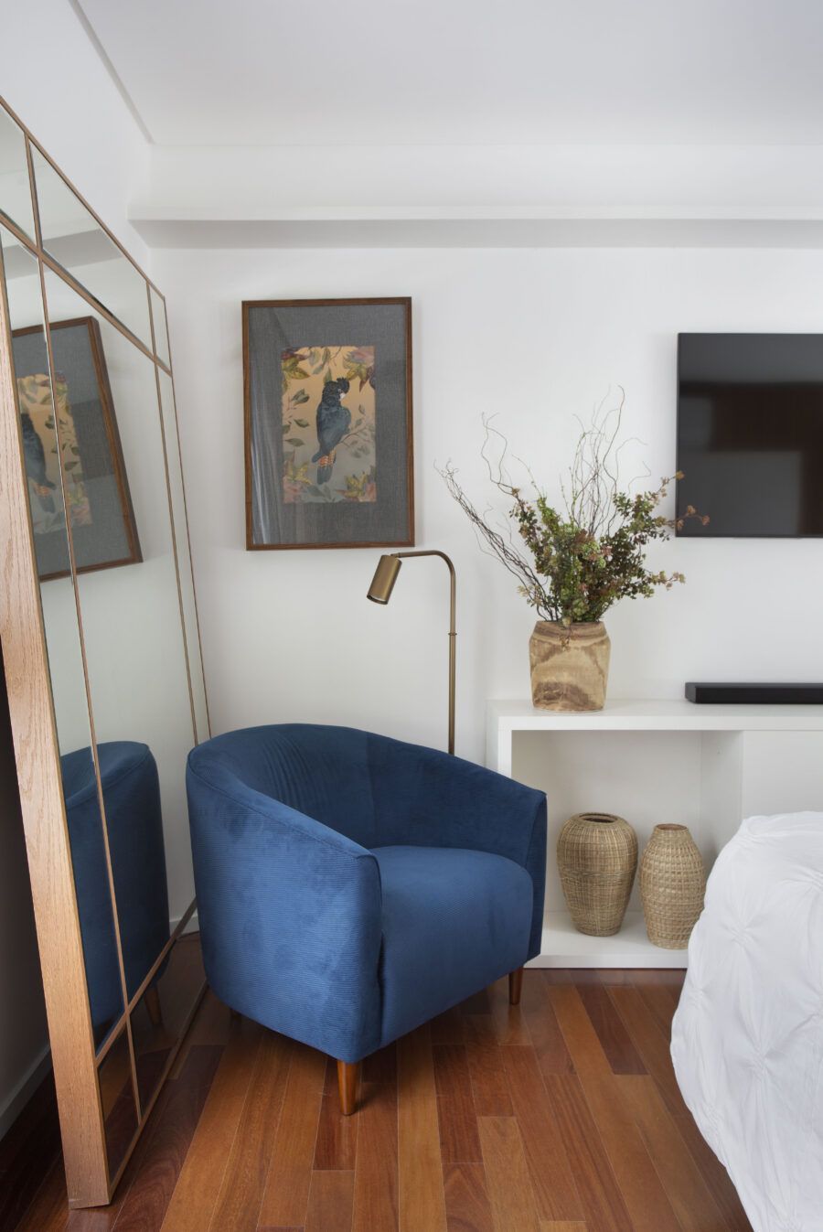 “A madeira entra como um elemento acolhedor, enquanto o branco faz a ligação entre os ambientes e serve de pano de fundo para a decoração. Já o cinza traz contemporaneidade ao espaço.”