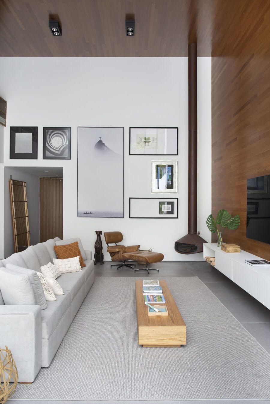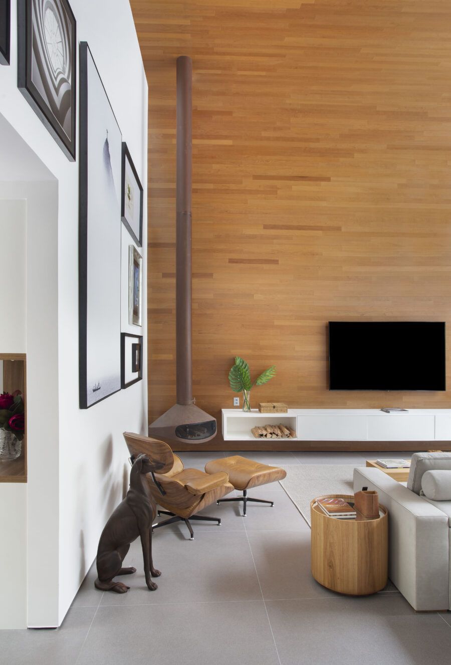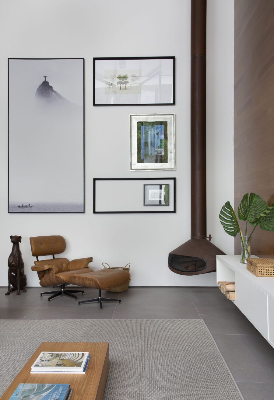 “Procuramos respeitar a mesma linguagem de materiais da fachada no interior da casa. Temos um carinho especial pelo cantinho da lareira da sala, ambientado com a poltrona Lounge do Charles Eames e a estátua do cachorro.”