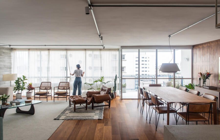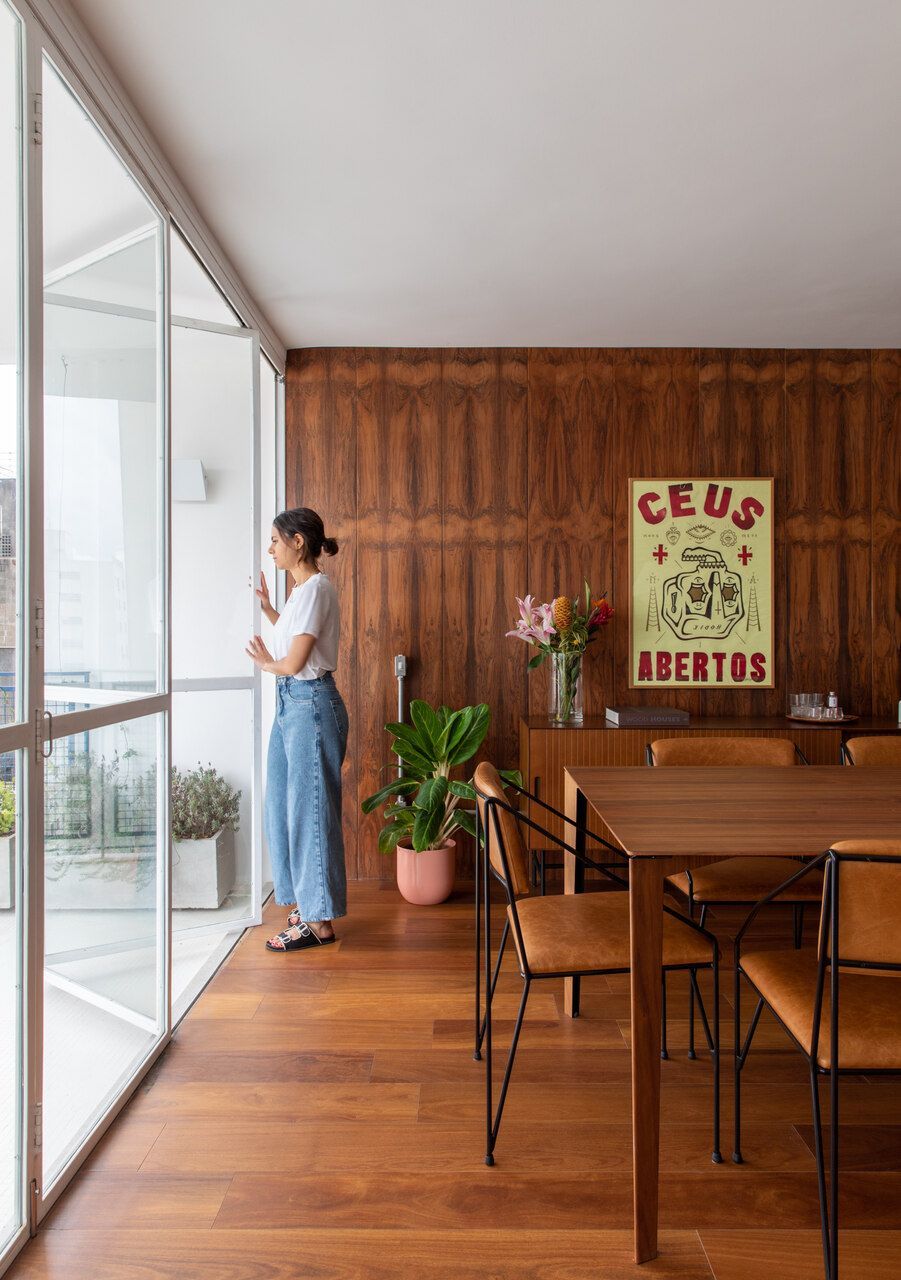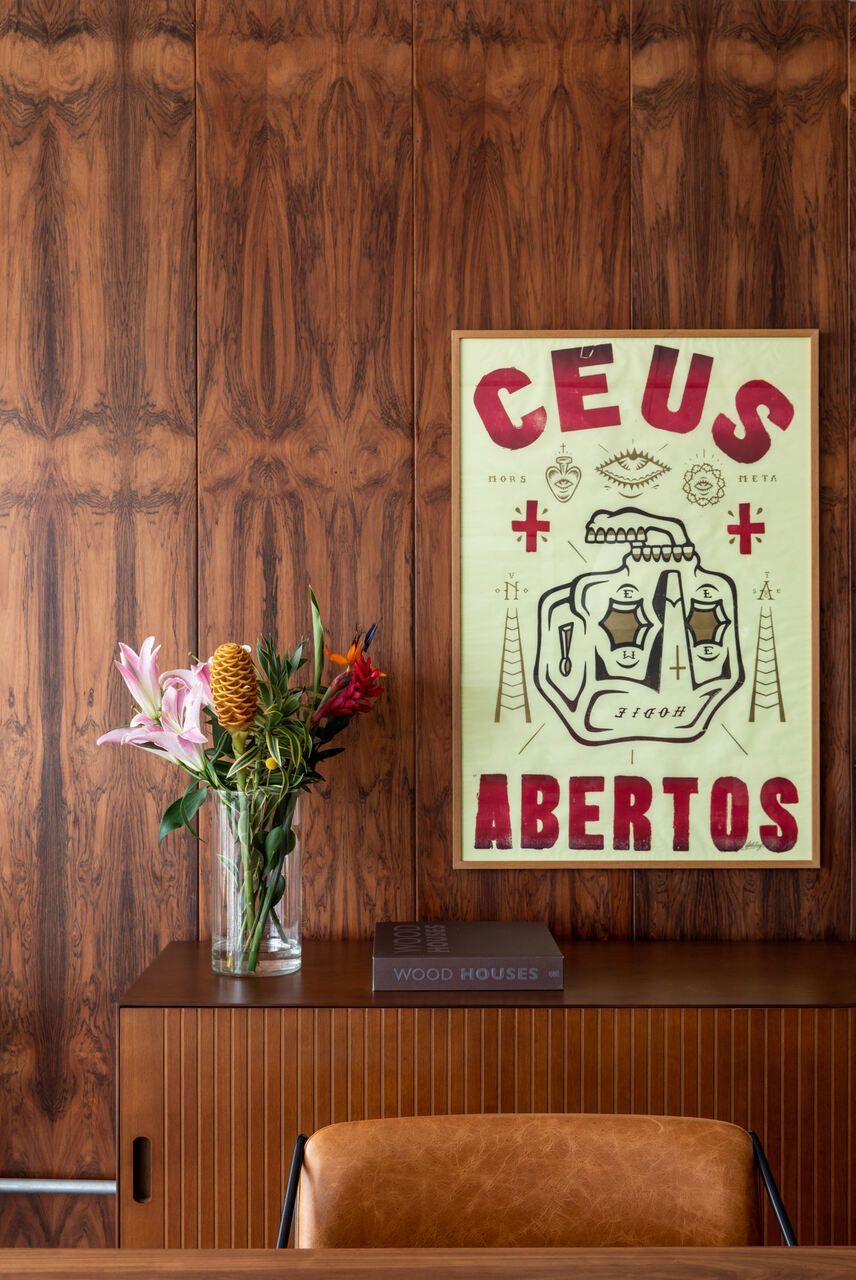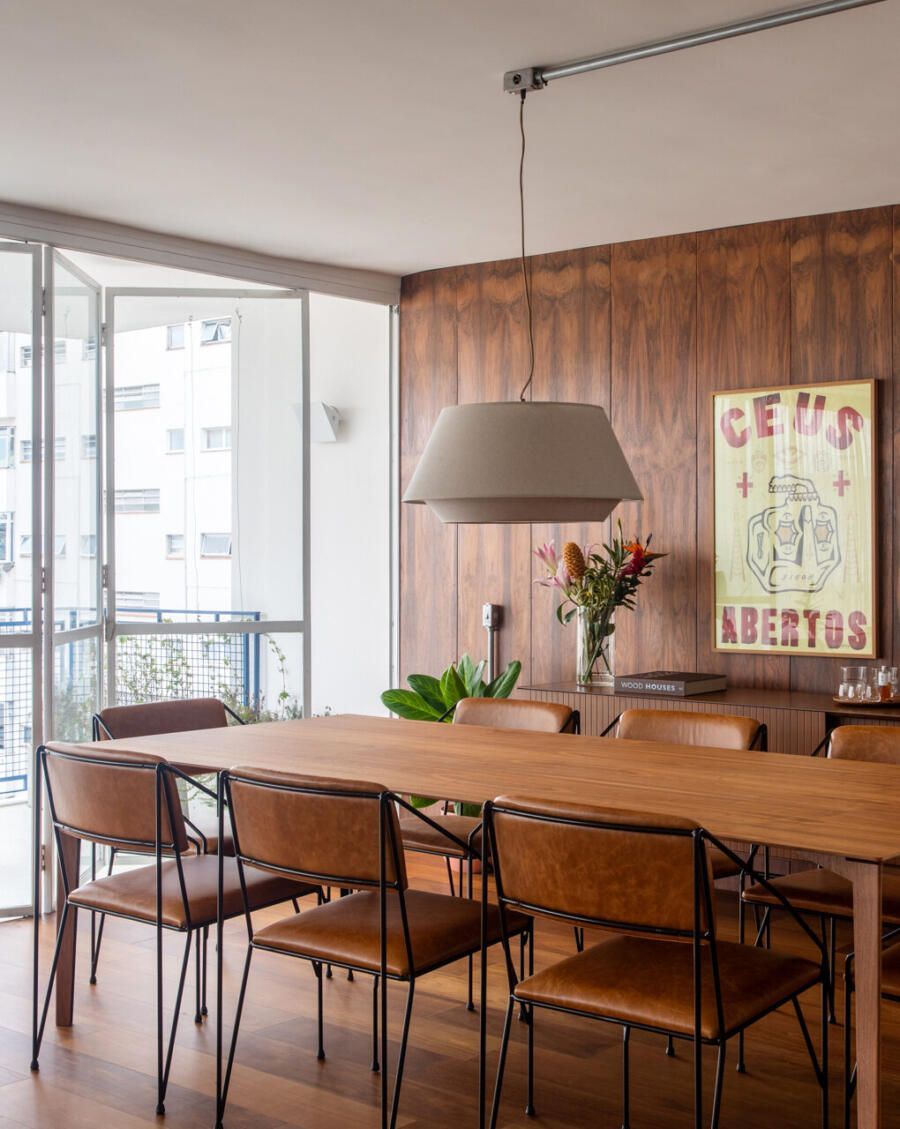 Entre os destaques, estão a mesa de jantar Dinn, de Jader Almeida, posicionada em frente aos painéis de jacarandá dos anos 1960, herdados da avó paterna de Guilherme.