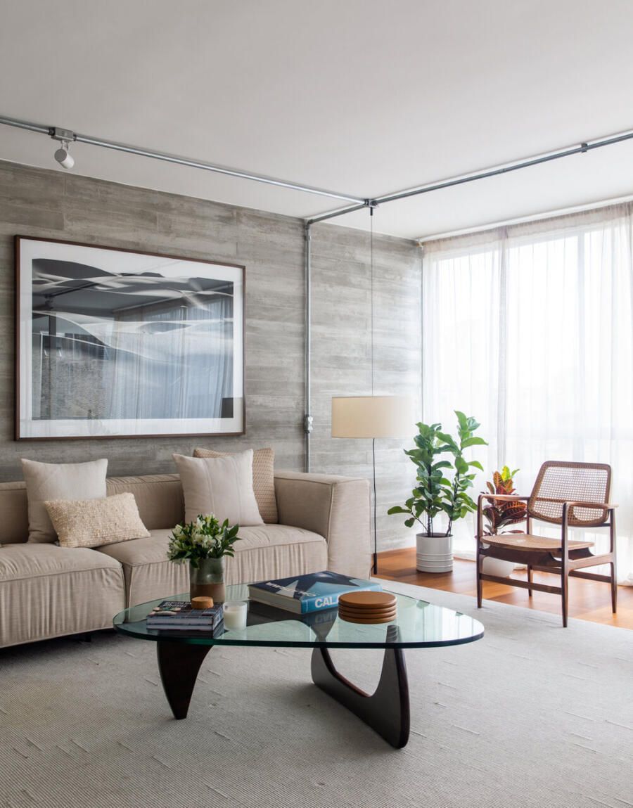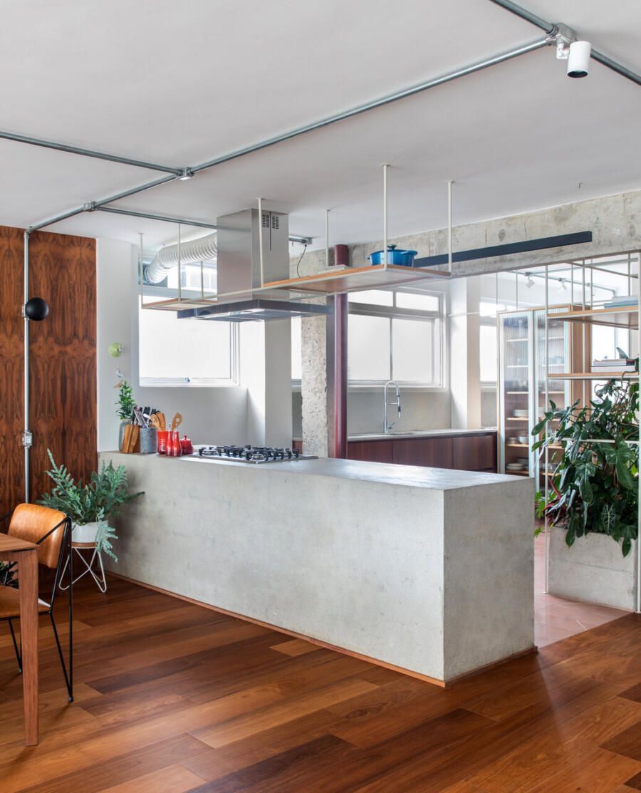 Com ambientes amplos e integrados, a área social foi pensada para acolher encontros e conversas longas. O destaque vai para a ilha de concreto aparente, que organiza o espaço entre cozinha e sala de jantar e funciona como ponto de encontro natural da casa. O mobiliário mistura peças de design brasileiro icônicas com itens do acervo pessoal do casal.