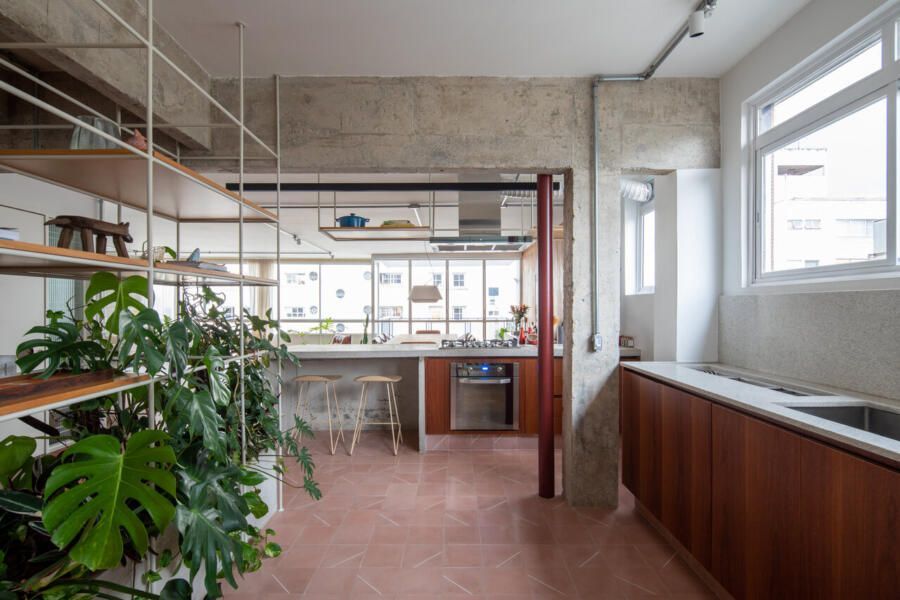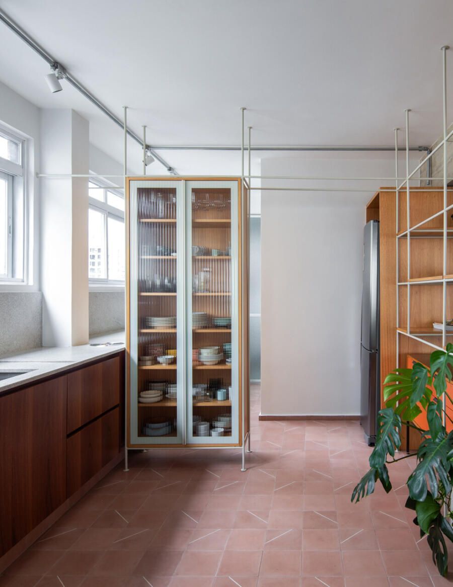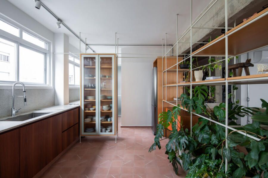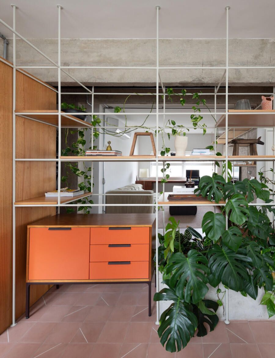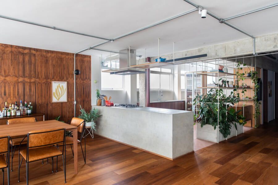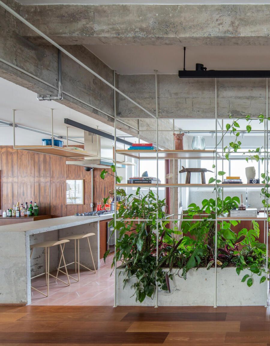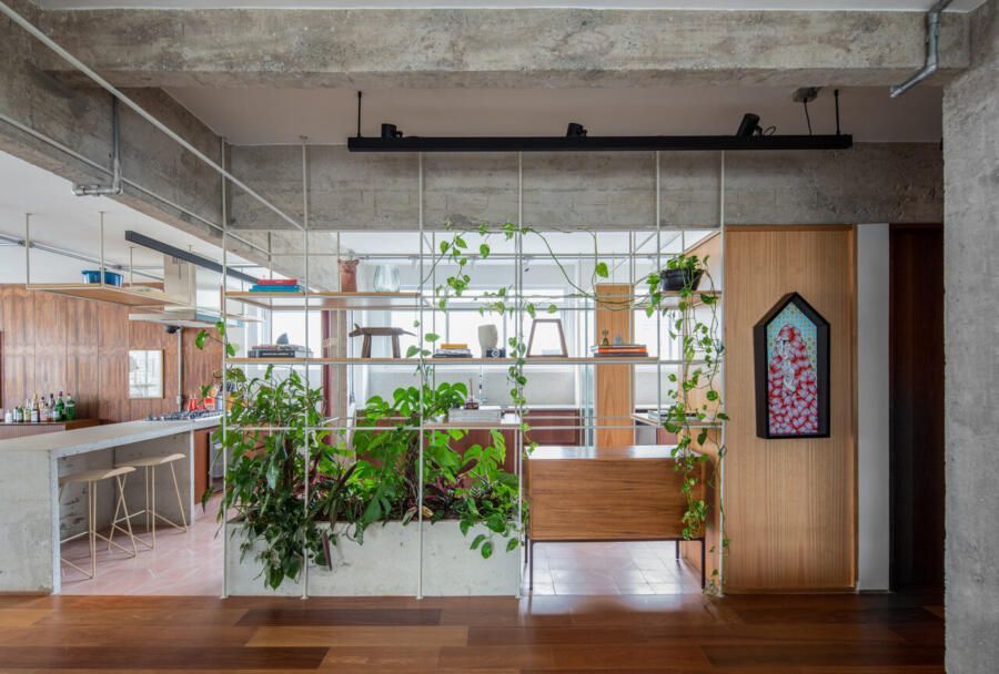 No lugar das antigas paredes da cozinha, uma solução inusitada e que une praticidade, estética e contato com a natureza: uma estante metálica branca com prateleiras de madeira, que delimita suavemente os espaços e serve como apoio para plantas pendentes, como jiboias e costelas-de-adão. No centro, uma floreira conectada à rede hidráulica garante irrigação contínua sem riscos de acúmulo de água.