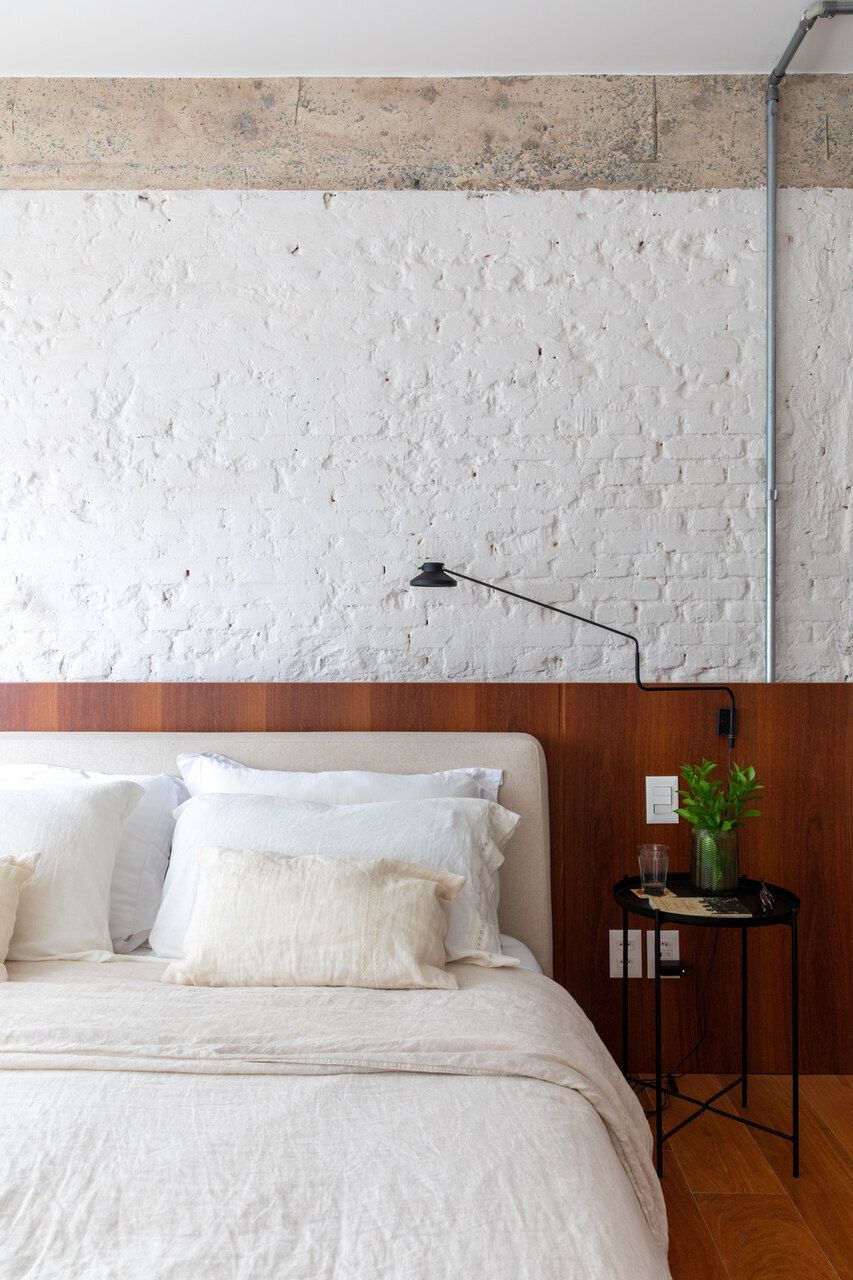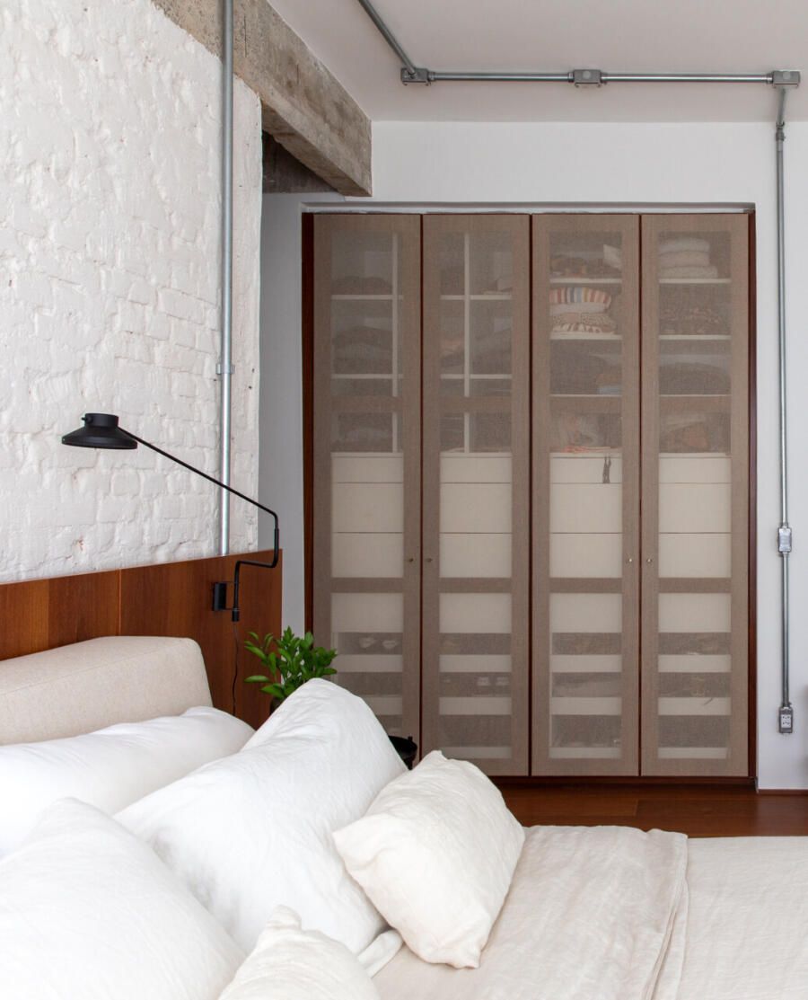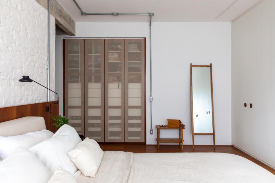 No quarto do casal, a combinação entre a parede de tijolinhos brancos e o armário com portas de talagarça, desenhado por Guilherme, cria um ambiente de intimidade e simplicidade sofisticada. A iluminação indireta, cuidadosamente distribuída, completa a atmosfera de calma e aconchego que marca todo o projeto.