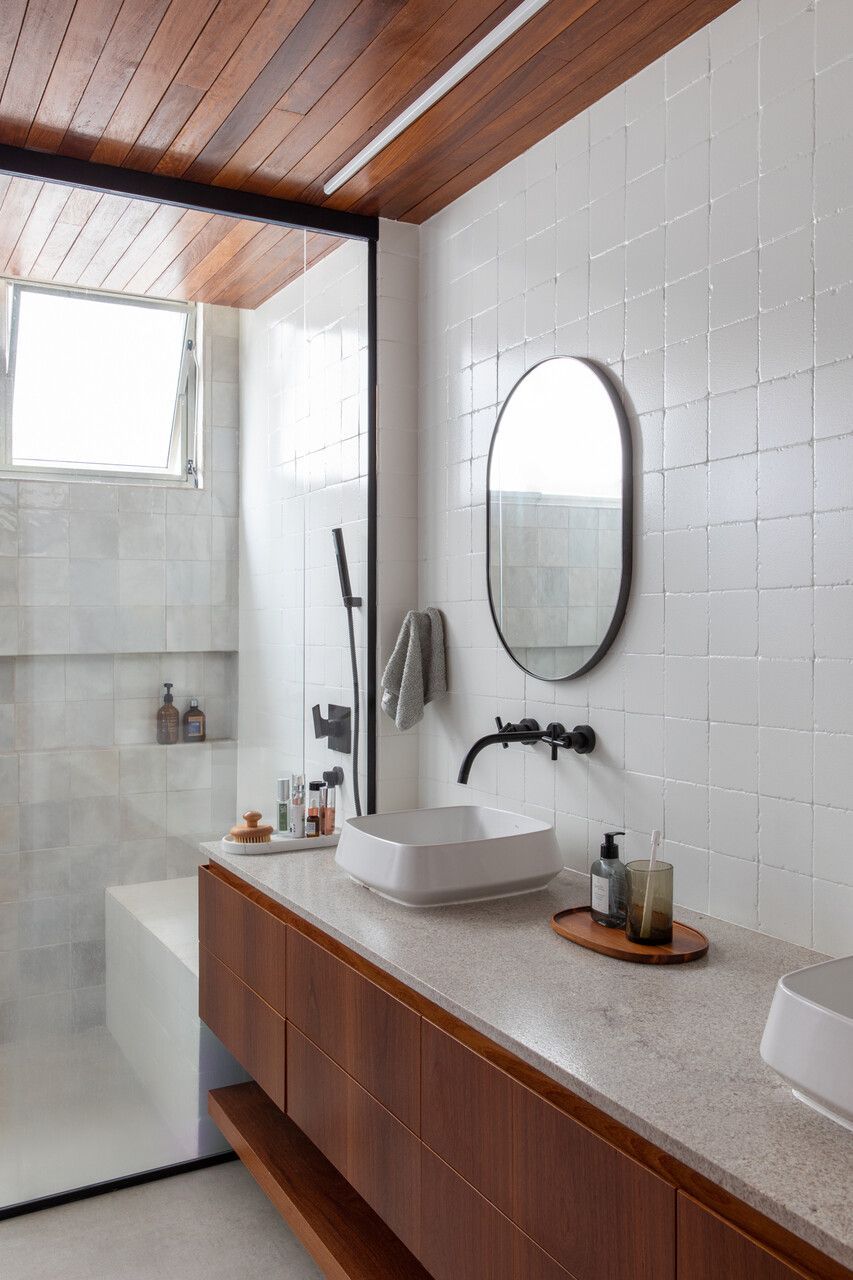A escolha dos materiais e texturas reforça a linguagem leve e orgânica do projeto. O piso de tábuas largas de cumaru percorre todos os cômodos, exceto a cozinha, onde ladrilhos hidráulicos garantem personalidade, e os banheiros, que recebem porcelanato cinza. Na sala de estar, uma parede revestida com réguas de concreto confere textura e profundidade, enquanto o jacarandá na sala de jantar traz calor e memória.
