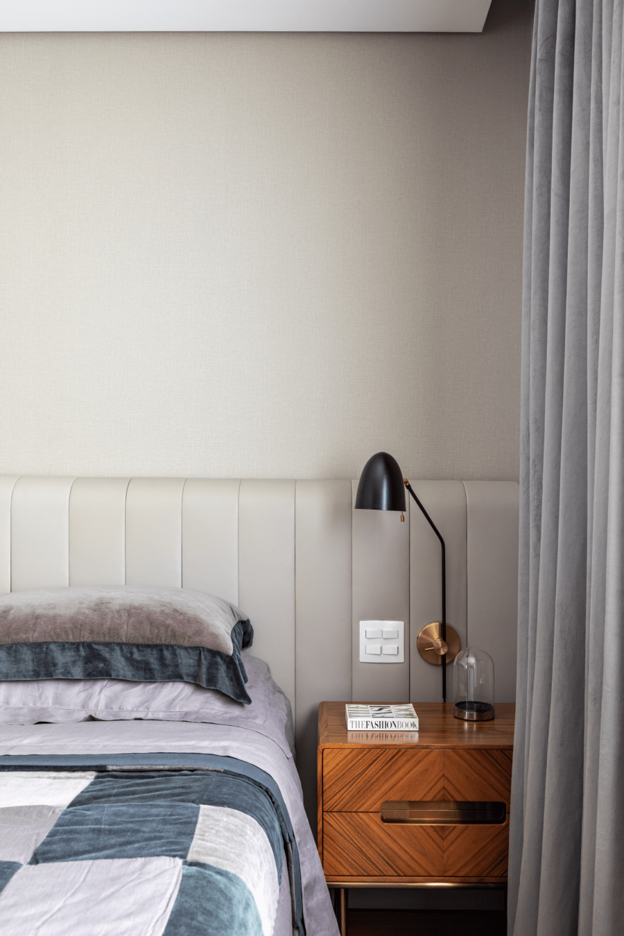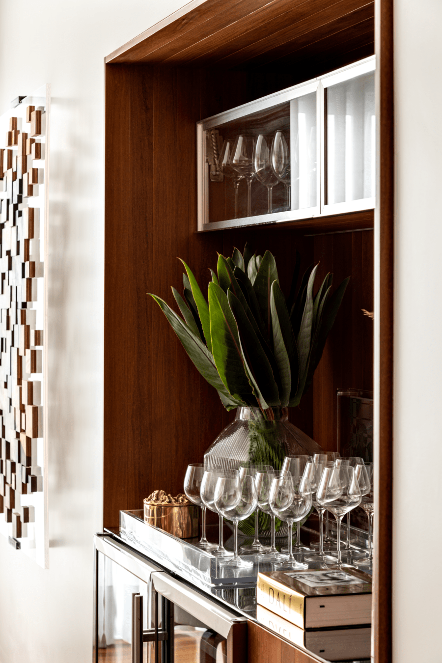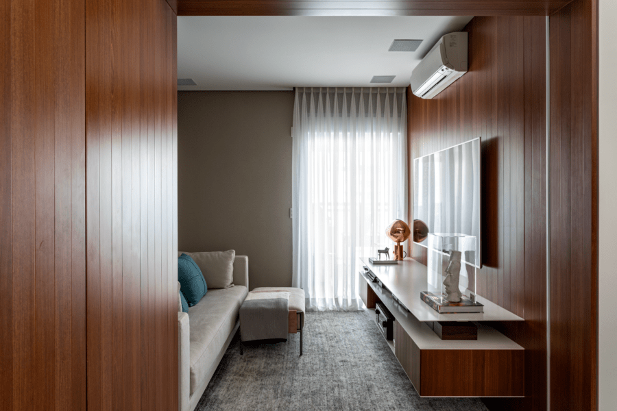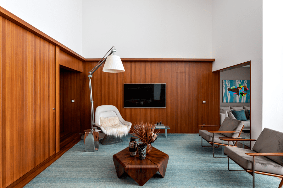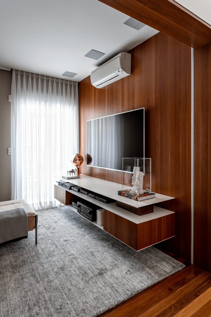 “Foi difícil trazer aconchego para a enorme área com pé direito duplo, mas com precisão e cuidado na dosagem, conseguimos tornar a madeira a protagonista da estrutura, e grande responsável pelas demais escolhas de arquitetura de interiores e decoração. ‘Vestir’ o apartamento com madeira natural de forma equilibrada e sem exageros trouxe ares de casa e afastou qualquer risco do projeto ficar impessoal.”