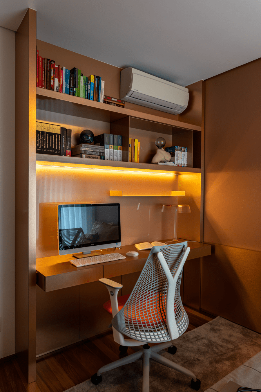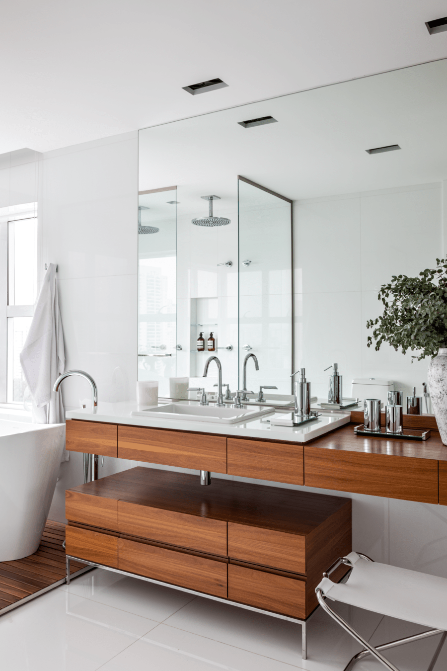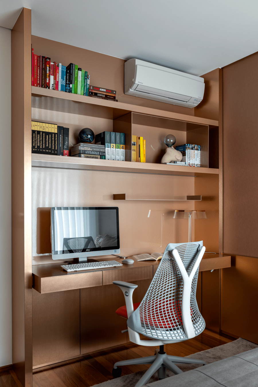“Foi difícil trazer aconchego para a enorme área com pé direito duplo, mas com precisão e cuidado na dosagem, conseguimos tornar a madeira a protagonista da estrutura, e grande responsável pelas demais escolhas de arquitetura de interiores e decoração. ‘Vestir’ o apartamento com madeira natural de forma equilibrada e sem exageros trouxe ares de casa e afastou qualquer risco do projeto ficar impessoal.”