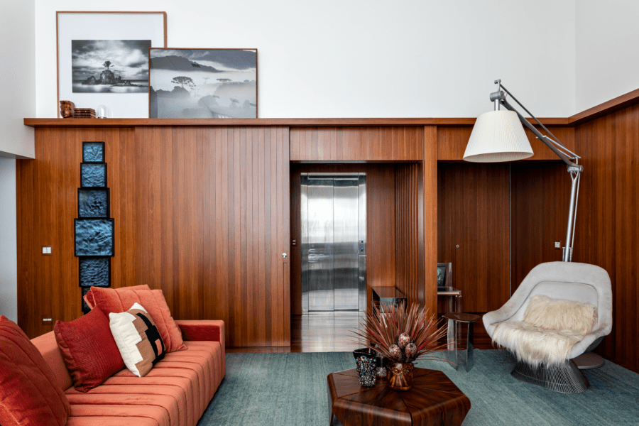Apartamento com pé direito duplo de quase 6 metros e hall revestido por madeira