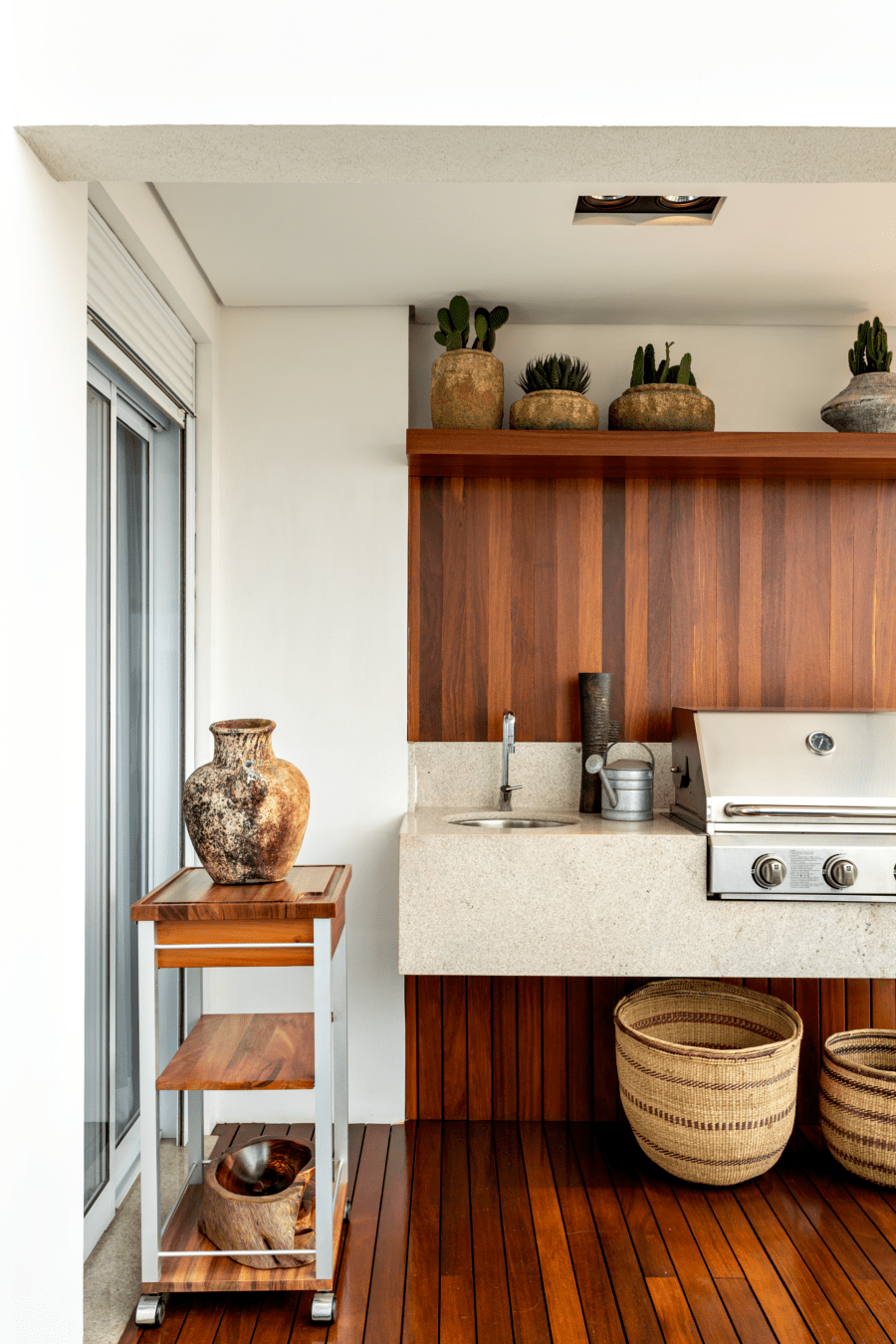 “O hall social é inteiramente revestido pela madeira Cumaru, e conta com uma pérgola no teto que se desdobra em elemento vazado junto do acesso ao lavabo. A ideia, além de engenhosa, permite um respiro eliminando a eventual sensação claustrofóbica do pequeno espaço. Ao abrir a porta de correr, a sensação ao se deparar com a amplitude do espaço e os contrastes do living causa surpresa a quem chega.”