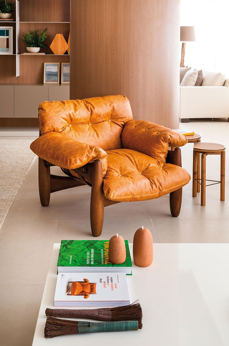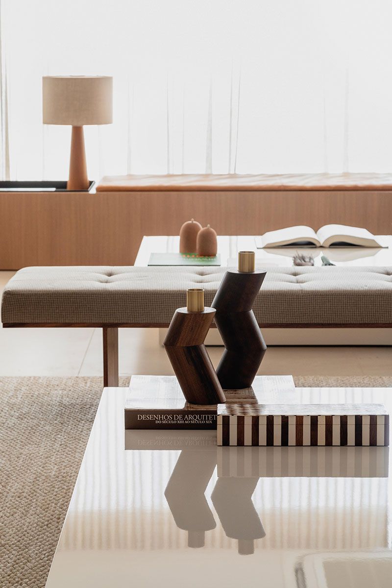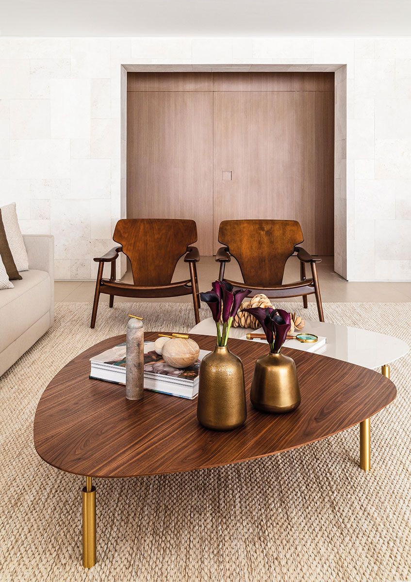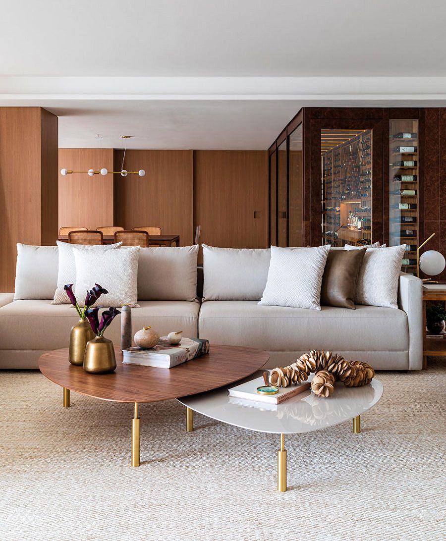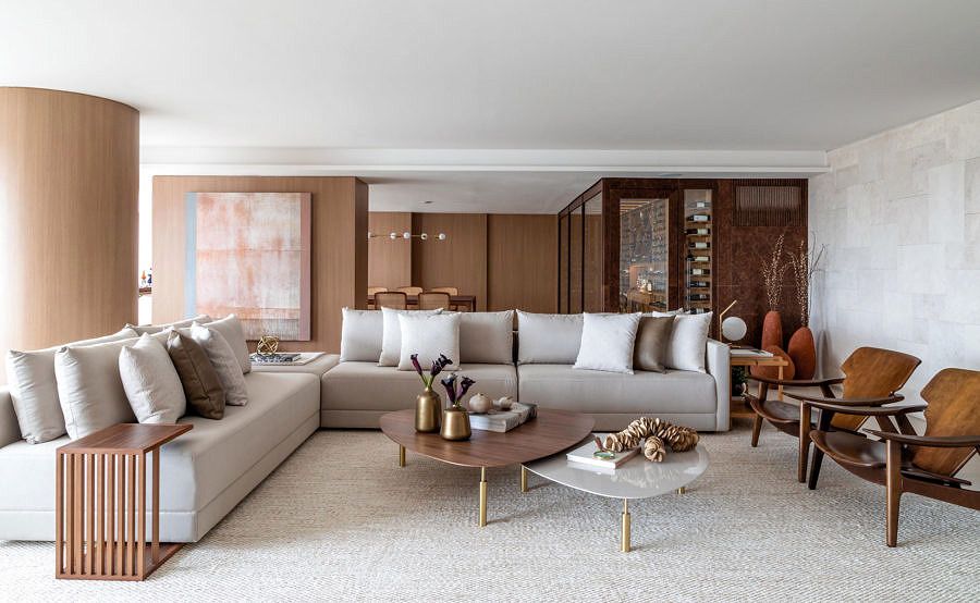 A paleta de cores transita pelo bege e o marrom e mescla textura como no porcelanato do piso, nos mosaicos do mármore e no mobiliário. O jogo dos sofás em “L” proporciona conversas através da composição com as poltronas e o banco.