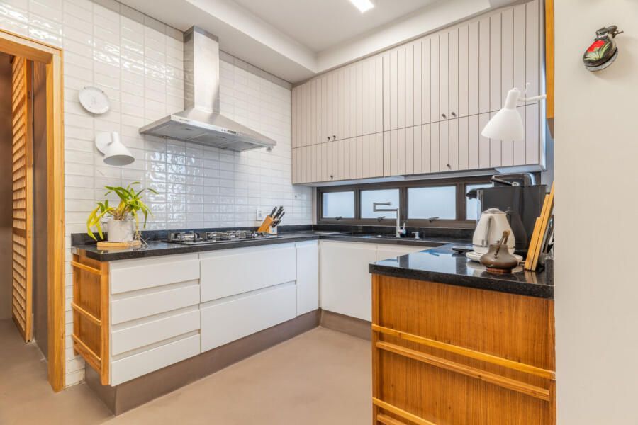 Já a cozinha original era funcional, porém destoava do estilo imaginado para o projeto. As intervenções foram pontuais, mas transformadoras. Portas em lambril nude substituíram o vidro leitoso; os puxadores de alumínio foram trocados, o porcelanato polido deu lugar ao microcimento acetinado, mais quente ao olhar, e o revestimento estampado foi coberto por uma cerâmica artesanal clara. A iluminação também ganhou novas possibilidades, com destaque para as arandelas sobre a bancada. Pequenas decisões que renovam por completo a experiência do ambiente.