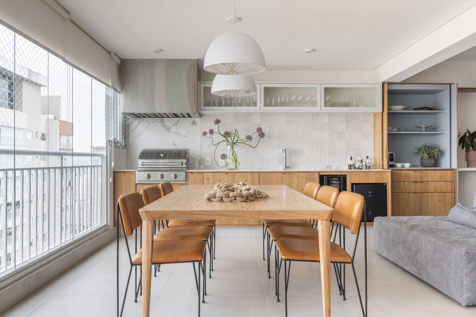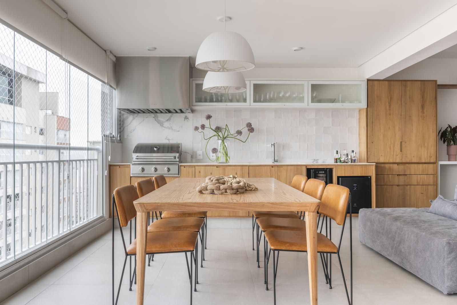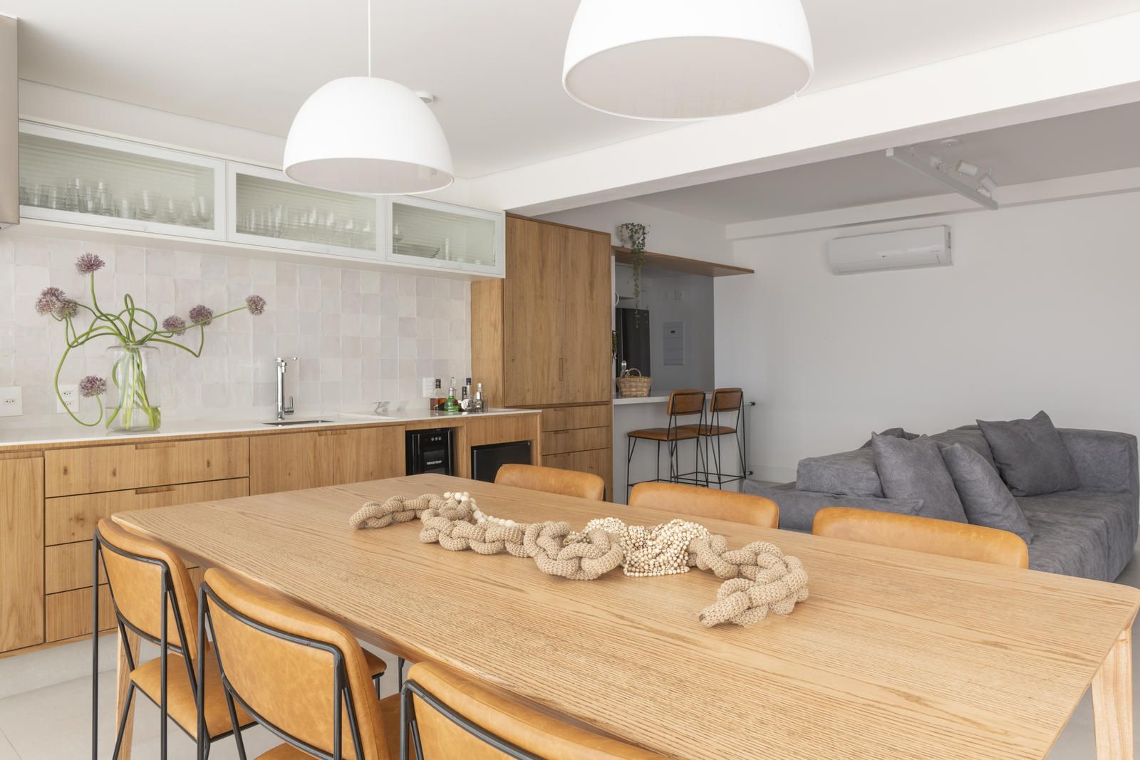 “Integramos a sala com a varanda e também a cozinha. Com a amplitude ganha, organizamos os usos de jantar e sofá em um trecho mais central, liberando as laterais para os demais usos desejados.”