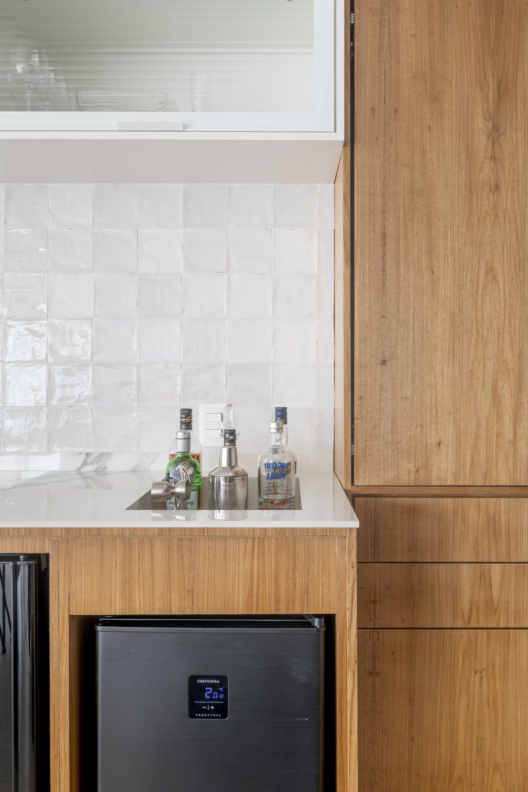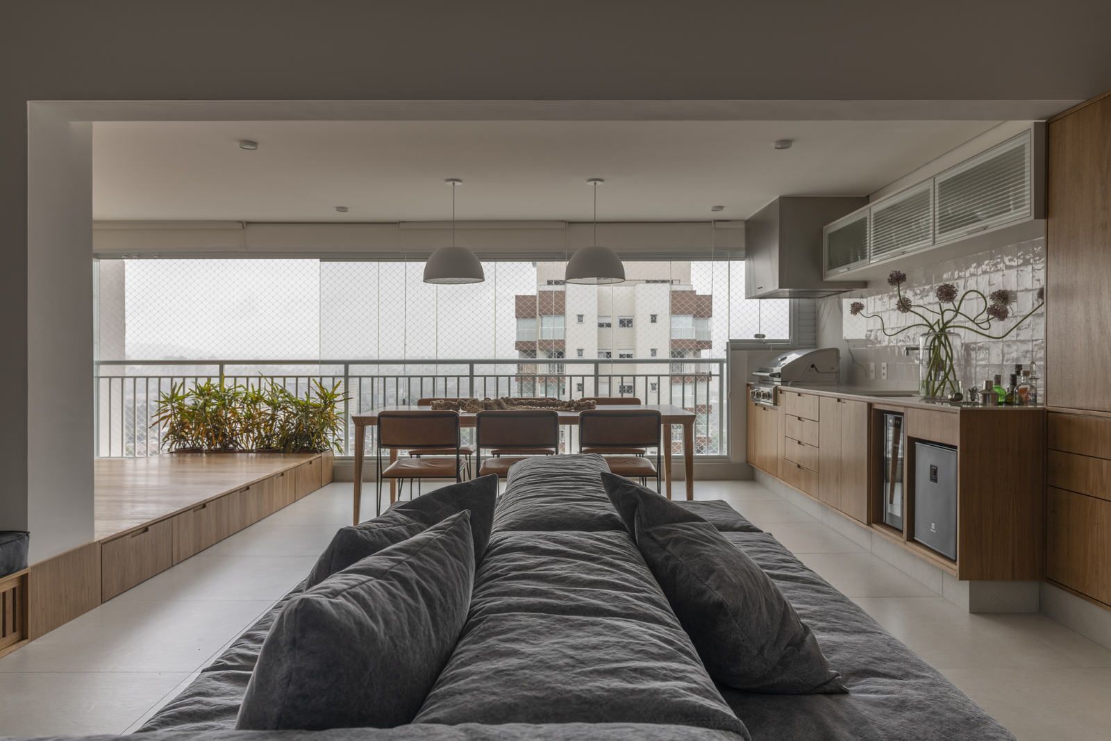“O balcão americano que integra a cozinha se estende até as janelas, criando uma linha multifuncional, com cristaleira, bancada de apoio, churrasqueira a gás e marcenarias que ajudam os moradores a terem uma facilidade de organização, de forma bem setorizada e intuitiva. Na outra face, esquerda à sala, desenhamos uma grande marcenaria que mais uma vez cumpre com muitas funções e compõe volumes importantes para a sensação de conforto da sala. Com bastante madeira aparente em carvalho americano e trechos de serralheria, esse grande volume ajuda a criar um espaço permeável para a área de trabalho, sem que este seja um ambiente fechado em si, podendo estar integrado à sala ao mesmo tempo que é reservado. Essa estante que desenha o espaço interno do escritório é, em sua face voltada para sala, também chapelaria -organizando a entrada- e painel da TV. Seguindo o mesmo desenho e alinhamentos, ela se estende para a varanda, criando um grande tablado para servir como brinquedoteca para as crianças e também como espaço para práticas de yoga e leitura dos pais.”